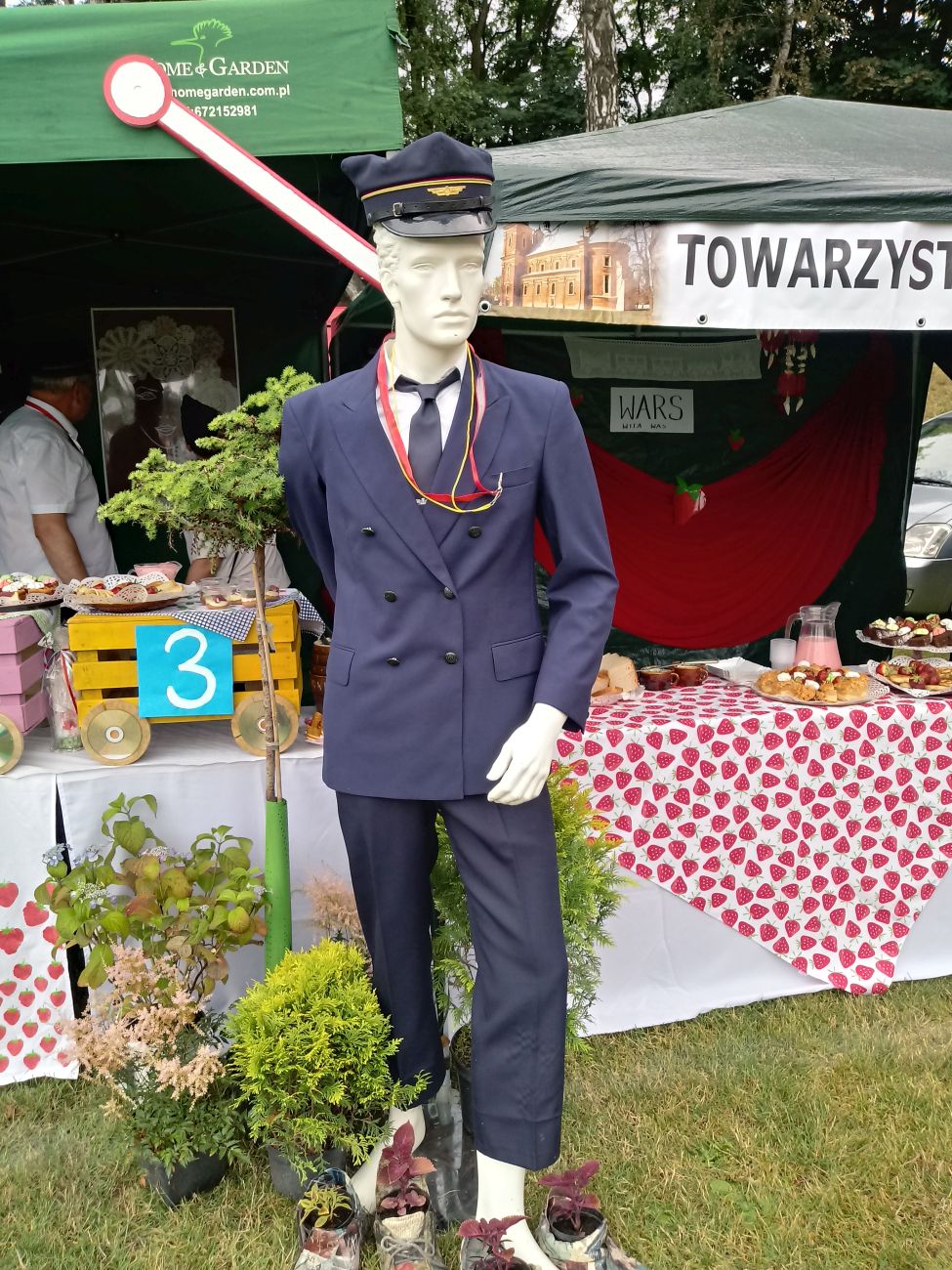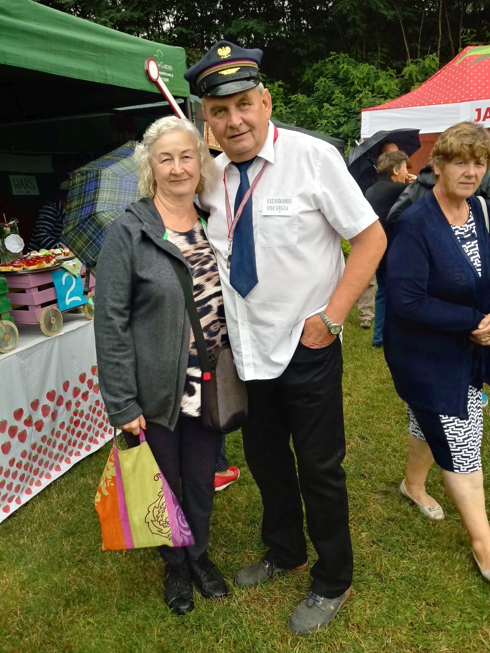 W centralnym punkcie naszego stoiska stanął kolorowy pociąg z trzema wagonami, wiozącymi truskawkowe smakołyki. Dyżurny ruchu pilnował porządku, tylko biedak niezdecydowany bardzo: dwie pary butów koło niego stały, a on boso, bo wybrać nie umiał. W przygotowanej poczekalni podróżni mogli schronić się przed deszczem, odpocząć, porozmawiać…. W przedziale WARS czekały przygotowane dania - każdy znalazł coś dla siebie.