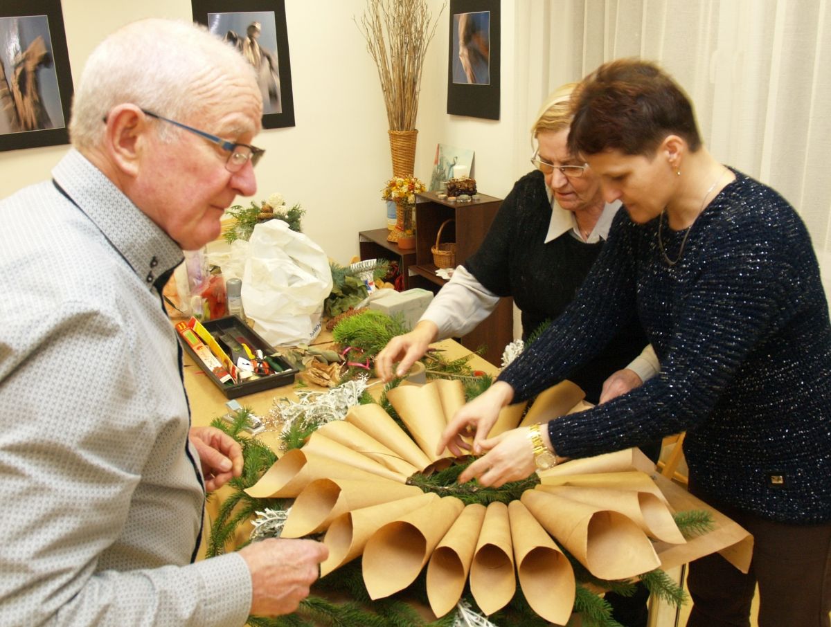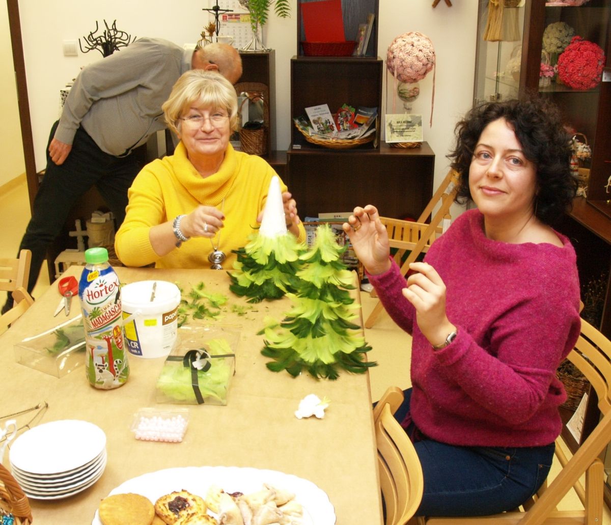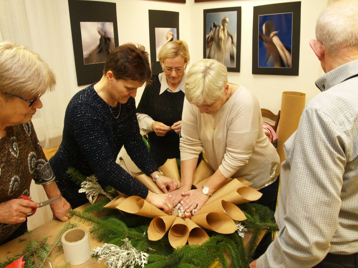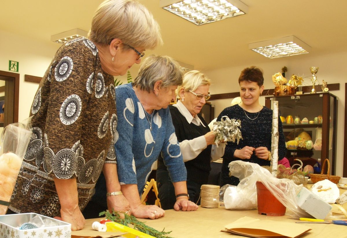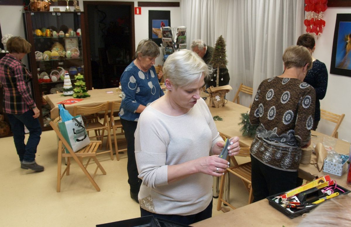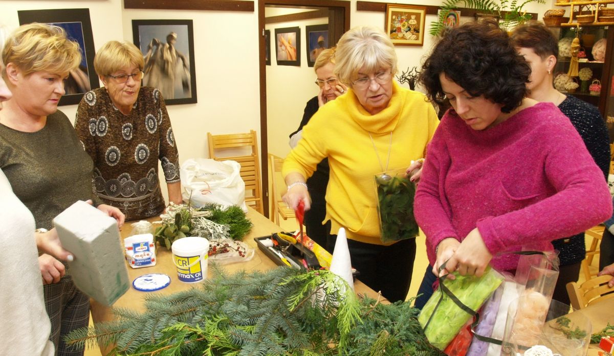Od pięciu lat, co roku w każdy pierwszy wtorek grudnia, Towarzystwo Przyjaciół Gołębia jest organizatorem warsztatów dekoracji świątecznych w Izbie Produktu Lokalnego. Tak było i tym razem. Dnia 3 grudnia członkowie Towarzystwa wykonywali ozdoby choinkowe, stroiki na stół, wianki adwentowe i inne „cudeńka”. Zajęcia poprowadziły utalentowane plastycznie: Agnieszka Capała i Dorota Skibińska. One też przygotowały dla wszystkich niezbędne materiały potrzebne do pracy twórczej. Ochota, podekscytowanie i zaangażowanie w tworzeniu tych „dzieł” skromnych, acz cieszących oko, przeplatały się z żywicznym zapachem gałązek i wesołym śmiechem uczestników warsztatów.