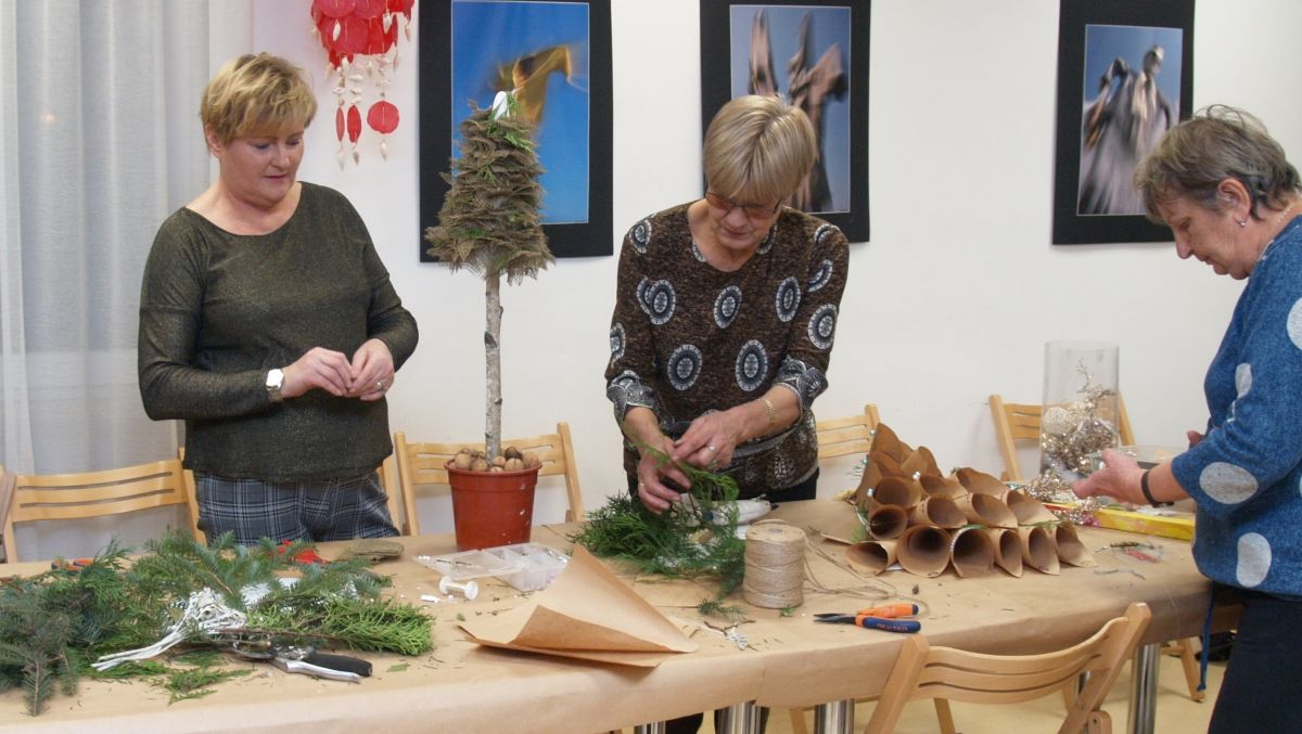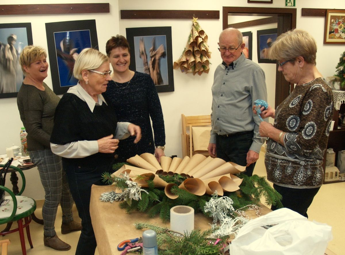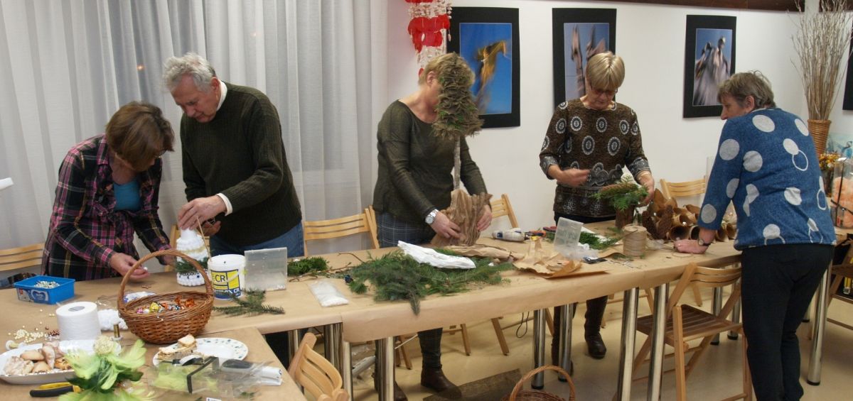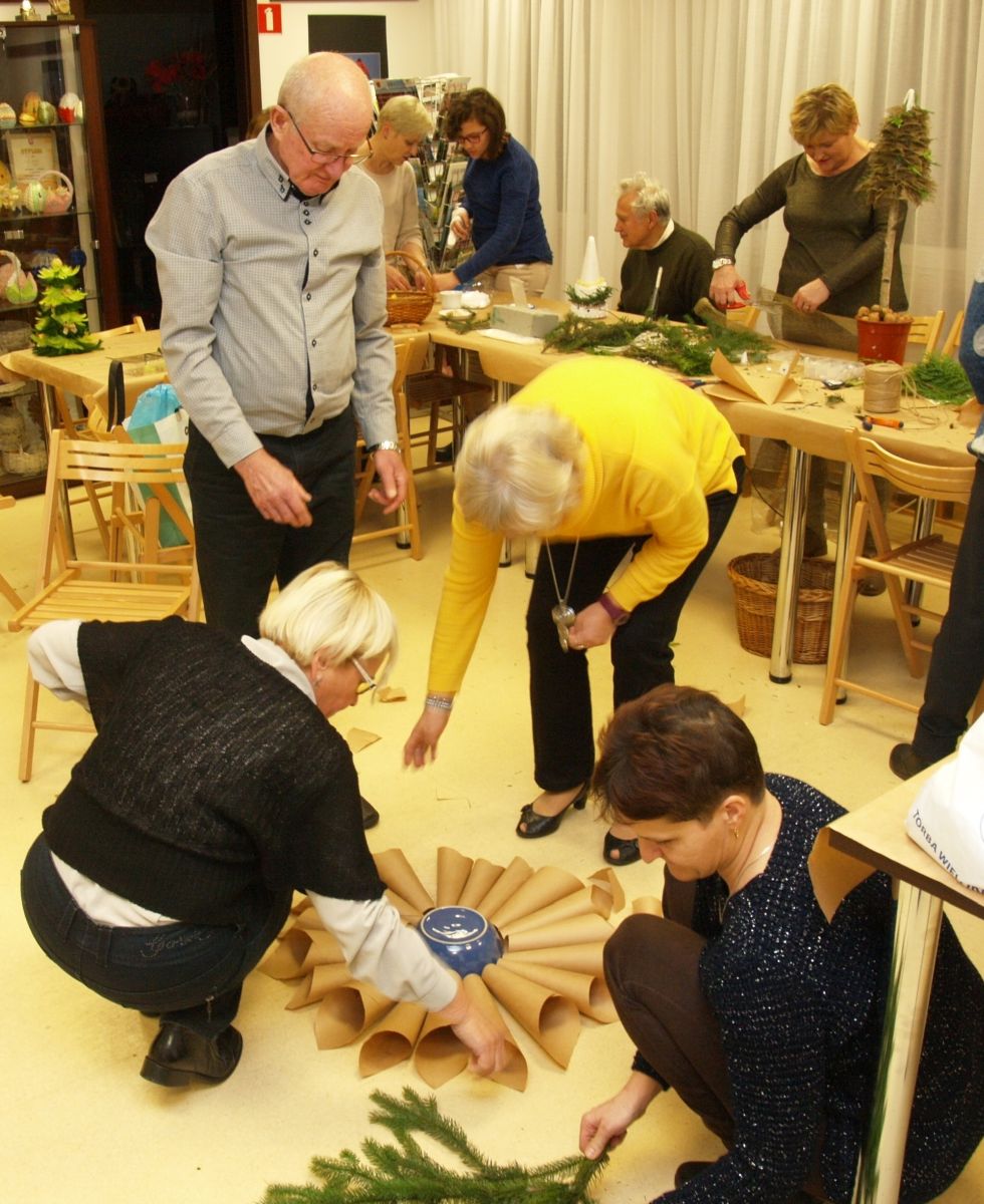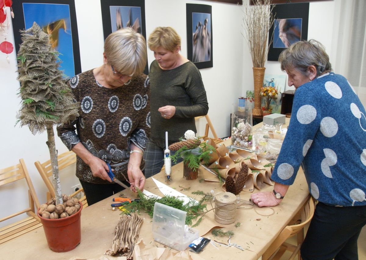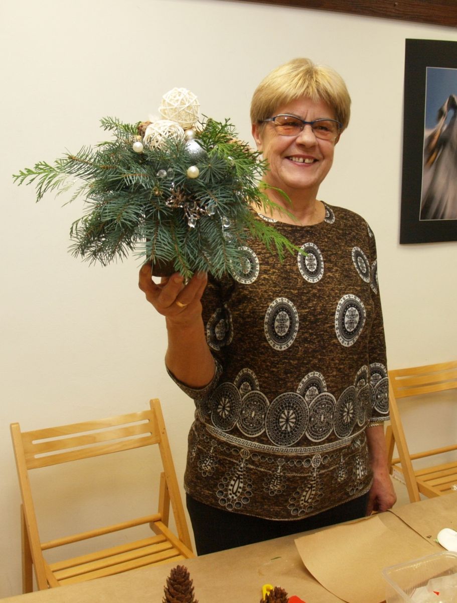 Od pięciu lat, co roku w każdy pierwszy wtorek grudnia, Towarzystwo Przyjaciół Gołębia jest organizatorem warsztatów dekoracji świątecznych w Izbie Produktu Lokalnego. Tak było i tym razem. Dnia 3 grudnia członkowie Towarzystwa wykonywali ozdoby choinkowe, stroiki na stół, wianki adwentowe i inne „cudeńka”. Zajęcia poprowadziły utalentowane plastycznie: Agnieszka Capała i Dorota Skibińska. One też przygotowały dla wszystkich niezbędne materiały potrzebne do pracy twórczej. Ochota, podekscytowanie i zaangażowanie w tworzeniu tych „dzieł” skromnych, acz cieszących oko, przeplatały się z żywicznym zapachem gałązek i wesołym śmiechem uczestników warsztatów.