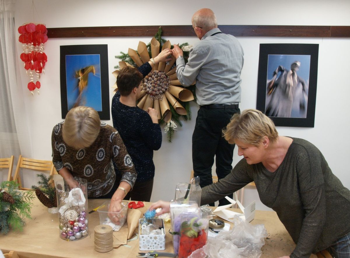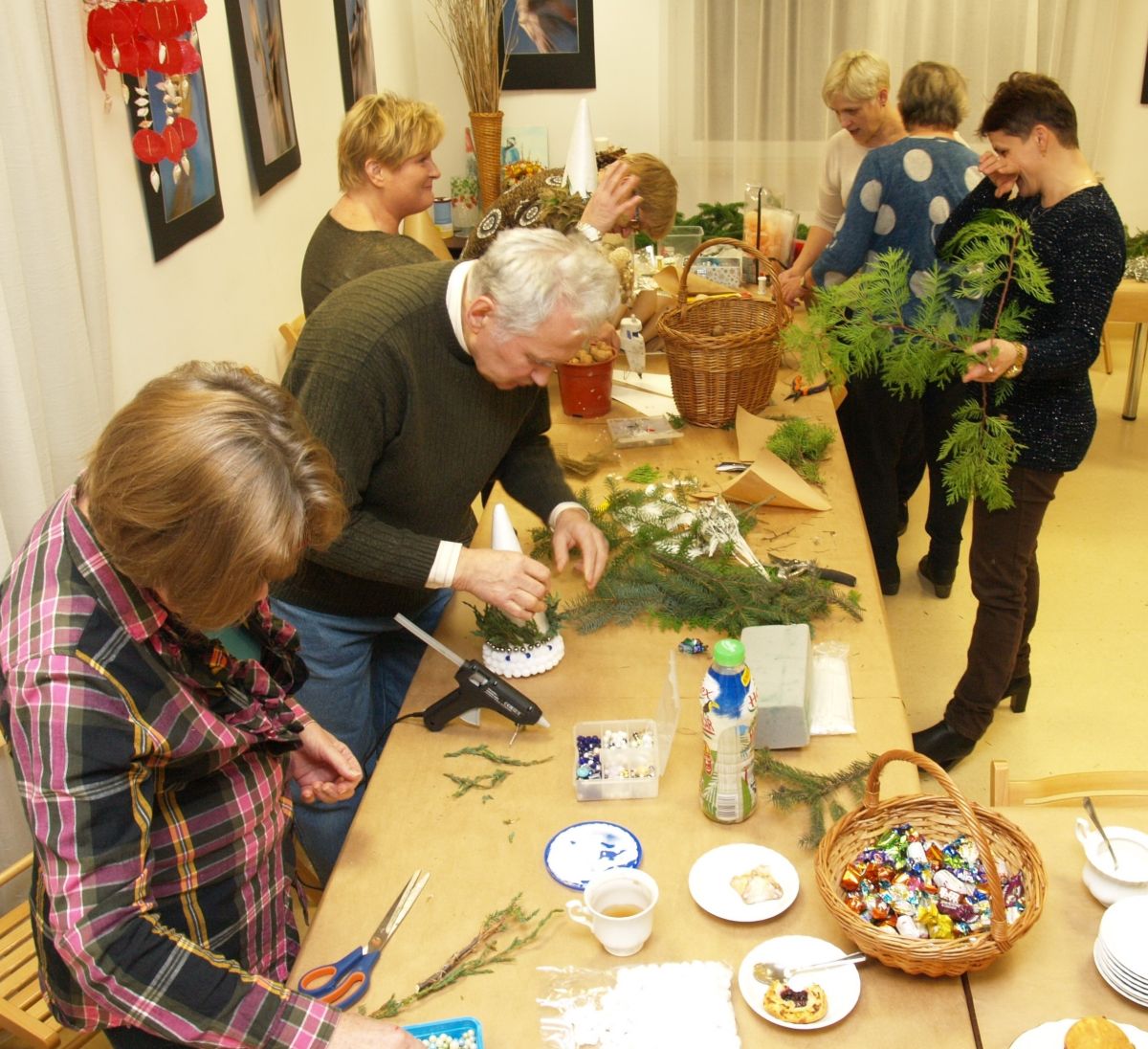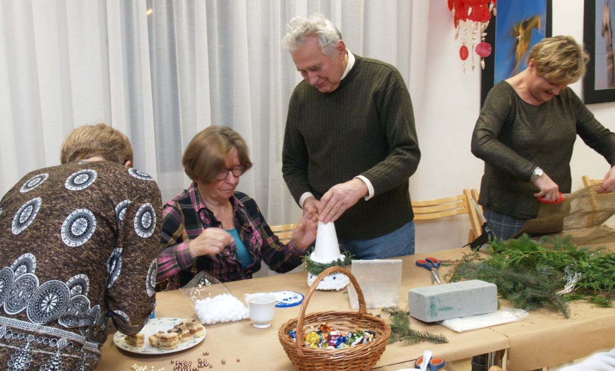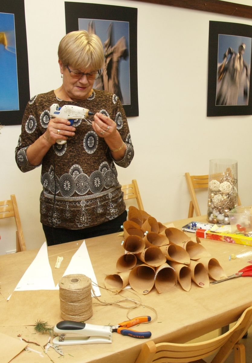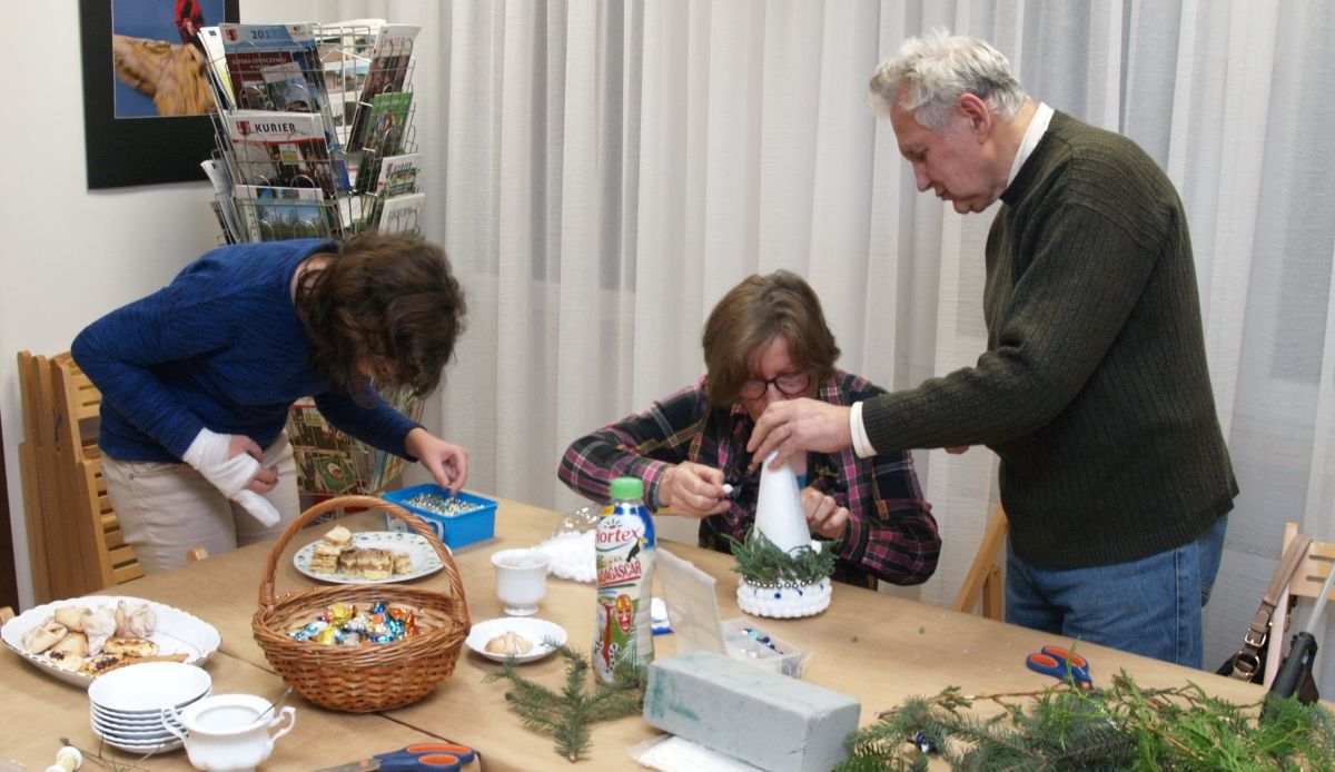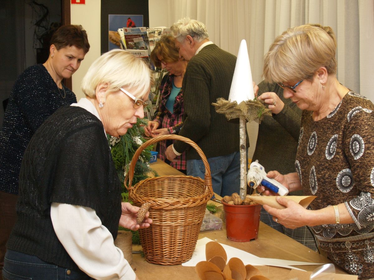 Od pięciu lat, co roku w każdy pierwszy wtorek grudnia, Towarzystwo Przyjaciół Gołębia jest organizatorem warsztatów dekoracji świątecznych w Izbie Produktu Lokalnego. Tak było i tym razem. Dnia 3 grudnia członkowie Towarzystwa wykonywali ozdoby choinkowe, stroiki na stół, wianki adwentowe i inne „cudeńka”. Zajęcia poprowadziły utalentowane plastycznie: Agnieszka Capała i Dorota Skibińska. One też przygotowały dla wszystkich niezbędne materiały potrzebne do pracy twórczej. Ochota, podekscytowanie i zaangażowanie w tworzeniu tych „dzieł” skromnych, acz cieszących oko, przeplatały się z żywicznym zapachem gałązek i wesołym śmiechem uczestników warsztatów.