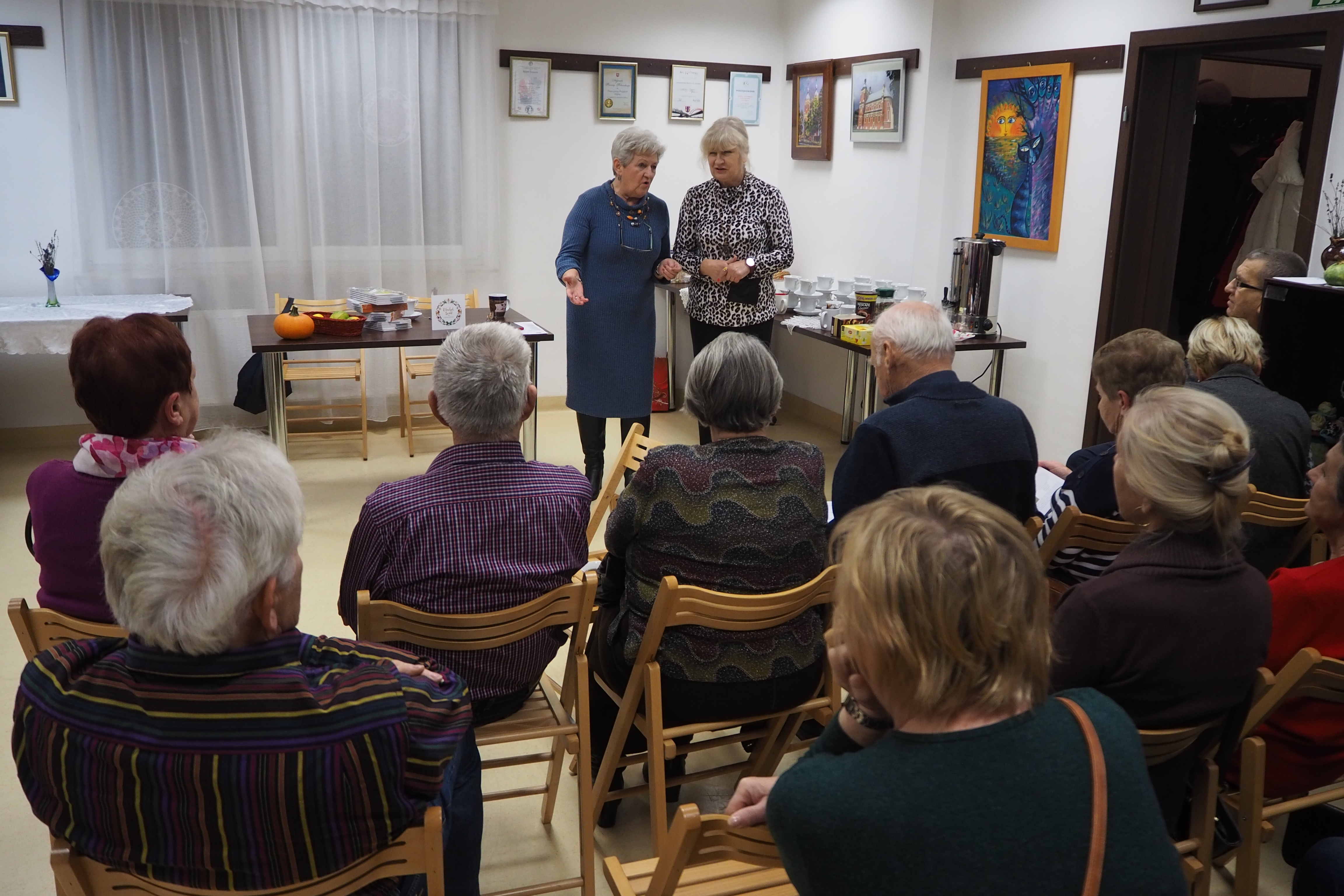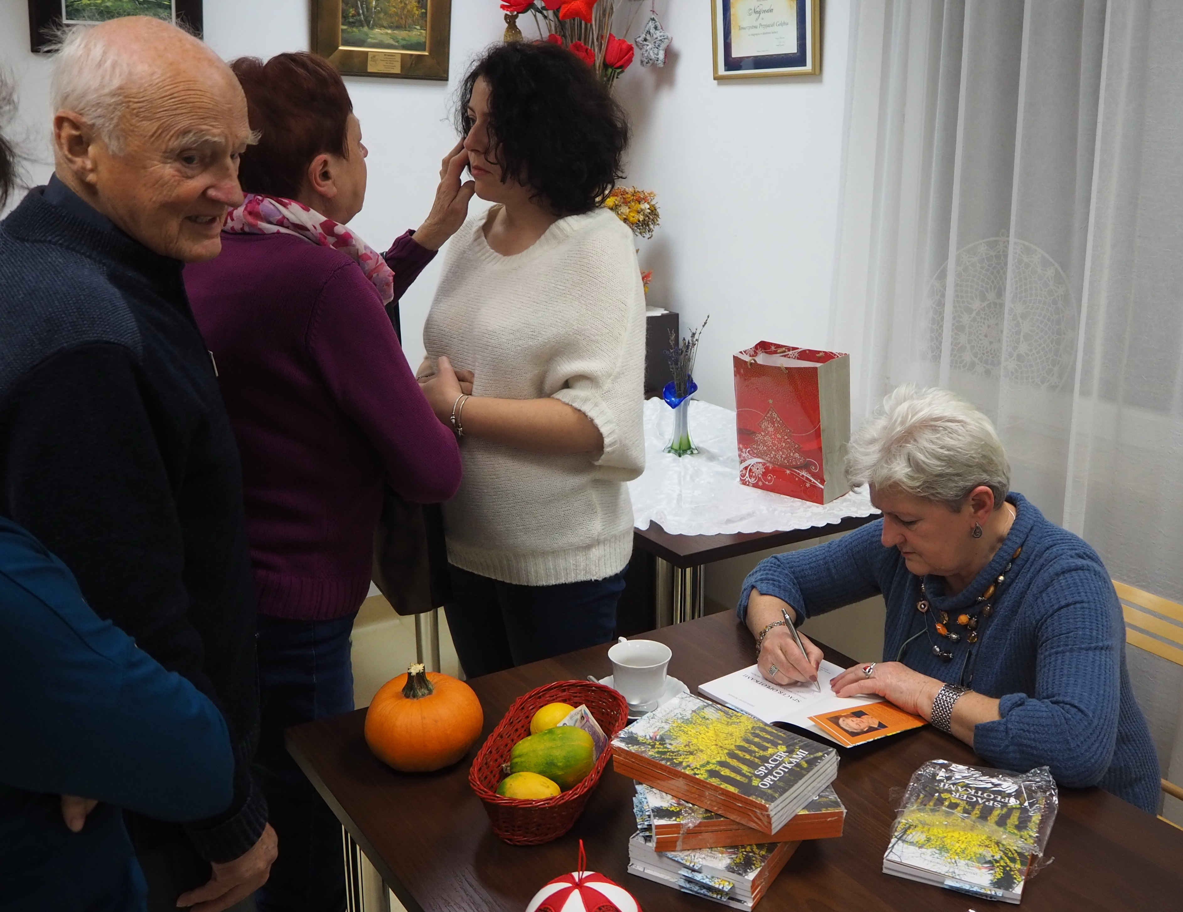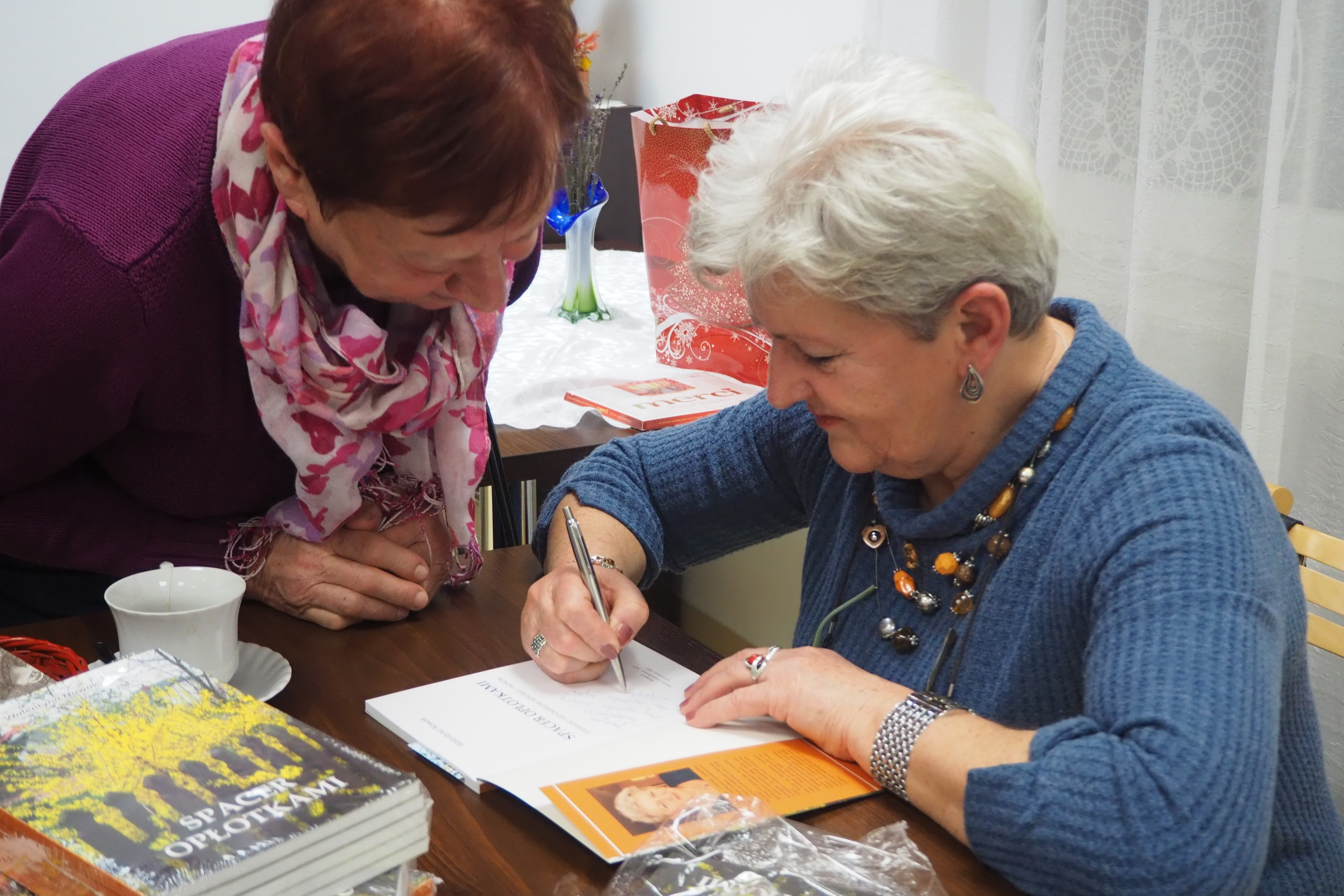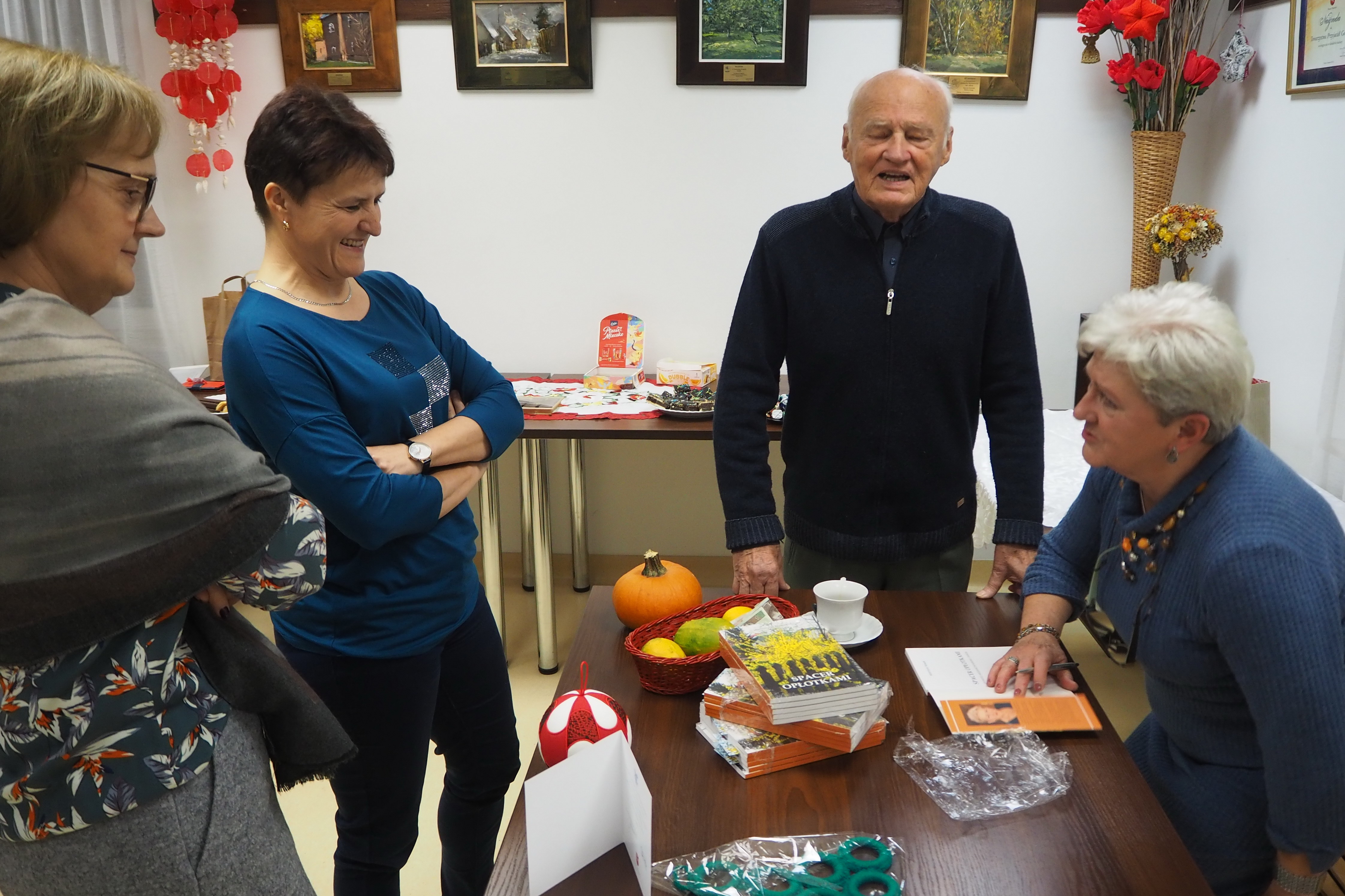 Póki wśród nas są pasjonaci regionalizmu, tacy którzy „ciułają” w pamięci lub notują zdarzenia albo ciekawe historie rodzimych miejscowości, dopóty wciąż trwają dzieje mimo nieustannie zachodzących zmian. Taką „zbieraczką” przeszłości jest Pani Walentyna Nowak, autorka książki „Spacer opłotkami”, mieszkanka i rodaczka Skoków, jednocześnie Prezes Stowarzyszenia Kobiet Aktywnych. Z jej inicjatywy doszło do wydania interesujących treści o historycznej miejscowości Skoki, niegdyś wsi królewskiej. Książka powstała w oparciu o wywiady z miejscowymi ludźmi ( z Borowej i Skoków) oraz wspomnienia o czasach, które pamięta sama autorka. Pani Walentyna gościła 6 grudnia bieżącego roku w Izbie Produktu Lokalnego, żeby promować wydanie książki wśród mieszkańców Gołębia. Uczestnicy spotkania mogli się dowiedzieć o inspiracjach Pani Walentyny, o powstawaniu materiału do książki oraz poznać nazwiska ludzi współuczestniczących w tworzeniu treści i okładek publikacji. Na koniec spotkania każdy mógł otrzymać egzemplarz wraz z dedykacją autorki. Ważne jednak jest to, że ciekawie zaprezentowane rozdziały, stare fotografie i wiersze miejscowej poetki - Pani Zofii Kurpiel - zachęcają do lektury. Materiał zaprezentowany w publikacji dowodzi, że autorka i współautorzy są bardzo przywiązani do swojej Małej Ojczyzny i pięknie budują relacje społeczne w swojej wspólnocie. Książka skłania wszystkich do refleksji, że właśnie najbliższe człowiekowi miejsce życia daje poczucie radości, ładu, harmonii i szczęścia.