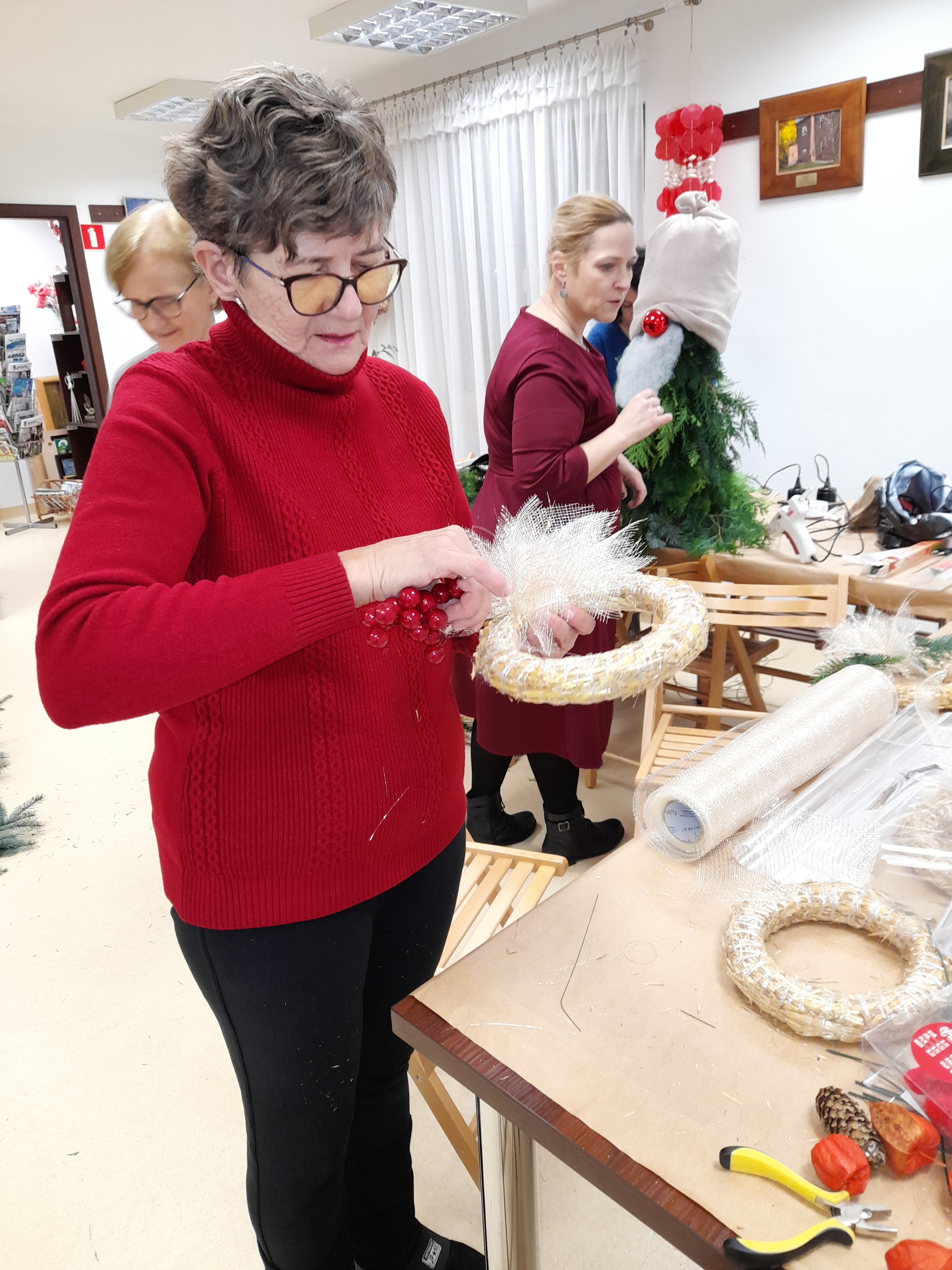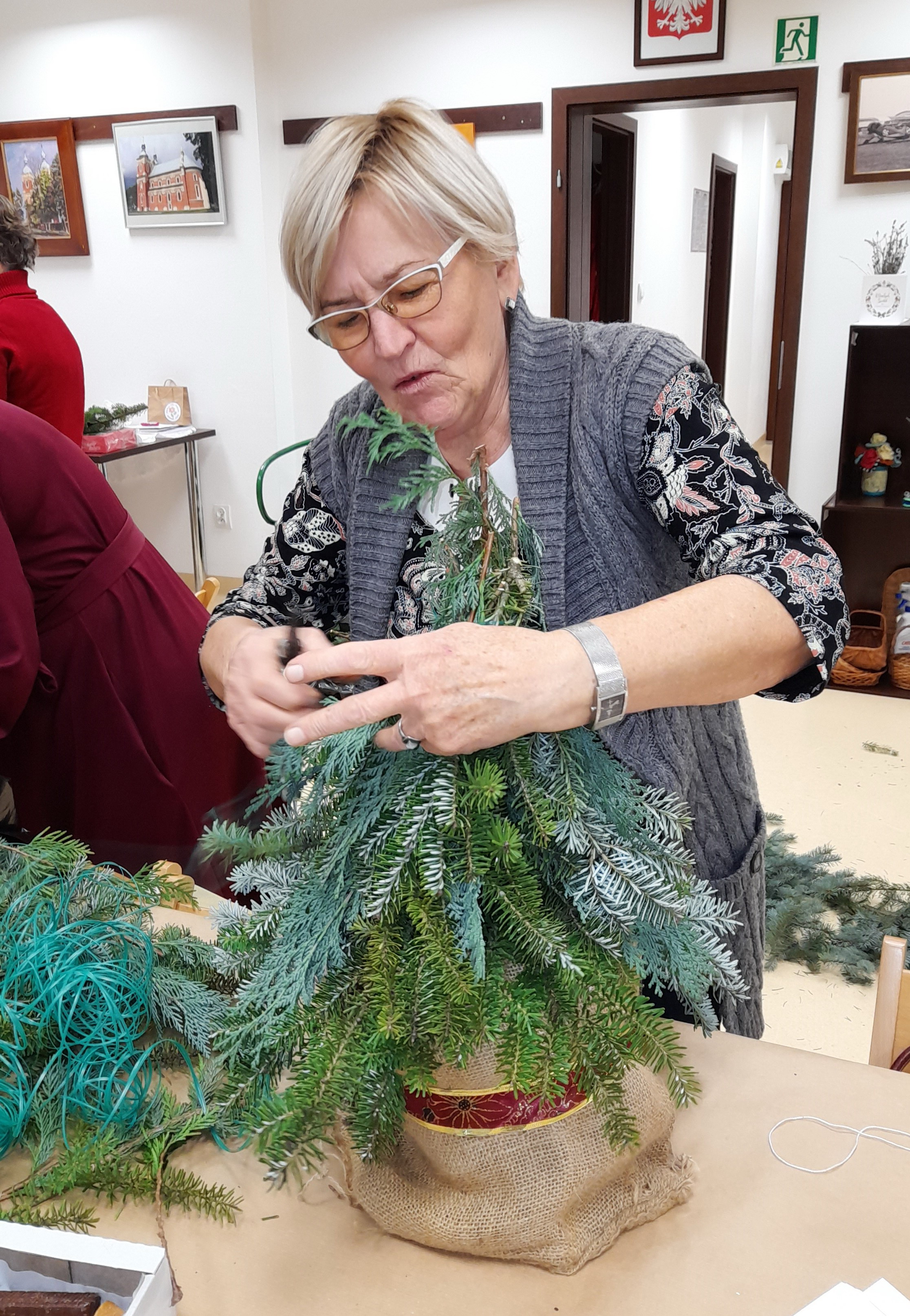 Zawitała prawdziwa zima. Pada śnieg. Jest bardzo zimno, mróz. Mimo to, spotkaliśmy się we wtorkowe popołudnie 13 grudnia „pamiętna data”, żeby tworzyć ozdoby świąteczne pod czujnym okiem Pani Doroty Skibińskiej. Pachniało świeżą choinką i zbliżającymi się świętami. Robiliśmy stroiki świąteczne, wianki na drzwi i skrzaty. Udekorowaliśmy Izbę Produktu Lokalnego świątecznymi dekoracjami. Było dużo zabawy i radości. Izbę wypełniał gwar i świąteczny nastrój. Uczestnicy warsztatów zabrali swoje „dzieła” do domu.