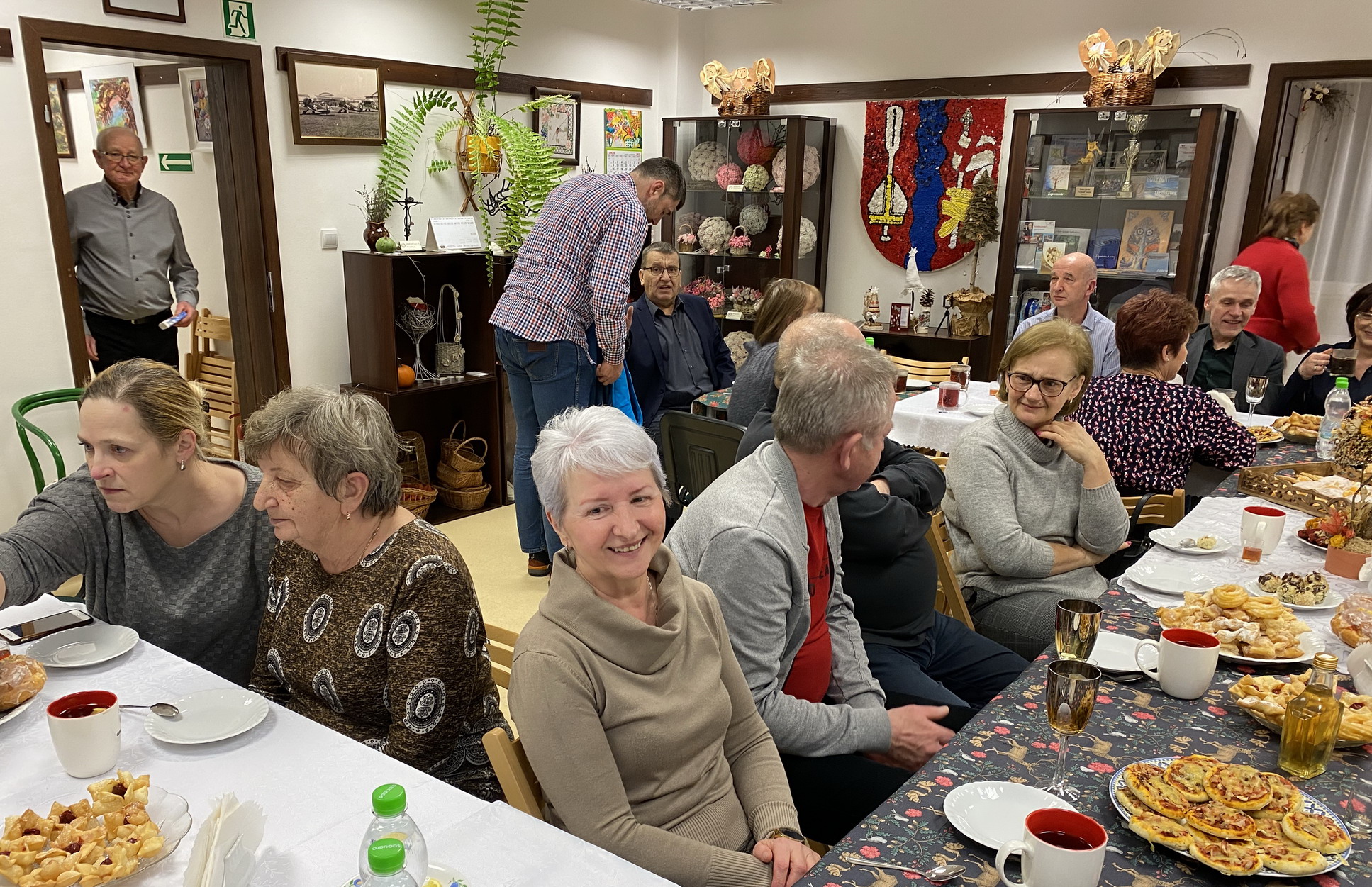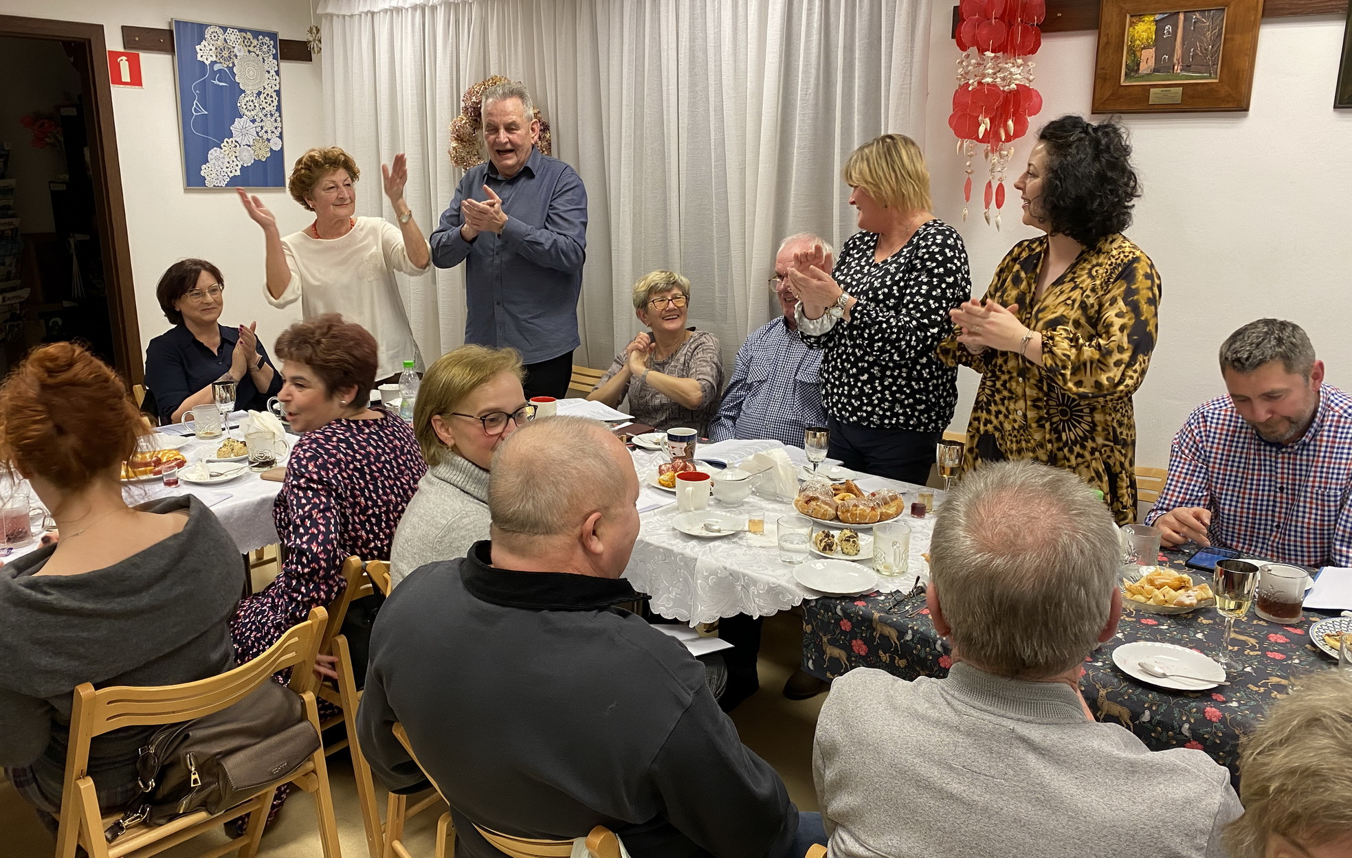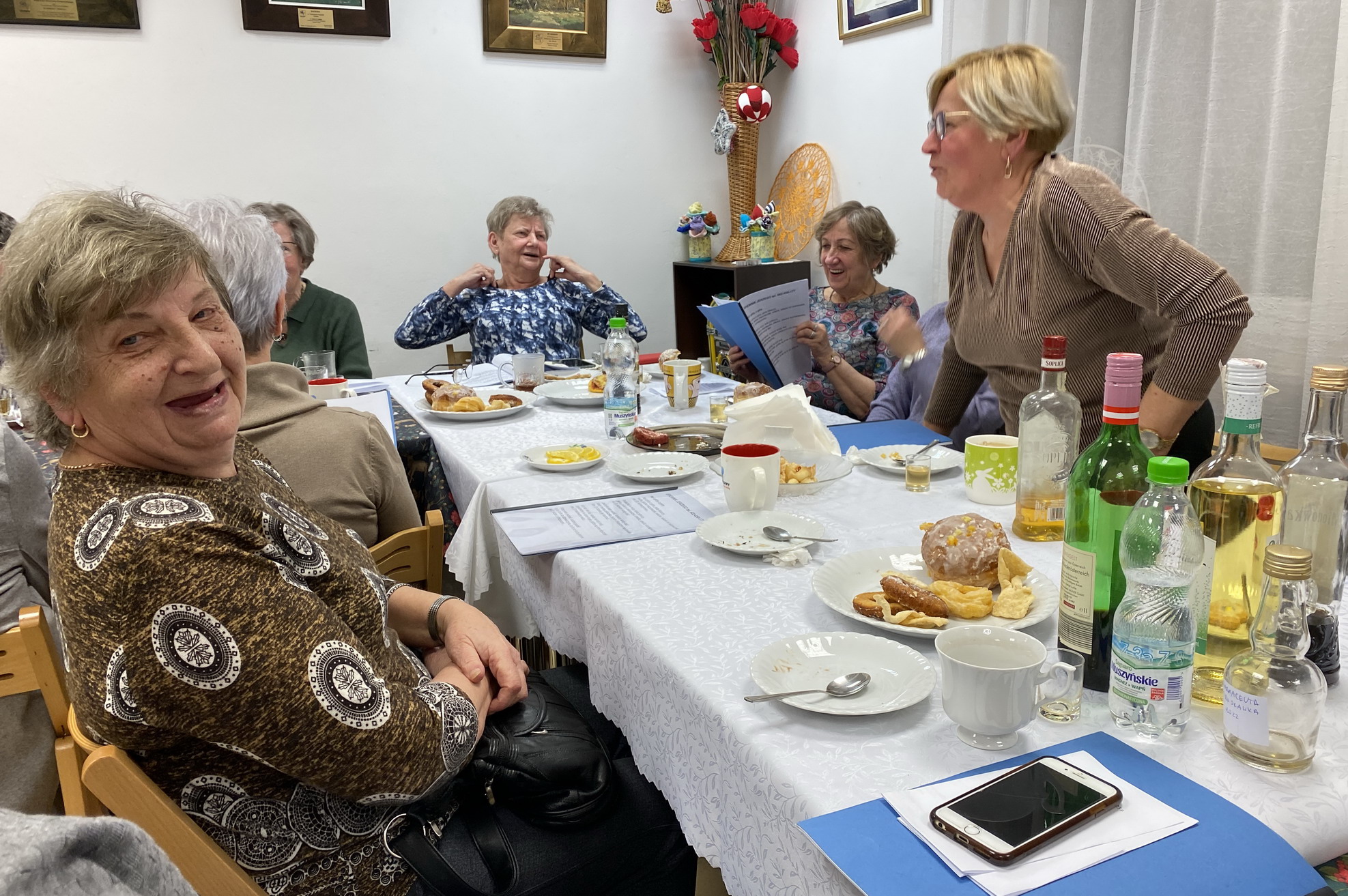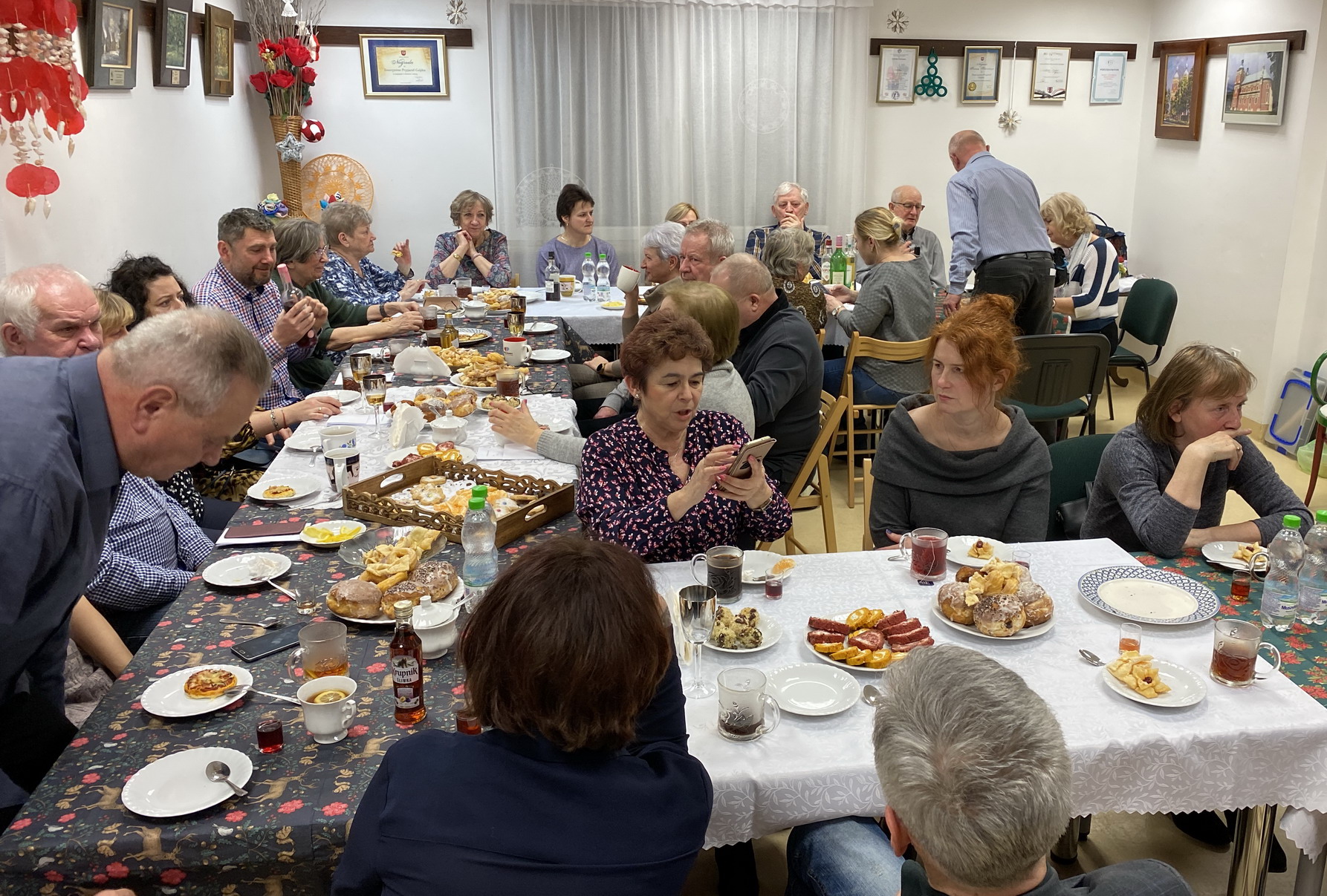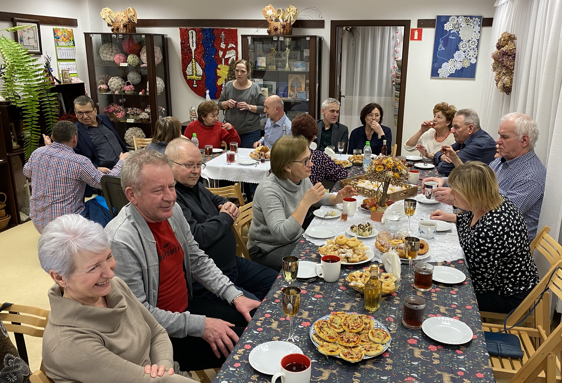 Tłusty czwartek to ostatni czwartek przed wielkim postem (czyli 52 dni przed Wielkanocą) w kalendarzu chrześcijańskim. Znany także jako zapusty, mięsopust, karnawał. Tłusty czwartek rozpoczyna ostatni tydzień karnawału. Historia zwyczaju tłustego czwartku sięga starożytności. Wtedy był to dzień, kiedy świętowano odejście zimy, a witano nadejście wiosny. Ucztowanie skupiało się głównie na jedzeniu tłustych potraw. Pączki były zakąską na uczcie, a wykonane były z ciasta chlebowego i nadziewane słoniną. Około XVI wieku w Polsce pojawił się zwyczaj jedzenia pączków w wersji słodkiej. Przyjęło się wierzenie, że jeśli ktoś w tłusty czwartek w ogóle nie zje pączka, to nie będzie się mu wiodło. Dawniej, przyrządzając pączki, nadziewało się niektóre migdałem lub orzechem włoskim. Wierzono, że kto na taki trafi, spotka go szczęście. W Polsce, zarówno, w miastach i na wsiach najhuczniej i najweselej obchodzono ostatni tydzień karnawału, rozpoczynający się tłustym czwartkiem. Dzień ten upływał głownie na jedzeniu i piciu. Stoły królewskie, magnackie, szlacheckie, jak i chłopskie uginały się od tradycyjnych, zapustnych potraw. W tłusty czwartek nigdzie nie mogło zabraknąć smażonych na tłuszczu racuchów, blinów, pampuchów, chrustów zwanych też faworkami oraz słodkich, okrągłych, pulchnych i nadziewanych pączków. Tańce i obfitość pożywienia, które były obowiązkowe w mięsopusty, oprócz przyjemności, dawały także podstawę do wróżb i zaklinania urodzaju. Wierzono bowiem w ich magiczny sens. Obfitość jedzenia miała przynosić urodzaj i dobrobyt na cały rok. Według badań w tłusty czwartek statystyczny Polak zjada 2-3 pączki. Oznacza to, że w sumie zjedliśmy w ten tłusty czwartek 2023 roku nawet ponad 100 milionów sztuk tego popularnego, cukierniczego wyrobu. W tej statystyce znaleźliśmy się też my, członkowie TP Gołębia. W naszej Izbie też zapanowało obżarstwo, również królowały pączki i faworki. Stoły uginały się tudzież od innego jadła. „Przekąską” zwyczaju pączkowego były nasze śpiewy ze sławnych śpiewników Jurka – naszego nauczyciela i akompaniatora. Mamy nadzieję, że ta praca naszego chóru choć trochę spaliła zdobywane kalorie. Poza tym nasz ciągły i nieprzerwany śmiech może i sprzyjał pozbywaniu się wartości energetycznej pokarmów… A ponoć jeden tradycyjny pączek ma około 350 kilokalorii, niespełna 6 gramów białka, ponad 50 gramów węglowodanów i około 13 gramów tłuszczu… Ale trudno - najważniejszy przecież odwieczny pączkowy zwyczaj!!!