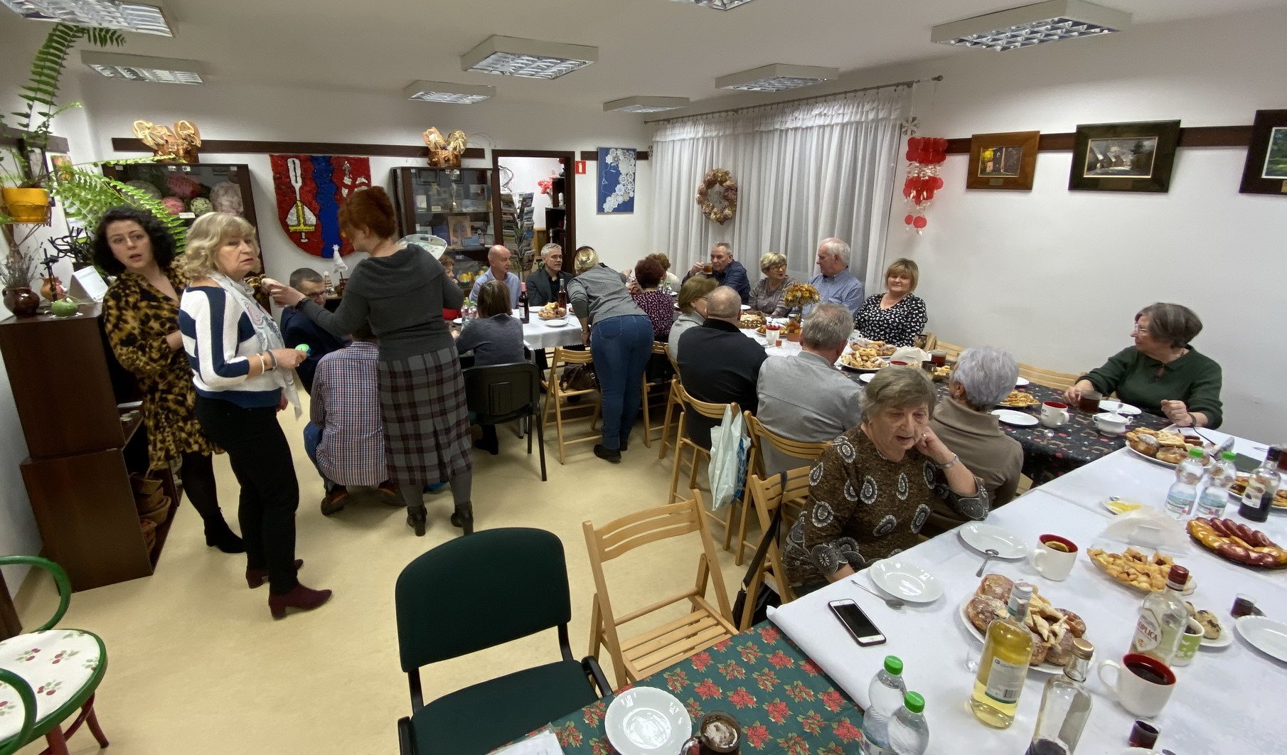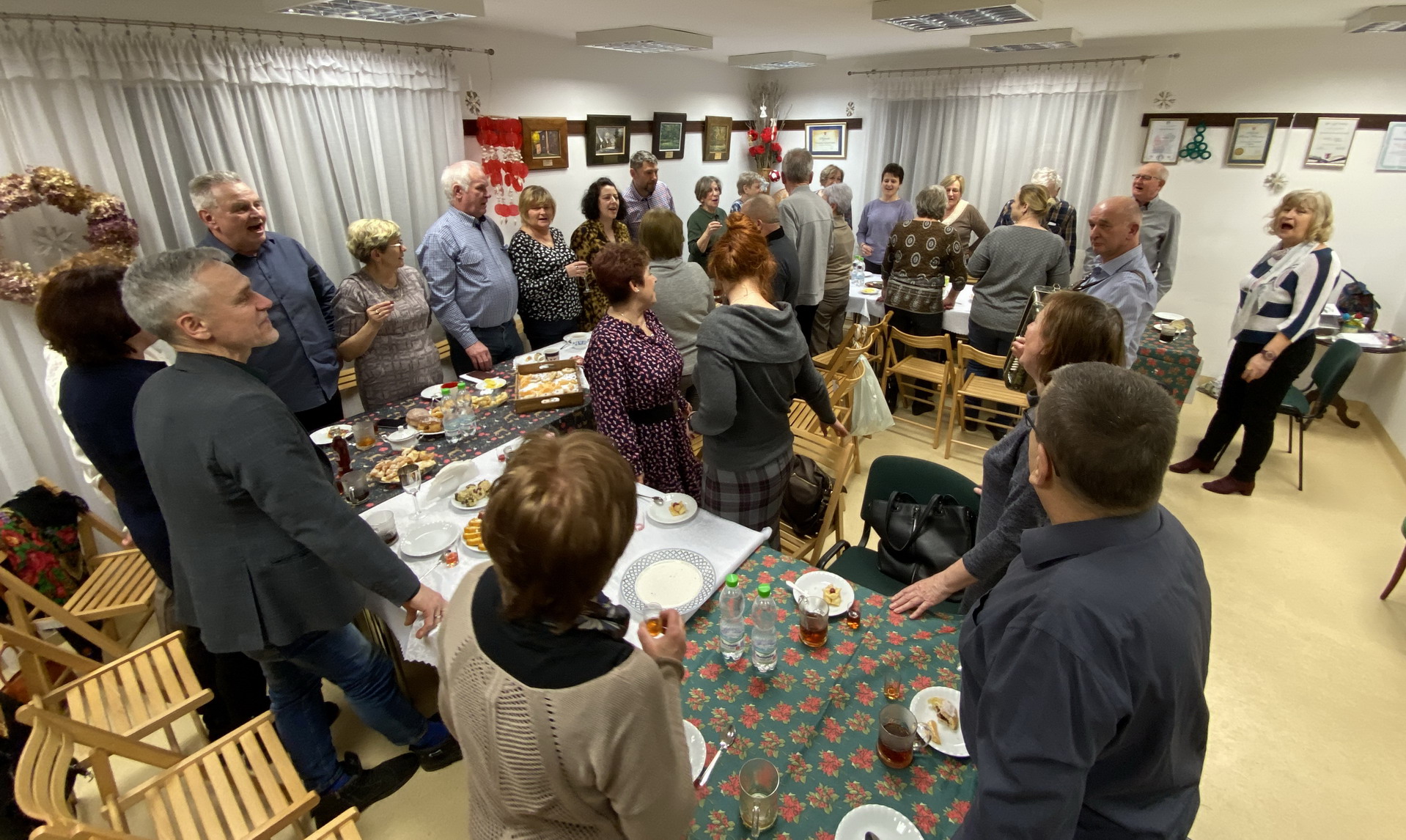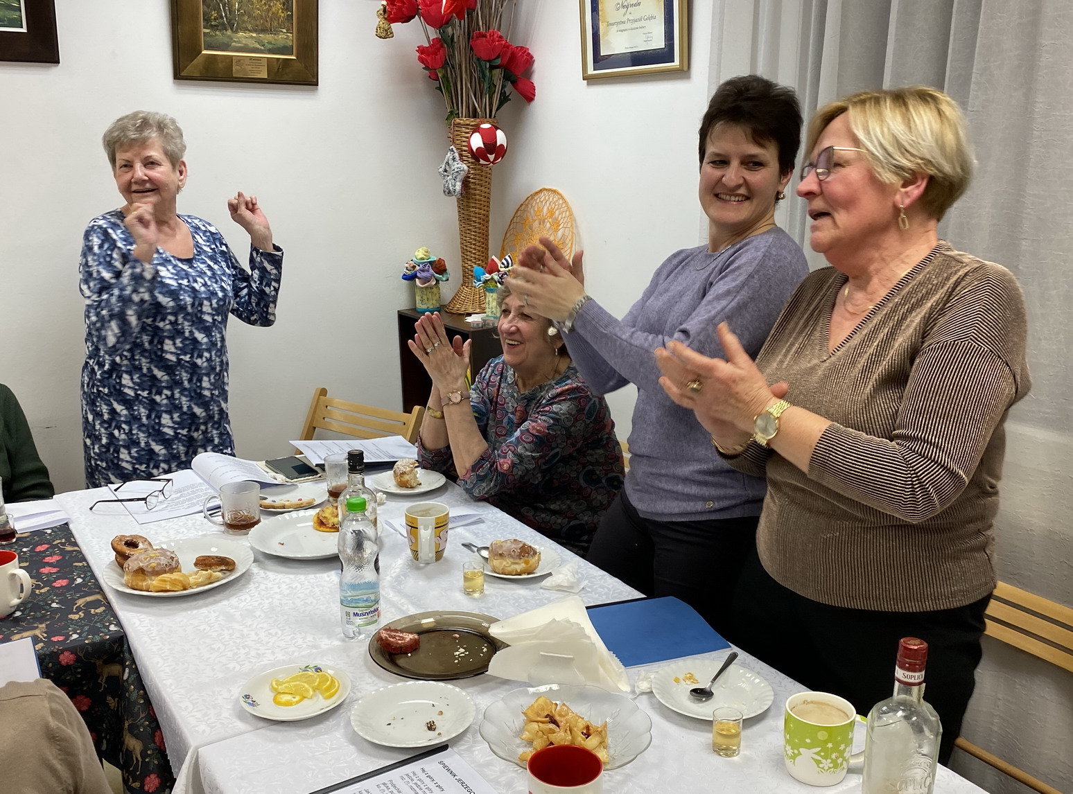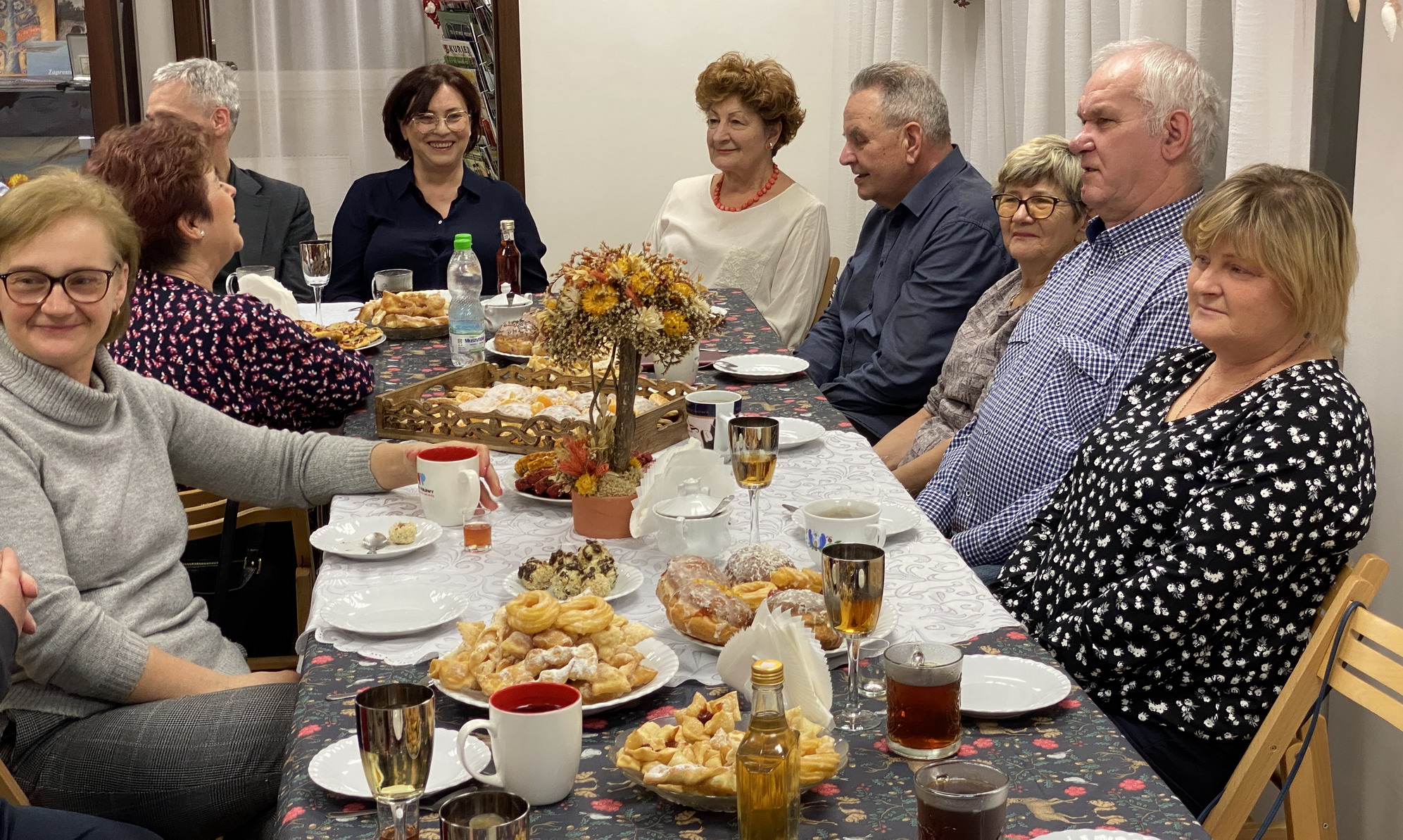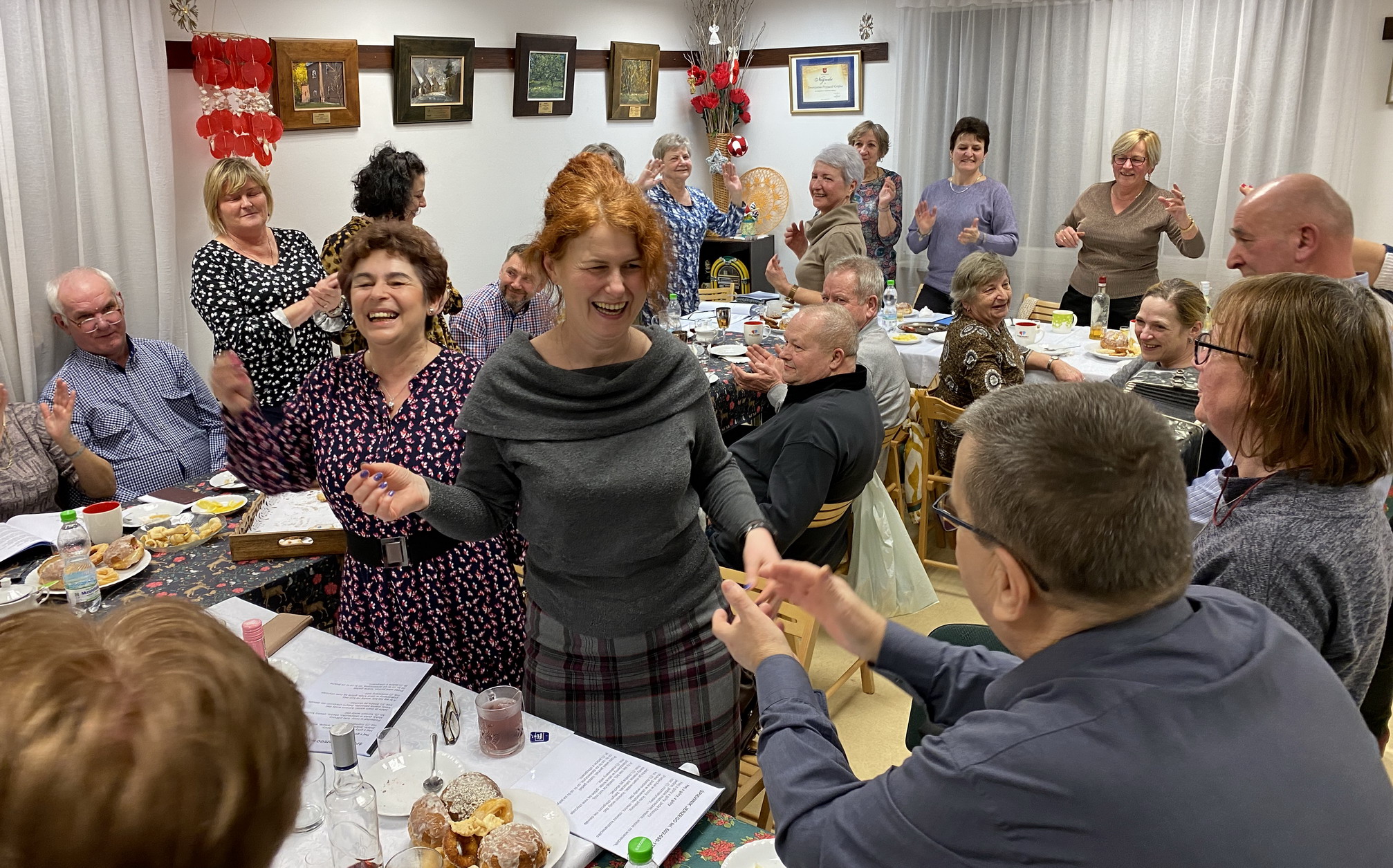 Tłusty czwartek to ostatni czwartek przed wielkim postem (czyli 52 dni przed Wielkanocą) w kalendarzu chrześcijańskim. Znany także jako zapusty, mięsopust, karnawał. Tłusty czwartek rozpoczyna ostatni tydzień karnawału. Historia zwyczaju tłustego czwartku sięga starożytności. Wtedy był to dzień, kiedy świętowano odejście zimy, a witano nadejście wiosny. Ucztowanie skupiało się głównie na jedzeniu tłustych potraw. Pączki były zakąską na uczcie, a wykonane były z ciasta chlebowego i nadziewane słoniną. Około XVI wieku w Polsce pojawił się zwyczaj jedzenia pączków w wersji słodkiej. Przyjęło się wierzenie, że jeśli ktoś w tłusty czwartek w ogóle nie zje pączka, to nie będzie się mu wiodło. Dawniej, przyrządzając pączki, nadziewało się niektóre migdałem lub orzechem włoskim. Wierzono, że kto na taki trafi, spotka go szczęście. W Polsce, zarówno, w miastach i na wsiach najhuczniej i najweselej obchodzono ostatni tydzień karnawału, rozpoczynający się tłustym czwartkiem. Dzień ten upływał głownie na jedzeniu i piciu. Stoły królewskie, magnackie, szlacheckie, jak i chłopskie uginały się od tradycyjnych, zapustnych potraw. W tłusty czwartek nigdzie nie mogło zabraknąć smażonych na tłuszczu racuchów, blinów, pampuchów, chrustów zwanych też faworkami oraz słodkich, okrągłych, pulchnych i nadziewanych pączków. Tańce i obfitość pożywienia, które były obowiązkowe w mięsopusty, oprócz przyjemności, dawały także podstawę do wróżb i zaklinania urodzaju. Wierzono bowiem w ich magiczny sens. Obfitość jedzenia miała przynosić urodzaj i dobrobyt na cały rok. Według badań w tłusty czwartek statystyczny Polak zjada 2-3 pączki. Oznacza to, że w sumie zjedliśmy w ten tłusty czwartek 2023 roku nawet ponad 100 milionów sztuk tego popularnego, cukierniczego wyrobu. W tej statystyce znaleźliśmy się też my, członkowie TP Gołębia. W naszej Izbie też zapanowało obżarstwo, również królowały pączki i faworki. Stoły uginały się tudzież od innego jadła. „Przekąską” zwyczaju pączkowego były nasze śpiewy ze sławnych śpiewników Jurka – naszego nauczyciela i akompaniatora. Mamy nadzieję, że ta praca naszego chóru choć trochę spaliła zdobywane kalorie. Poza tym nasz ciągły i nieprzerwany śmiech może i sprzyjał pozbywaniu się wartości energetycznej pokarmów… A ponoć jeden tradycyjny pączek ma około 350 kilokalorii, niespełna 6 gramów białka, ponad 50 gramów węglowodanów i około 13 gramów tłuszczu… Ale trudno - najważniejszy przecież odwieczny pączkowy zwyczaj!!!