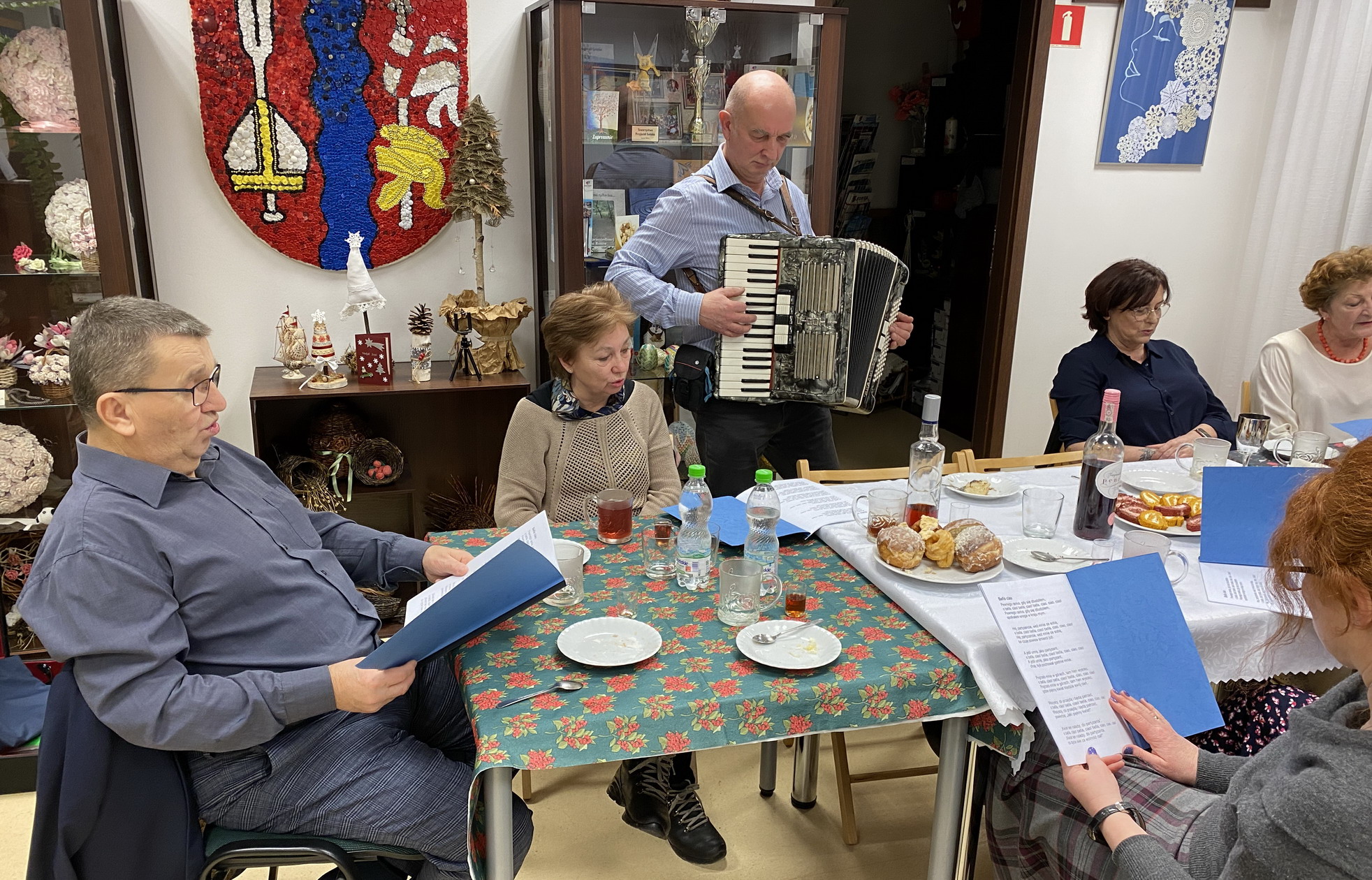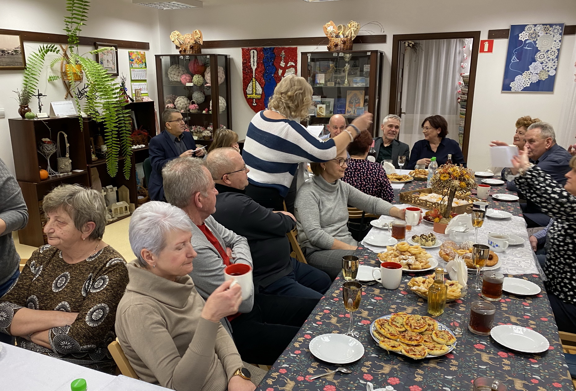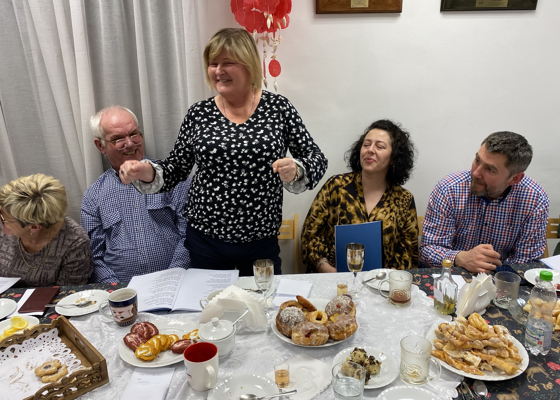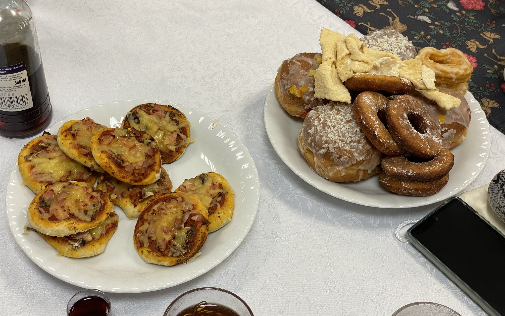 Tłusty czwartek to ostatni czwartek przed wielkim postem (czyli 52 dni przed Wielkanocą) w kalendarzu chrześcijańskim. Znany także jako zapusty, mięsopust, karnawał. Tłusty czwartek rozpoczyna ostatni tydzień karnawału. Historia zwyczaju tłustego czwartku sięga starożytności. Wtedy był to dzień, kiedy świętowano odejście zimy, a witano nadejście wiosny. Ucztowanie skupiało się głównie na jedzeniu tłustych potraw. Pączki były zakąską na uczcie, a wykonane były z ciasta chlebowego i nadziewane słoniną. Około XVI wieku w Polsce pojawił się zwyczaj jedzenia pączków w wersji słodkiej. Przyjęło się wierzenie, że jeśli ktoś w tłusty czwartek w ogóle nie zje pączka, to nie będzie się mu wiodło. Dawniej, przyrządzając pączki, nadziewało się niektóre migdałem lub orzechem włoskim. Wierzono, że kto na taki trafi, spotka go szczęście. W Polsce, zarówno, w miastach i na wsiach najhuczniej i najweselej obchodzono ostatni tydzień karnawału, rozpoczynający się tłustym czwartkiem. Dzień ten upływał głownie na jedzeniu i piciu. Stoły królewskie, magnackie, szlacheckie, jak i chłopskie uginały się od tradycyjnych, zapustnych potraw. W tłusty czwartek nigdzie nie mogło zabraknąć smażonych na tłuszczu racuchów, blinów, pampuchów, chrustów zwanych też faworkami oraz słodkich, okrągłych, pulchnych i nadziewanych pączków. Tańce i obfitość pożywienia, które były obowiązkowe w mięsopusty, oprócz przyjemności, dawały także podstawę do wróżb i zaklinania urodzaju. Wierzono bowiem w ich magiczny sens. Obfitość jedzenia miała przynosić urodzaj i dobrobyt na cały rok. Według badań w tłusty czwartek statystyczny Polak zjada 2-3 pączki. Oznacza to, że w sumie zjedliśmy w ten tłusty czwartek 2023 roku nawet ponad 100 milionów sztuk tego popularnego, cukierniczego wyrobu. W tej statystyce znaleźliśmy się też my, członkowie TP Gołębia. W naszej Izbie też zapanowało obżarstwo, również królowały pączki i faworki. Stoły uginały się tudzież od innego jadła. „Przekąską” zwyczaju pączkowego były nasze śpiewy ze sławnych śpiewników Jurka – naszego nauczyciela i akompaniatora. Mamy nadzieję, że ta praca naszego chóru choć trochę spaliła zdobywane kalorie. Poza tym nasz ciągły i nieprzerwany śmiech może i sprzyjał pozbywaniu się wartości energetycznej pokarmów… A ponoć jeden tradycyjny pączek ma około 350 kilokalorii, niespełna 6 gramów białka, ponad 50 gramów węglowodanów i około 13 gramów tłuszczu… Ale trudno - najważniejszy przecież odwieczny pączkowy zwyczaj!!!