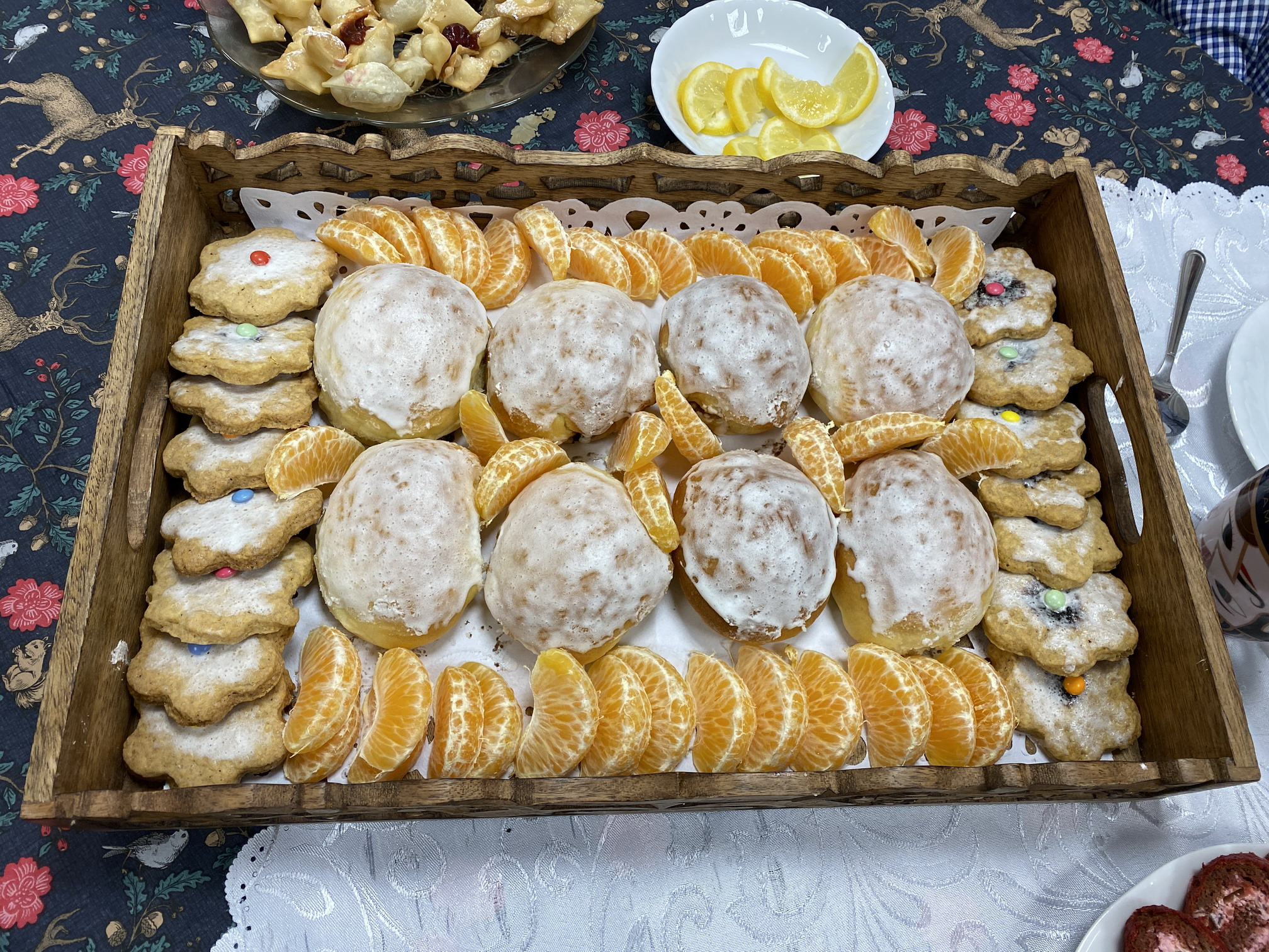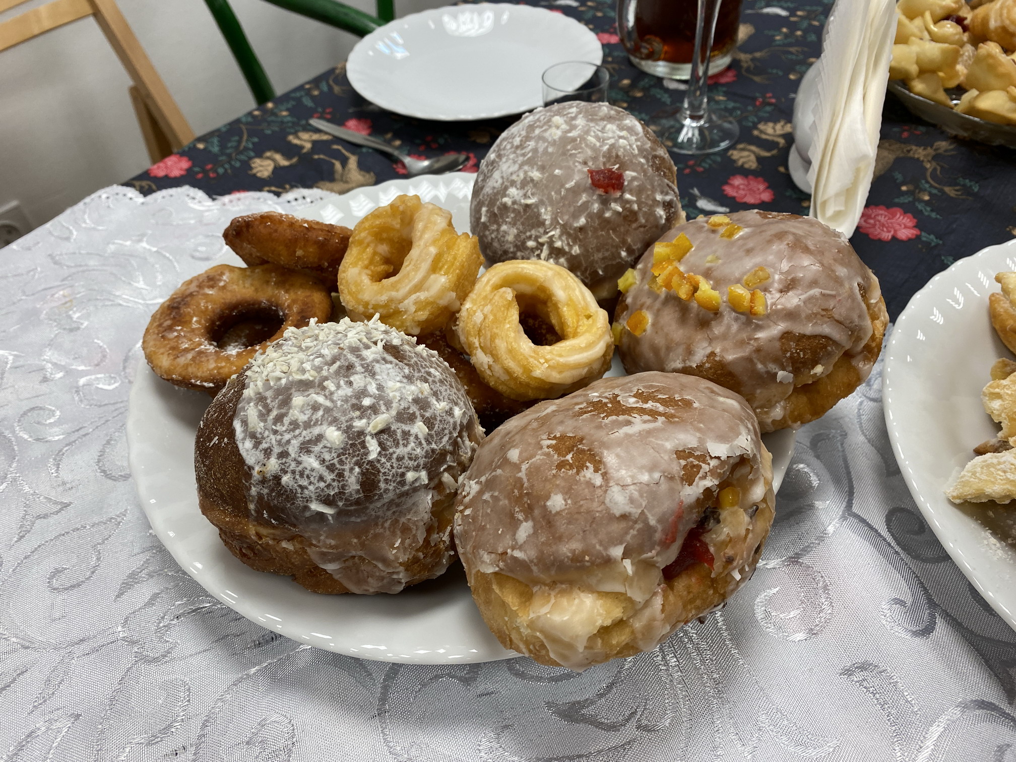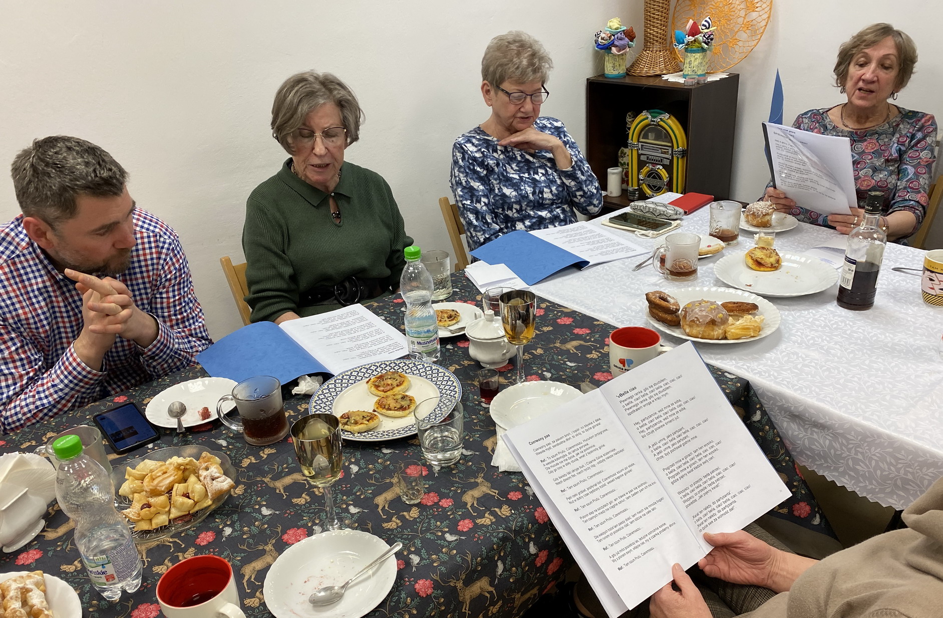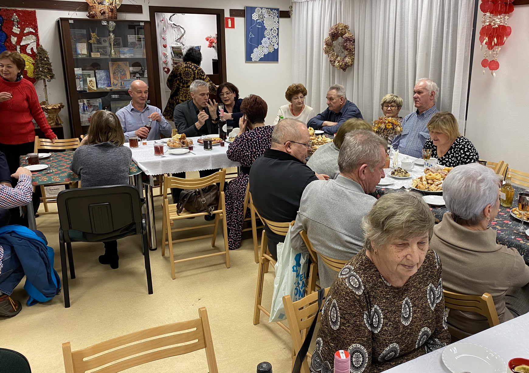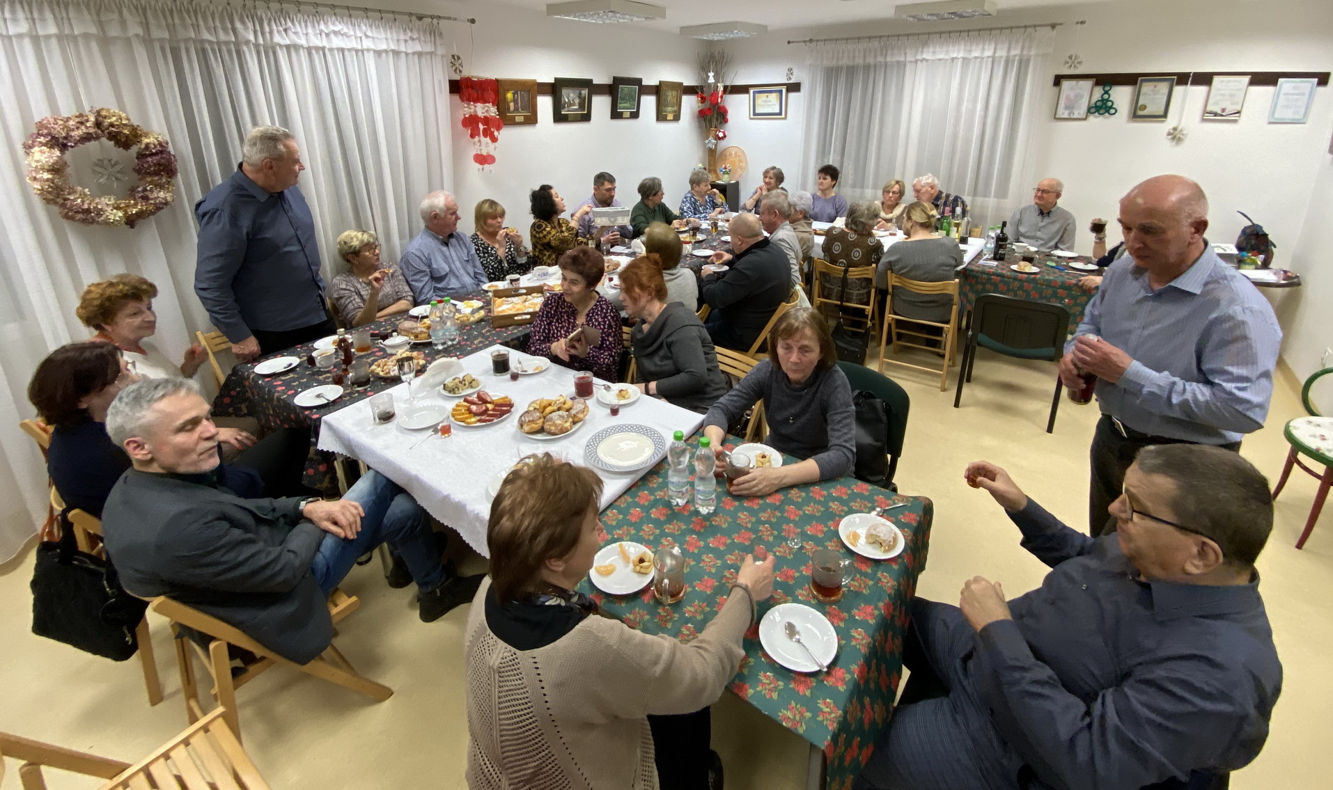 Tłusty czwartek to ostatni czwartek przed wielkim postem (czyli 52 dni przed Wielkanocą) w kalendarzu chrześcijańskim. Znany także jako zapusty, mięsopust, karnawał. Tłusty czwartek rozpoczyna ostatni tydzień karnawału. Historia zwyczaju tłustego czwartku sięga starożytności. Wtedy był to dzień, kiedy świętowano odejście zimy, a witano nadejście wiosny. Ucztowanie skupiało się głównie na jedzeniu tłustych potraw. Pączki były zakąską na uczcie, a wykonane były z ciasta chlebowego i nadziewane słoniną. Około XVI wieku w Polsce pojawił się zwyczaj jedzenia pączków w wersji słodkiej. Przyjęło się wierzenie, że jeśli ktoś w tłusty czwartek w ogóle nie zje pączka, to nie będzie się mu wiodło. Dawniej, przyrządzając pączki, nadziewało się niektóre migdałem lub orzechem włoskim. Wierzono, że kto na taki trafi, spotka go szczęście. W Polsce, zarówno, w miastach i na wsiach najhuczniej i najweselej obchodzono ostatni tydzień karnawału, rozpoczynający się tłustym czwartkiem. Dzień ten upływał głownie na jedzeniu i piciu. Stoły królewskie, magnackie, szlacheckie, jak i chłopskie uginały się od tradycyjnych, zapustnych potraw. W tłusty czwartek nigdzie nie mogło zabraknąć smażonych na tłuszczu racuchów, blinów, pampuchów, chrustów zwanych też faworkami oraz słodkich, okrągłych, pulchnych i nadziewanych pączków. Tańce i obfitość pożywienia, które były obowiązkowe w mięsopusty, oprócz przyjemności, dawały także podstawę do wróżb i zaklinania urodzaju. Wierzono bowiem w ich magiczny sens. Obfitość jedzenia miała przynosić urodzaj i dobrobyt na cały rok. Według badań w tłusty czwartek statystyczny Polak zjada 2-3 pączki. Oznacza to, że w sumie zjedliśmy w ten tłusty czwartek 2023 roku nawet ponad 100 milionów sztuk tego popularnego, cukierniczego wyrobu. W tej statystyce znaleźliśmy się też my, członkowie TP Gołębia. W naszej Izbie też zapanowało obżarstwo, również królowały pączki i faworki. Stoły uginały się tudzież od innego jadła. „Przekąską” zwyczaju pączkowego były nasze śpiewy ze sławnych śpiewników Jurka – naszego nauczyciela i akompaniatora. Mamy nadzieję, że ta praca naszego chóru choć trochę spaliła zdobywane kalorie. Poza tym nasz ciągły i nieprzerwany śmiech może i sprzyjał pozbywaniu się wartości energetycznej pokarmów… A ponoć jeden tradycyjny pączek ma około 350 kilokalorii, niespełna 6 gramów białka, ponad 50 gramów węglowodanów i około 13 gramów tłuszczu… Ale trudno - najważniejszy przecież odwieczny pączkowy zwyczaj!!!