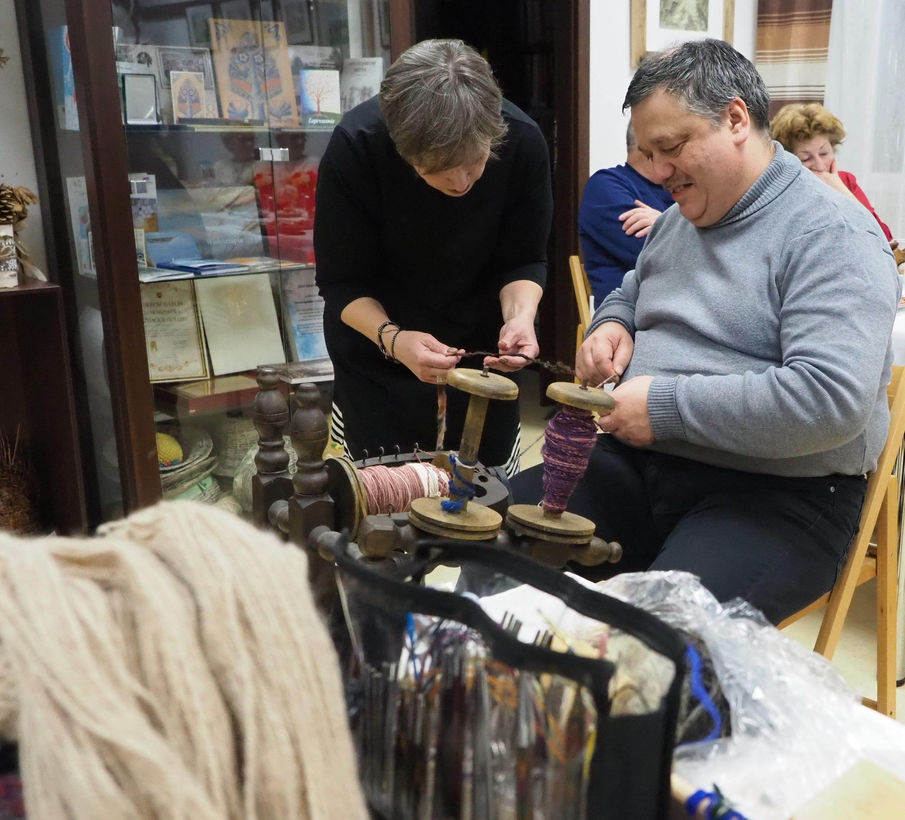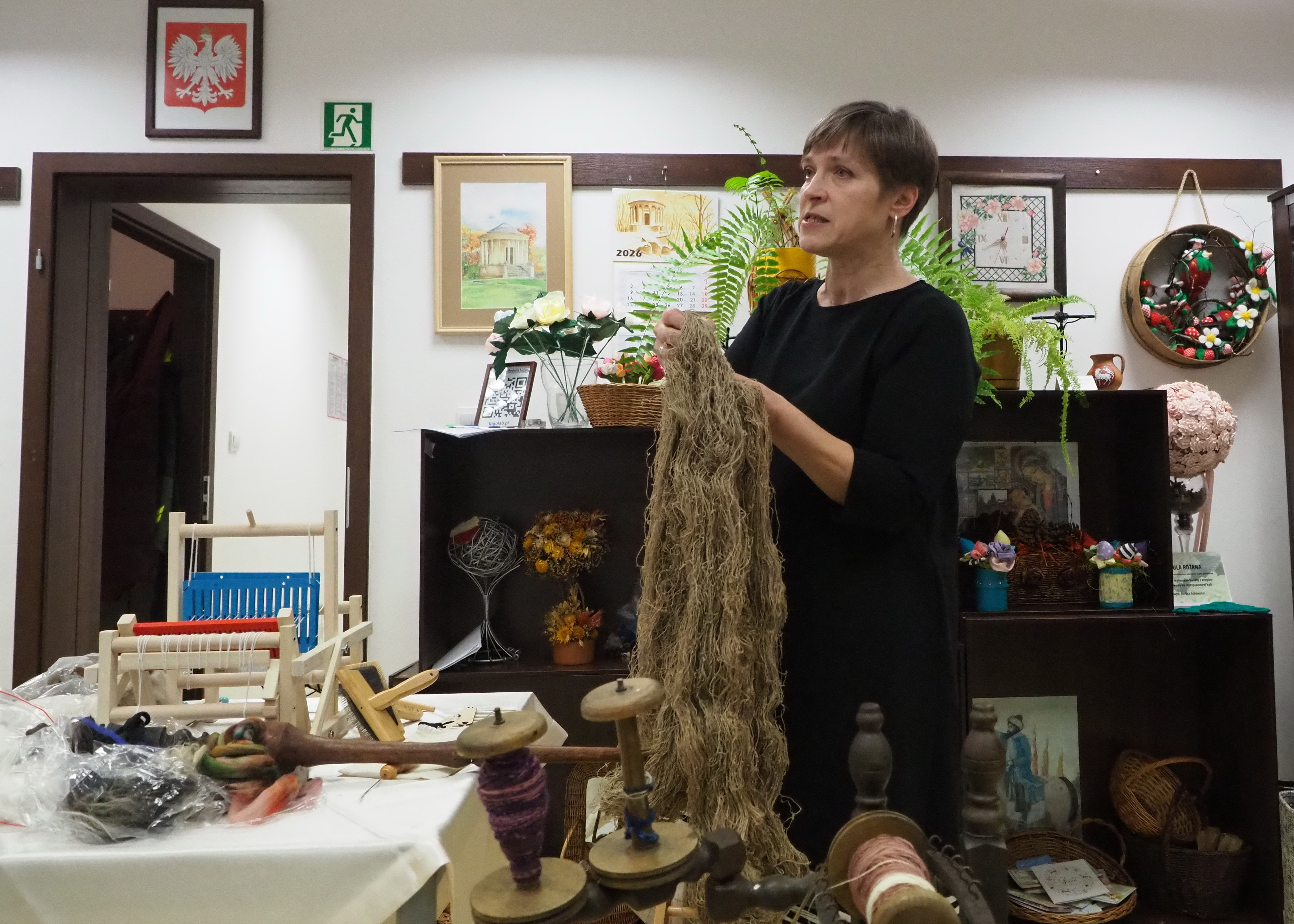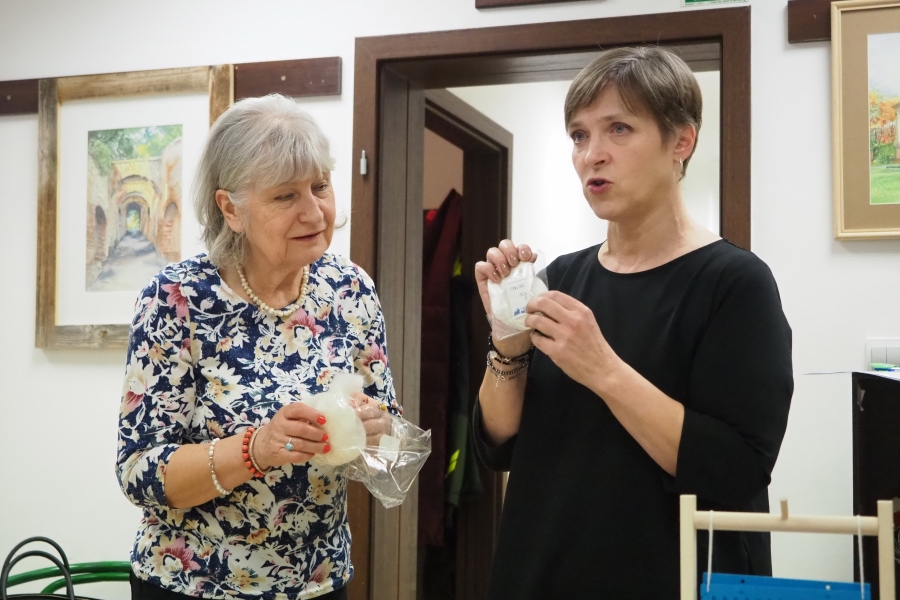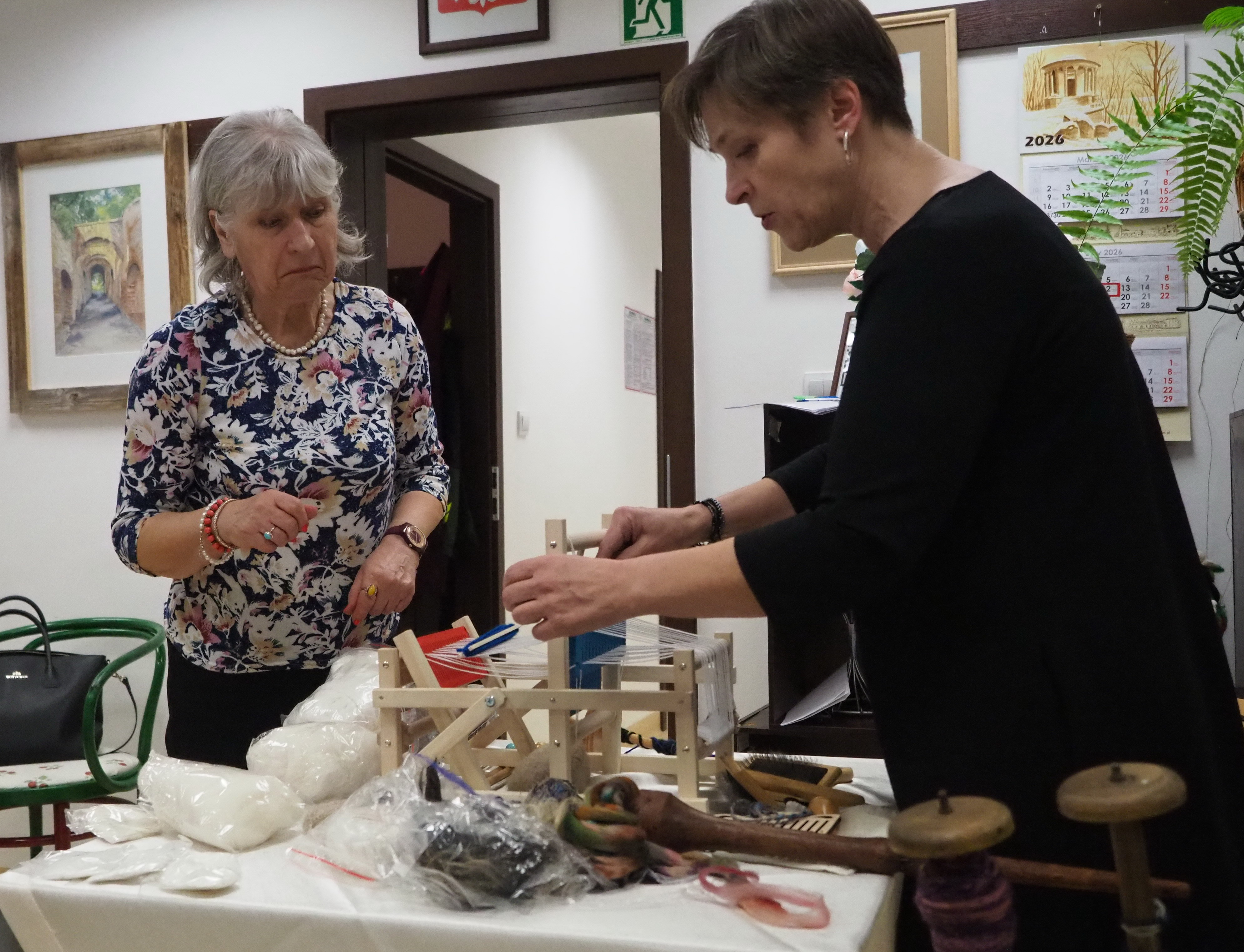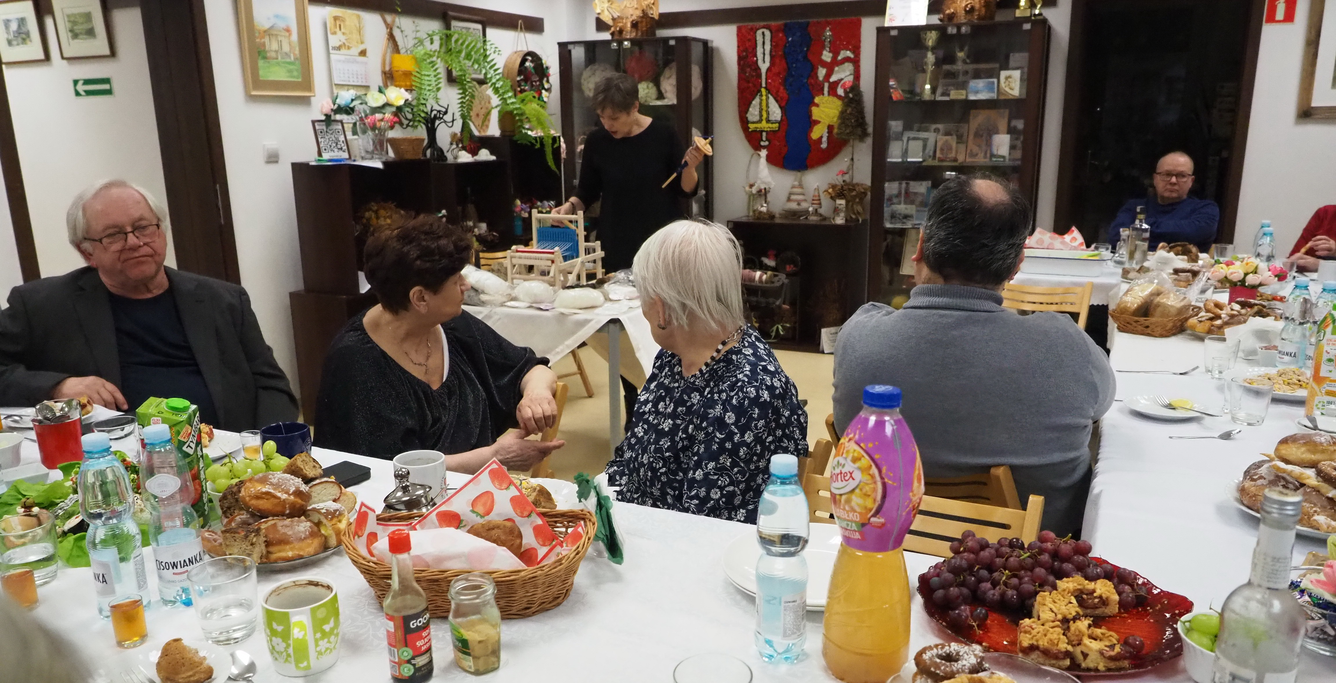 Dnia 12 lutego 2026 r. w Izbie Produktu Lokalnego zorganizowaliśmy tłusty czwartek. Stoły pełne smakołyków. Pączki, faworki, oponki i inne przysmaki. Atrakcją spotkania była prezentacja o tytule „Od owieczki do czapeczki” przygotowana przez nasza koleżankę Dorotę Skibińską. Czy zastanawialiście się kiedyś, czemu nasze babcie tak dbały o odzież ? O każdy ręcznik, ścierkę, koc? Dlaczego tak pieczołowicie, cerowały skarpety, łatały portki, pruły stare swetry ? Szanowały każdy ścinek i przerabiały aż do całkowitego zniszczenia ? Koleżanka Dorota przybliżyła nam proces powstawania tkanin w czasach, kiedy kobiety robiły większość samodzielnie. Przerabiały naturalne włókna roślinne - len, konopie, pokrzywę, igły sosny, a także włókna pochodzenia zwierzęcego – wełnę i włosie. Proces przygotowania kądzieli począwszy od wstępnego przebrania, żmudnego czyszczenia, prania, czesania, gręplowania, barwienia, a potem przędzenia na wrzecionie lub kołowrotku, aż do uzyskania równej nici, był bardzo pracochłonny i wymagał wiele pracy. A to jeszcze nie koniec – taką nić trzeba było przerobić poprzez utkanie na warsztacie tkackim lub dzianie na drutach czy szydełku. Koleżanka pokazała nam zasadę tkania – na miniaturowym warsztacie i na bardku. Pokazała również swoją wielką pasję dziewiarską, prezentując zestaw swoich drutów i szydełek wraz z akcesoriami, a także gotowe wyroby, wspominając przy tym Tych, którzy ją wprowadzali na tę drogę dziewiarskiego rękodzieła. Odważni mieli okazję spróbować przędzenia na starym kołowrotku, stanowiącym rodzinną pamiątkę.