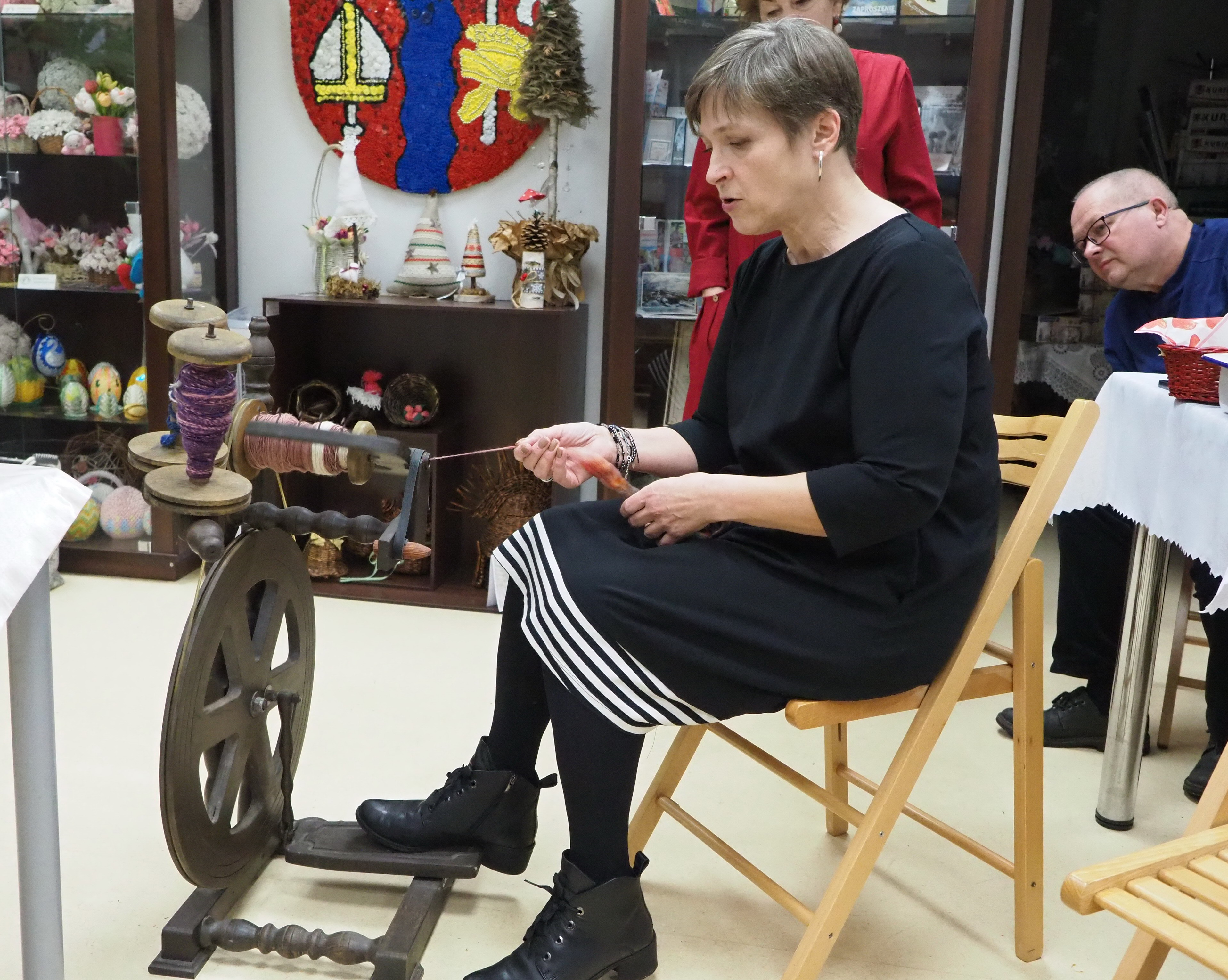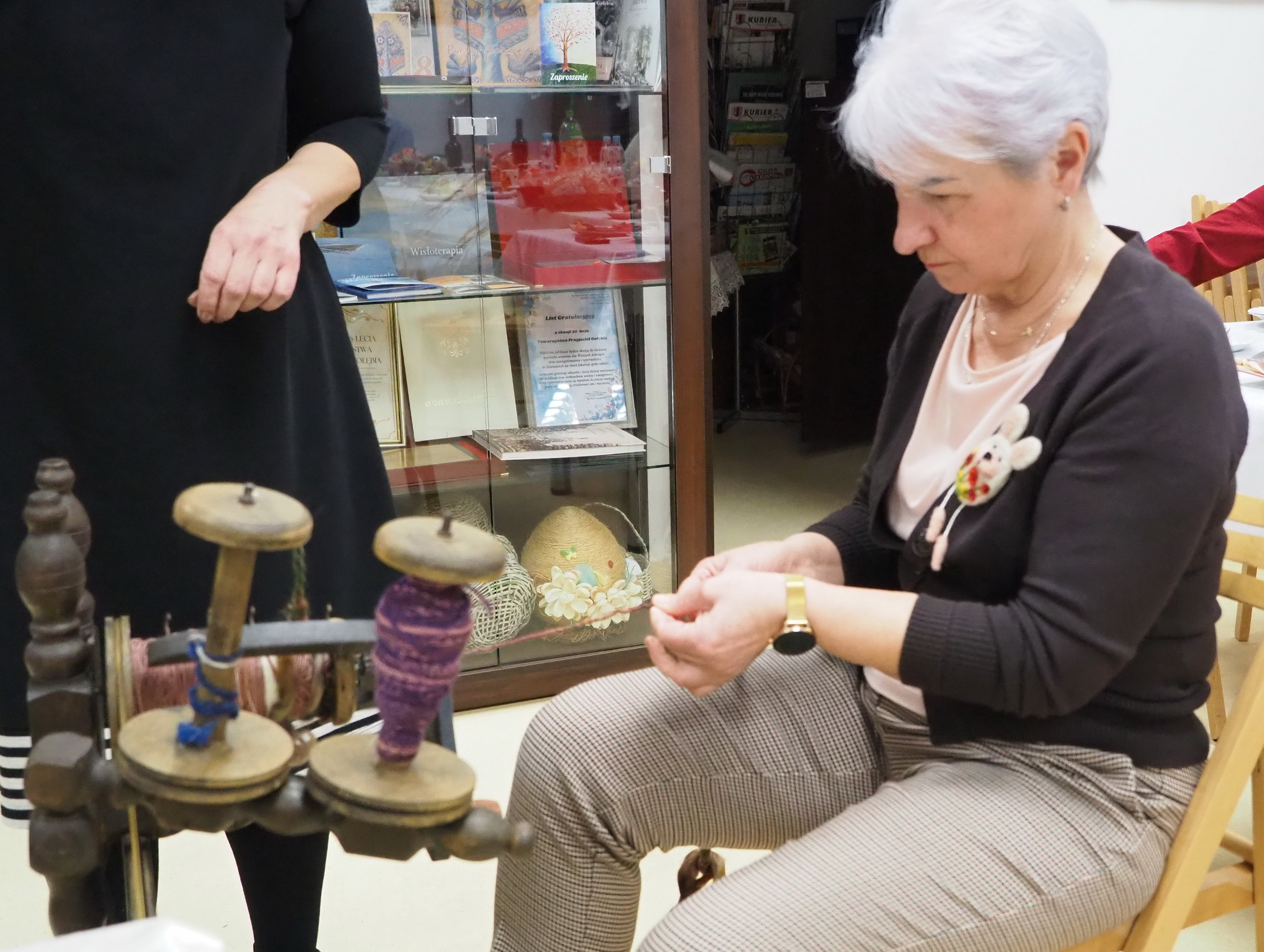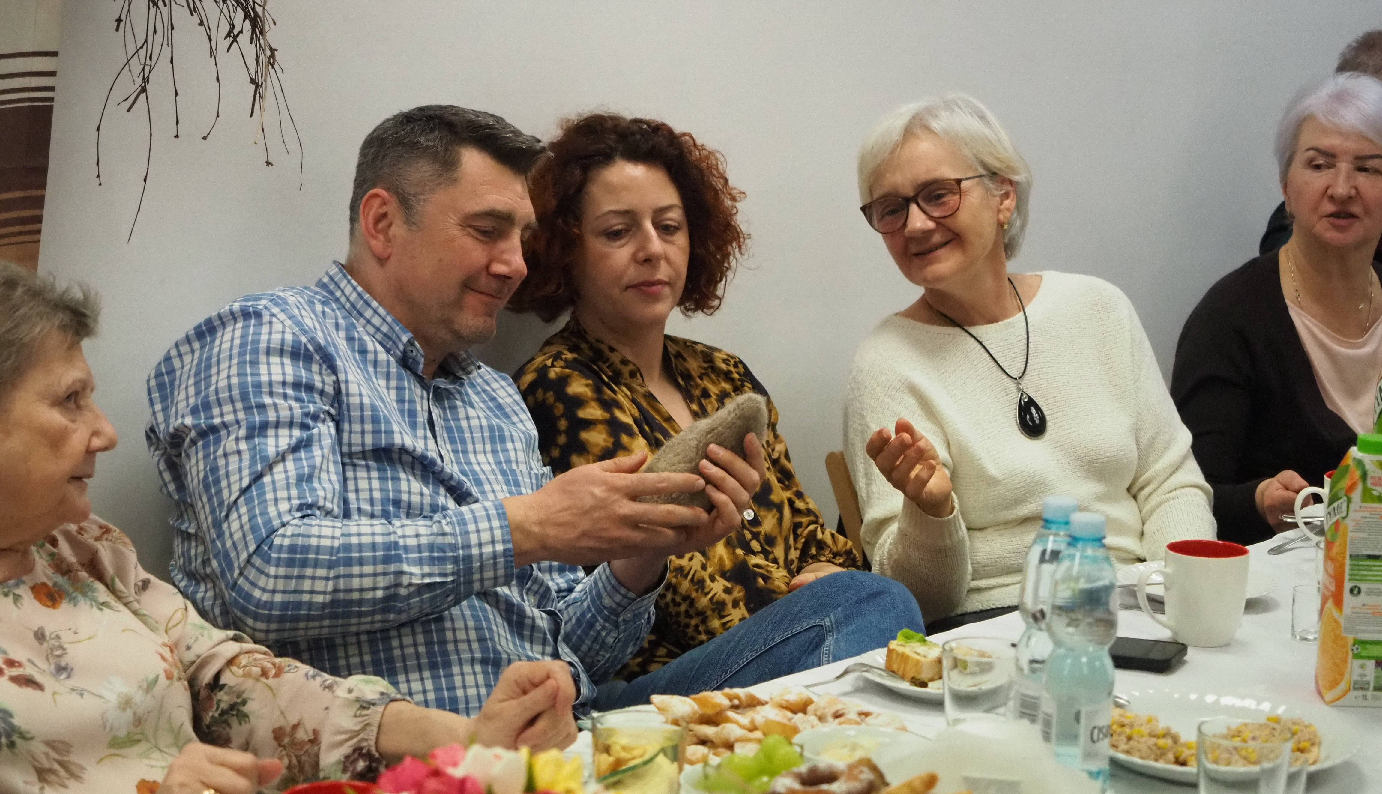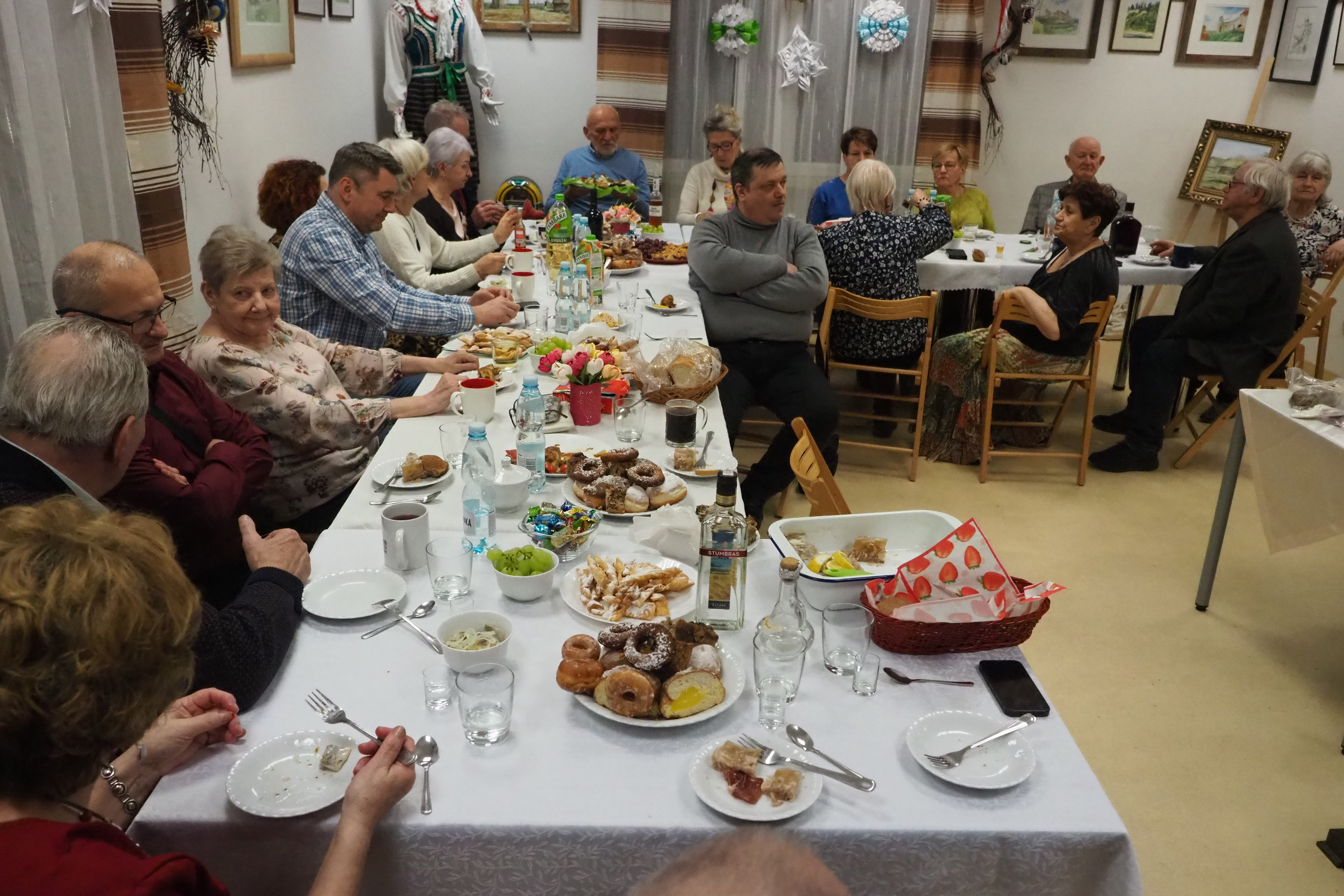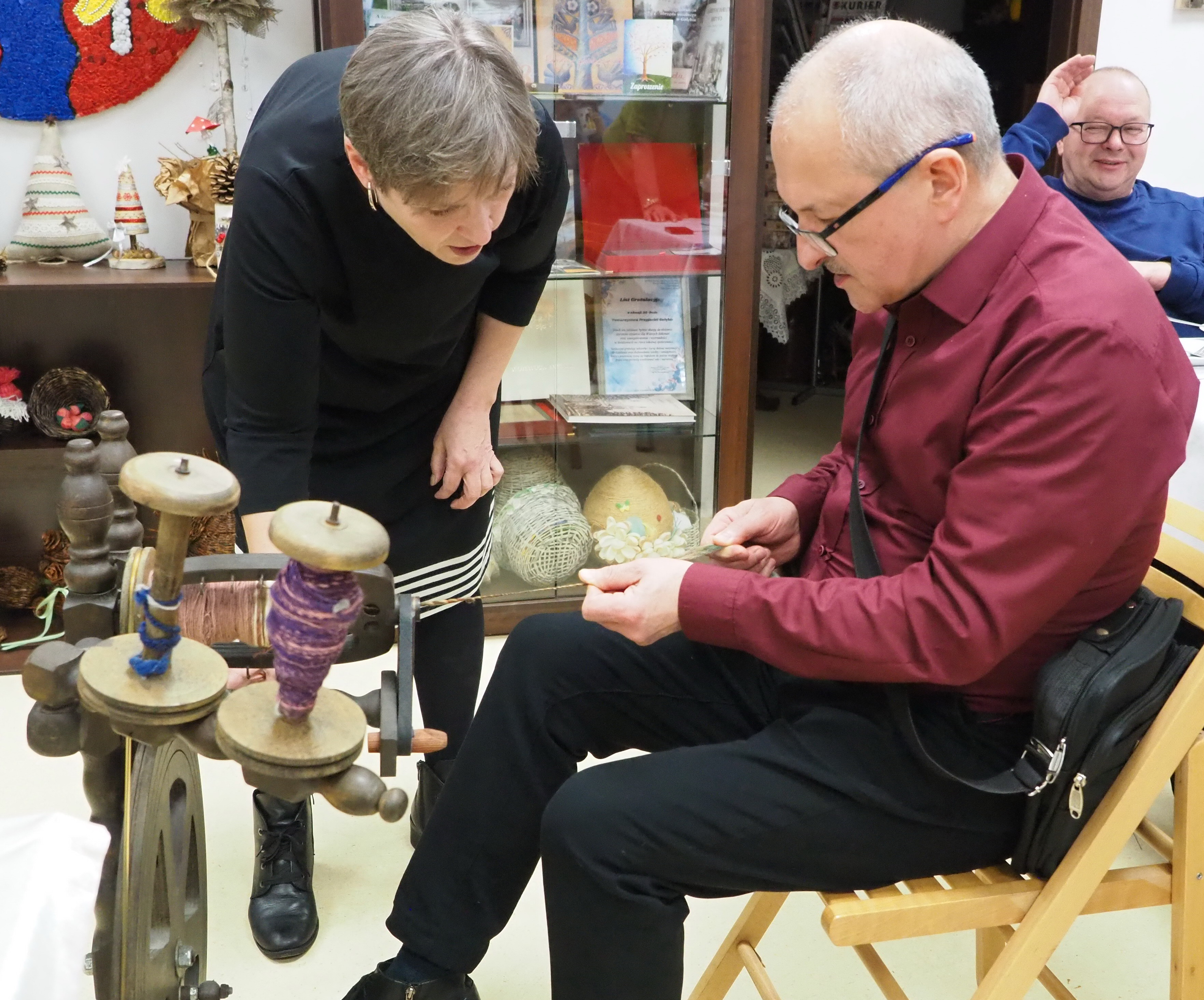 Dnia 12 lutego 2026 r. w Izbie Produktu Lokalnego zorganizowaliśmy tłusty czwartek. Stoły pełne smakołyków. Pączki, faworki, oponki i inne przysmaki. Atrakcją spotkania była prezentacja o tytule „Od owieczki do czapeczki” przygotowana przez nasza koleżankę Dorotę Skibińską. Czy zastanawialiście się kiedyś, czemu nasze babcie tak dbały o odzież ? O każdy ręcznik, ścierkę, koc? Dlaczego tak pieczołowicie, cerowały skarpety, łatały portki, pruły stare swetry ? Szanowały każdy ścinek i przerabiały aż do całkowitego zniszczenia ? Koleżanka Dorota przybliżyła nam proces powstawania tkanin w czasach, kiedy kobiety robiły większość samodzielnie. Przerabiały naturalne włókna roślinne - len, konopie, pokrzywę, igły sosny, a także włókna pochodzenia zwierzęcego – wełnę i włosie. Proces przygotowania kądzieli począwszy od wstępnego przebrania, żmudnego czyszczenia, prania, czesania, gręplowania, barwienia, a potem przędzenia na wrzecionie lub kołowrotku, aż do uzyskania równej nici, był bardzo pracochłonny i wymagał wiele pracy. A to jeszcze nie koniec – taką nić trzeba było przerobić poprzez utkanie na warsztacie tkackim lub dzianie na drutach czy szydełku. Koleżanka pokazała nam zasadę tkania – na miniaturowym warsztacie i na bardku. Pokazała również swoją wielką pasję dziewiarską, prezentując zestaw swoich drutów i szydełek wraz z akcesoriami, a także gotowe wyroby, wspominając przy tym Tych, którzy ją wprowadzali na tę drogę dziewiarskiego rękodzieła. Odważni mieli okazję spróbować przędzenia na starym kołowrotku, stanowiącym rodzinną pamiątkę.