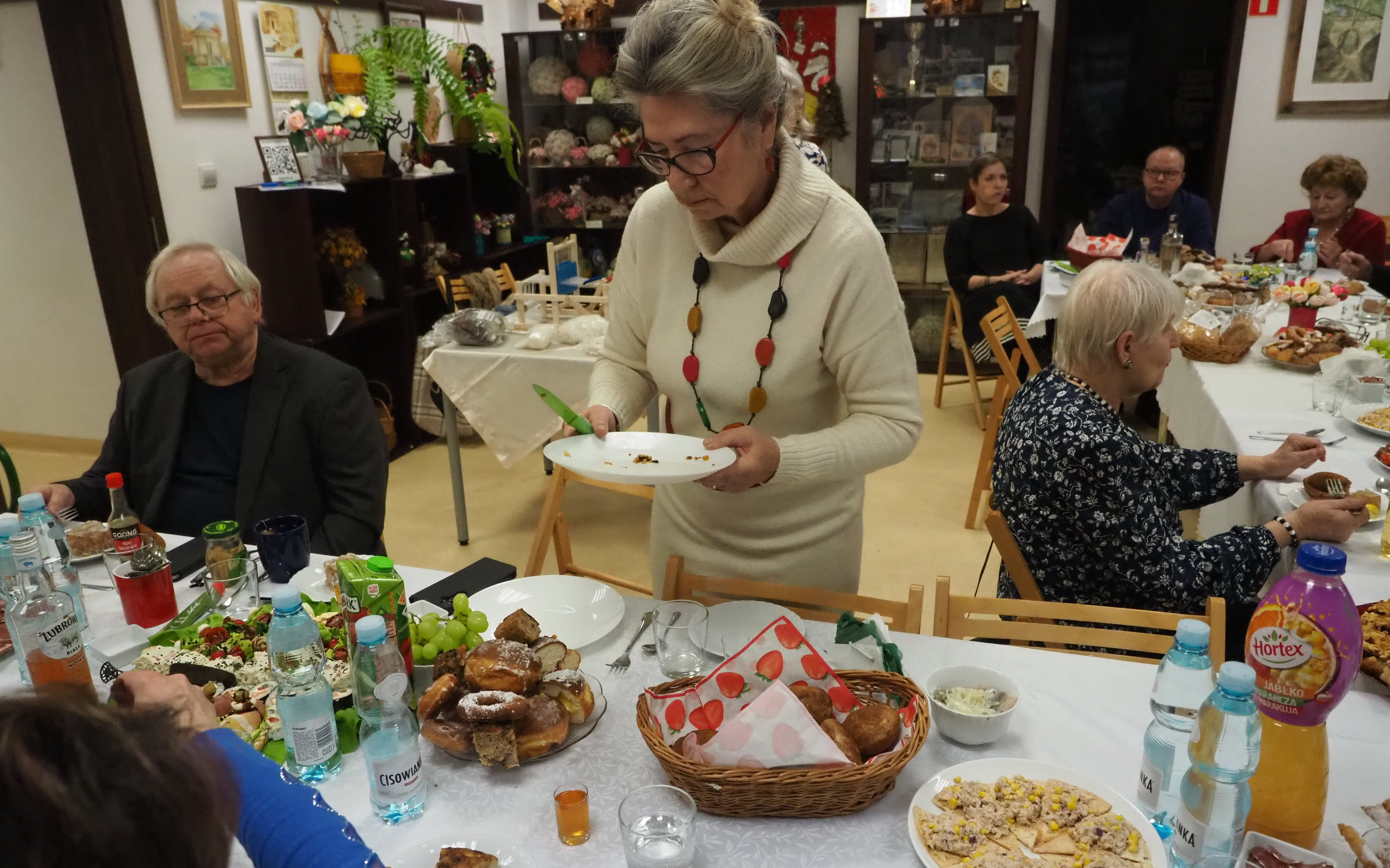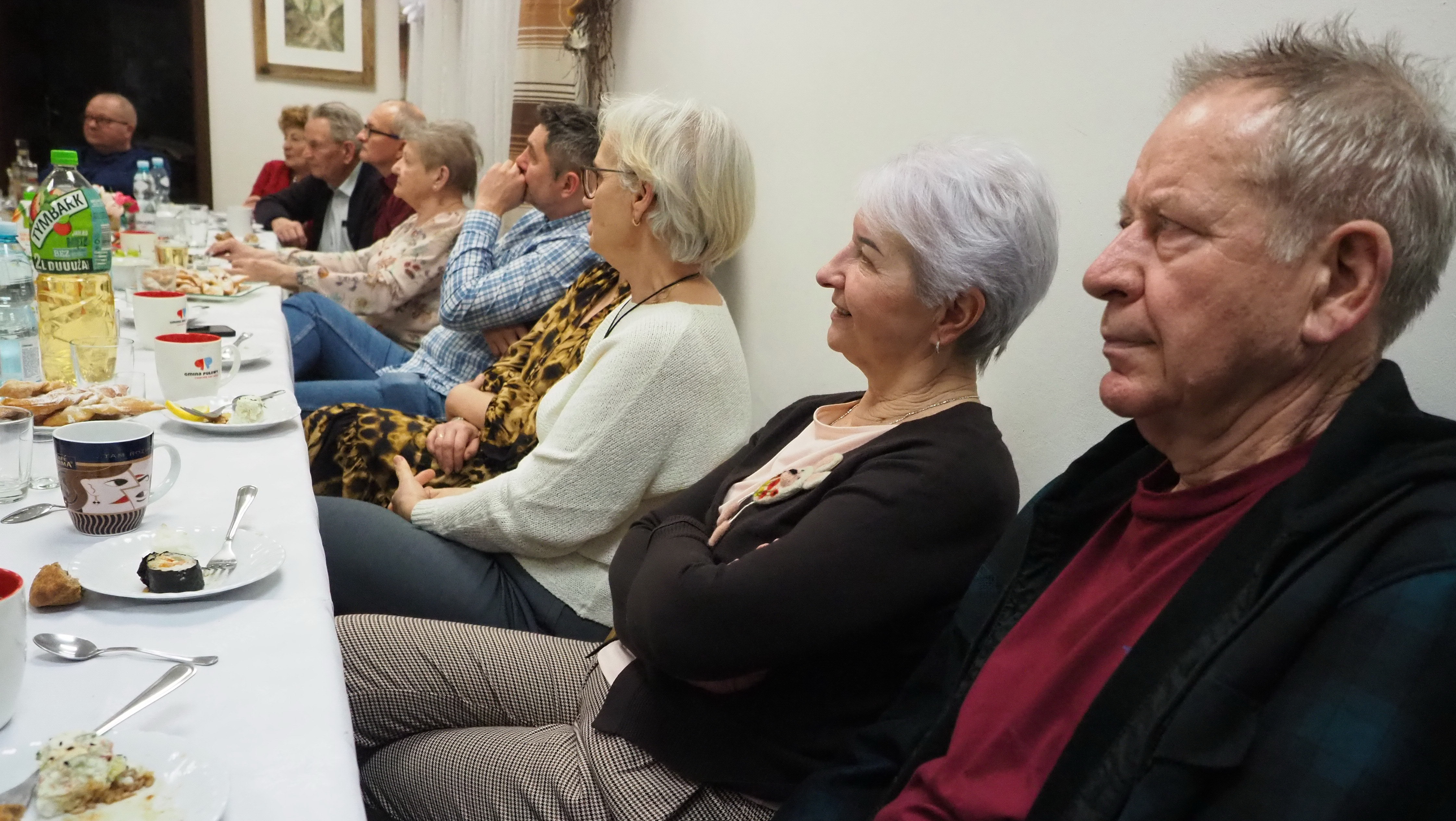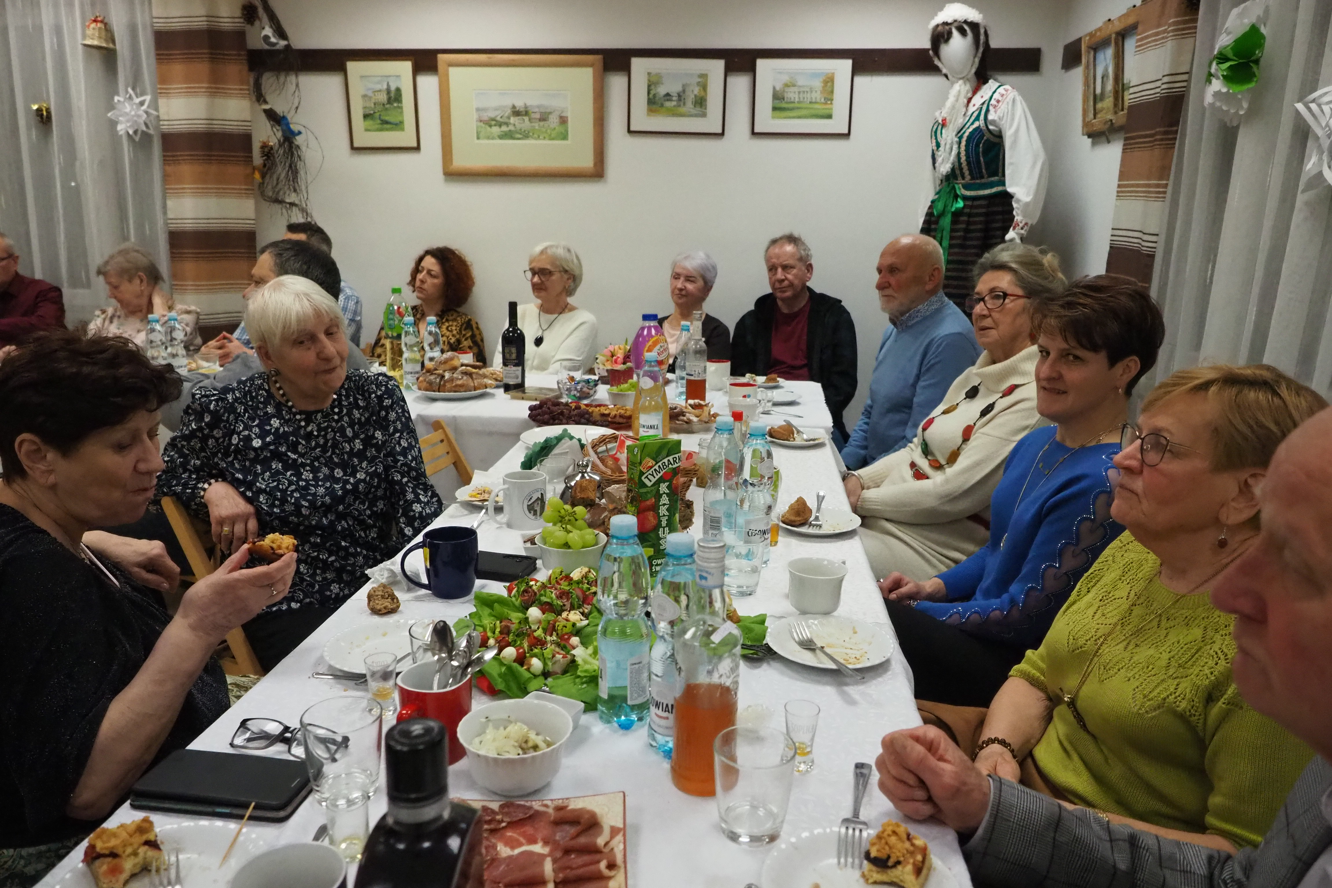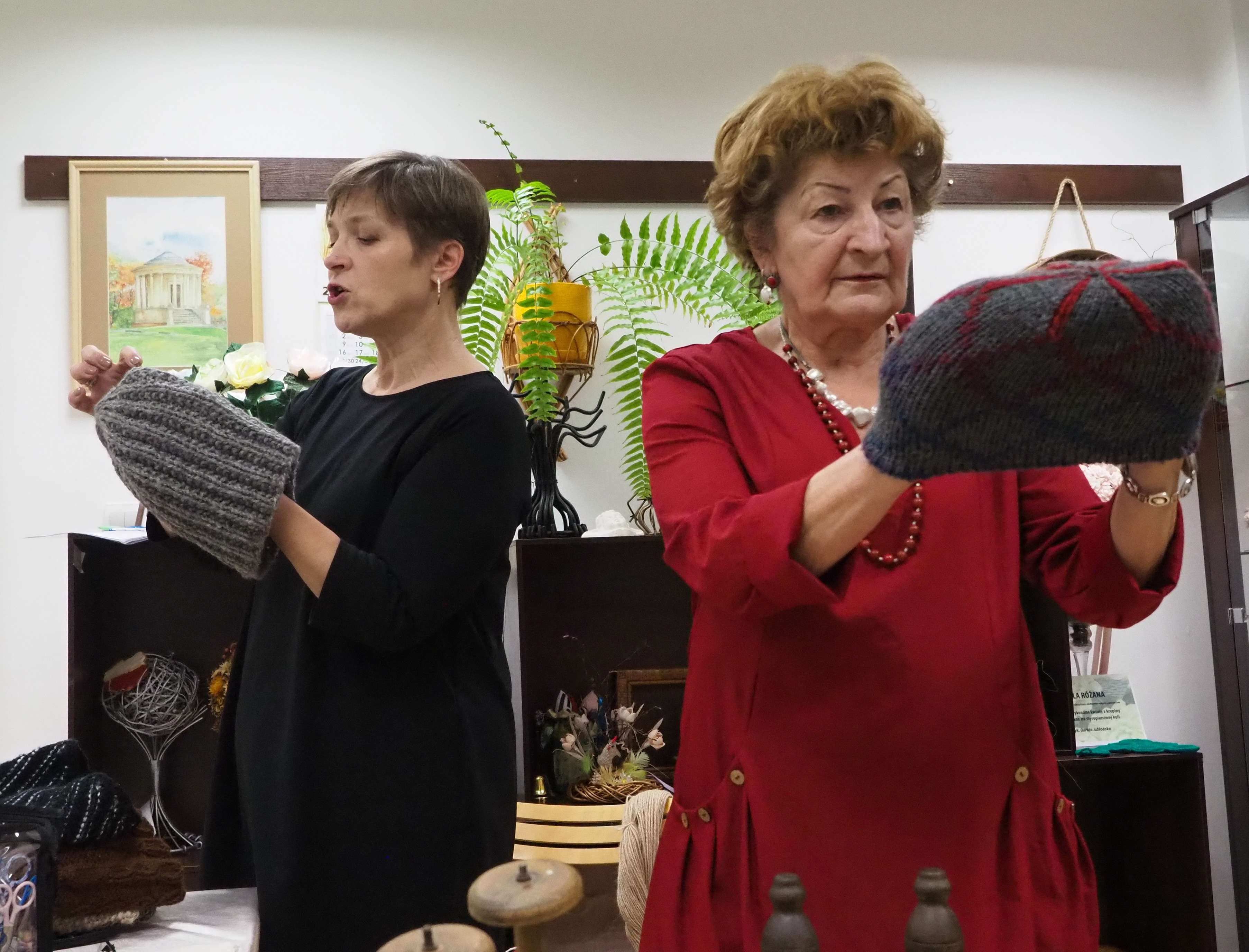 Dnia 12 lutego 2026 r. w Izbie Produktu Lokalnego zorganizowaliśmy tłusty czwartek. Stoły pełne smakołyków. Pączki, faworki, oponki i inne przysmaki. Atrakcją spotkania była prezentacja o tytule „Od owieczki do czapeczki” przygotowana przez nasza koleżankę Dorotę Skibińską. Czy zastanawialiście się kiedyś, czemu nasze babcie tak dbały o odzież ? O każdy ręcznik, ścierkę, koc? Dlaczego tak pieczołowicie, cerowały skarpety, łatały portki, pruły stare swetry ? Szanowały każdy ścinek i przerabiały aż do całkowitego zniszczenia ? Koleżanka Dorota przybliżyła nam proces powstawania tkanin w czasach, kiedy kobiety robiły większość samodzielnie. Przerabiały naturalne włókna roślinne - len, konopie, pokrzywę, igły sosny, a także włókna pochodzenia zwierzęcego – wełnę i włosie. Proces przygotowania kądzieli począwszy od wstępnego przebrania, żmudnego czyszczenia, prania, czesania, gręplowania, barwienia, a potem przędzenia na wrzecionie lub kołowrotku, aż do uzyskania równej nici, był bardzo pracochłonny i wymagał wiele pracy. A to jeszcze nie koniec – taką nić trzeba było przerobić poprzez utkanie na warsztacie tkackim lub dzianie na drutach czy szydełku. Koleżanka pokazała nam zasadę tkania – na miniaturowym warsztacie i na bardku. Pokazała również swoją wielką pasję dziewiarską, prezentując zestaw swoich drutów i szydełek wraz z akcesoriami, a także gotowe wyroby, wspominając przy tym Tych, którzy ją wprowadzali na tę drogę dziewiarskiego rękodzieła. Odważni mieli okazję spróbować przędzenia na starym kołowrotku, stanowiącym rodzinną pamiątkę.
