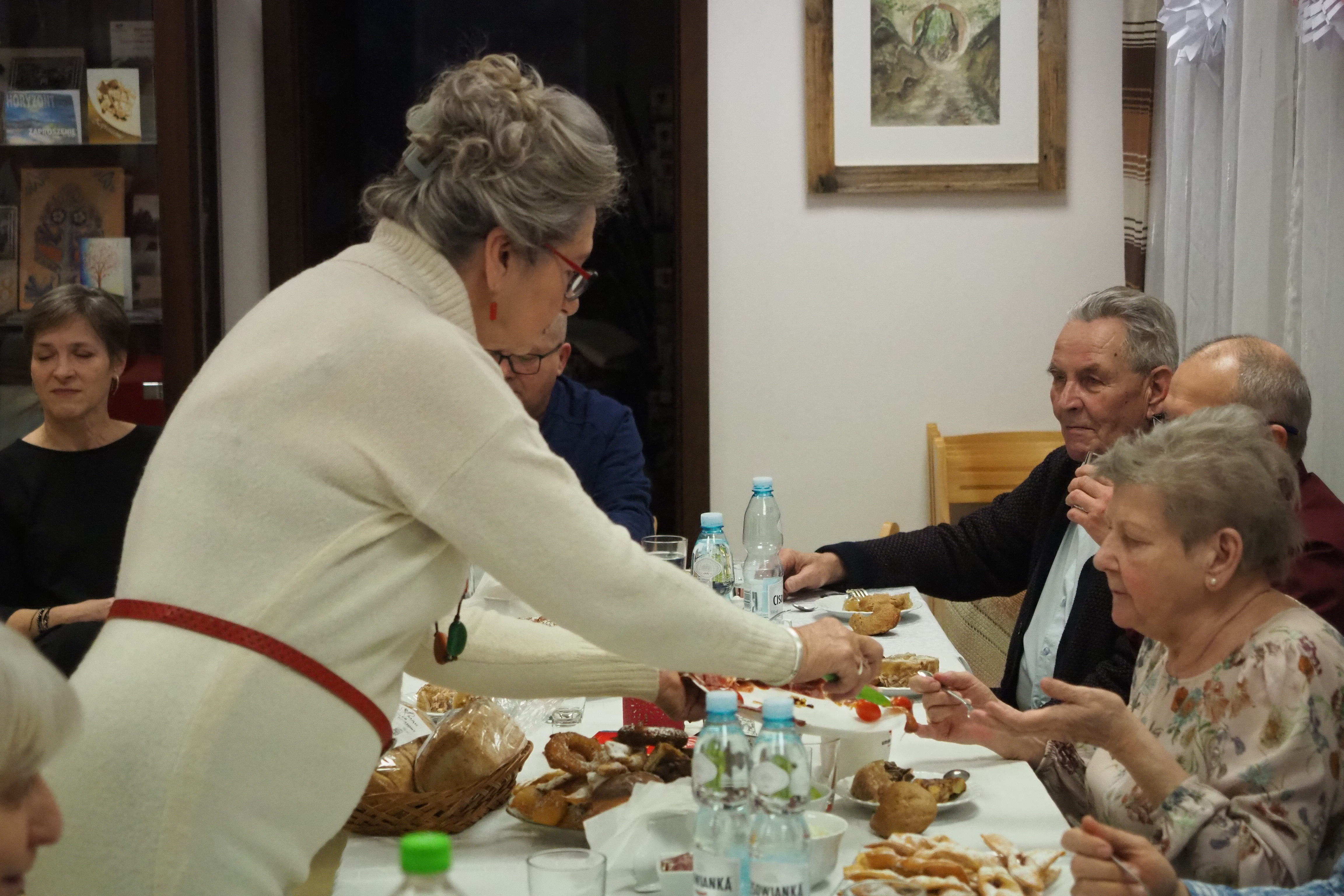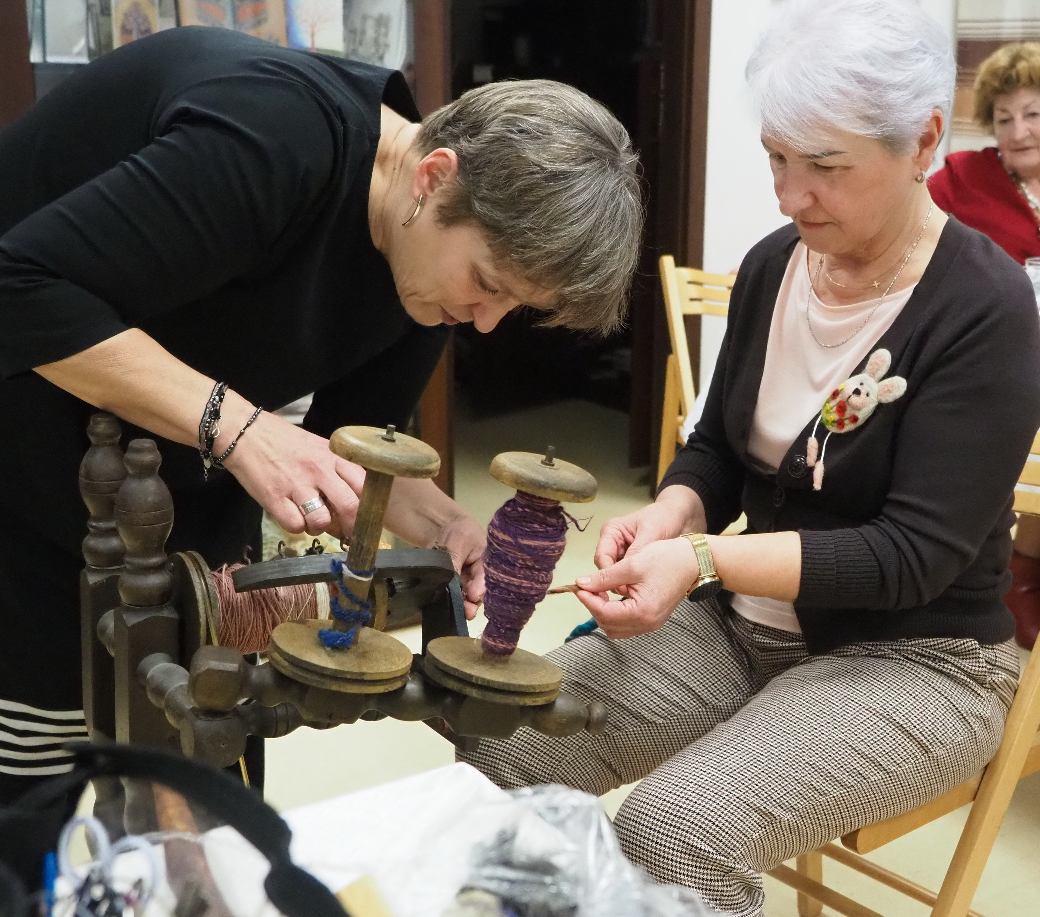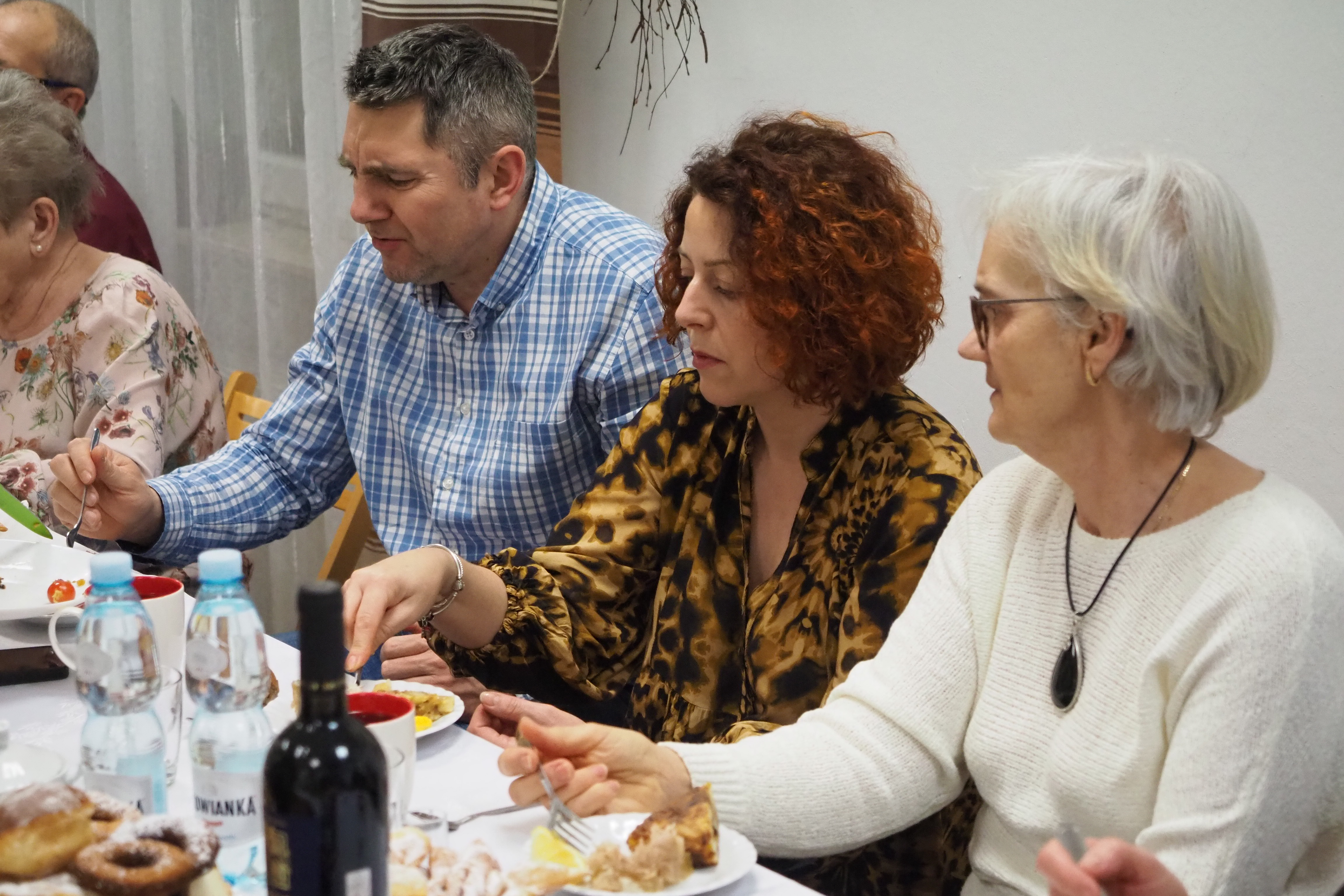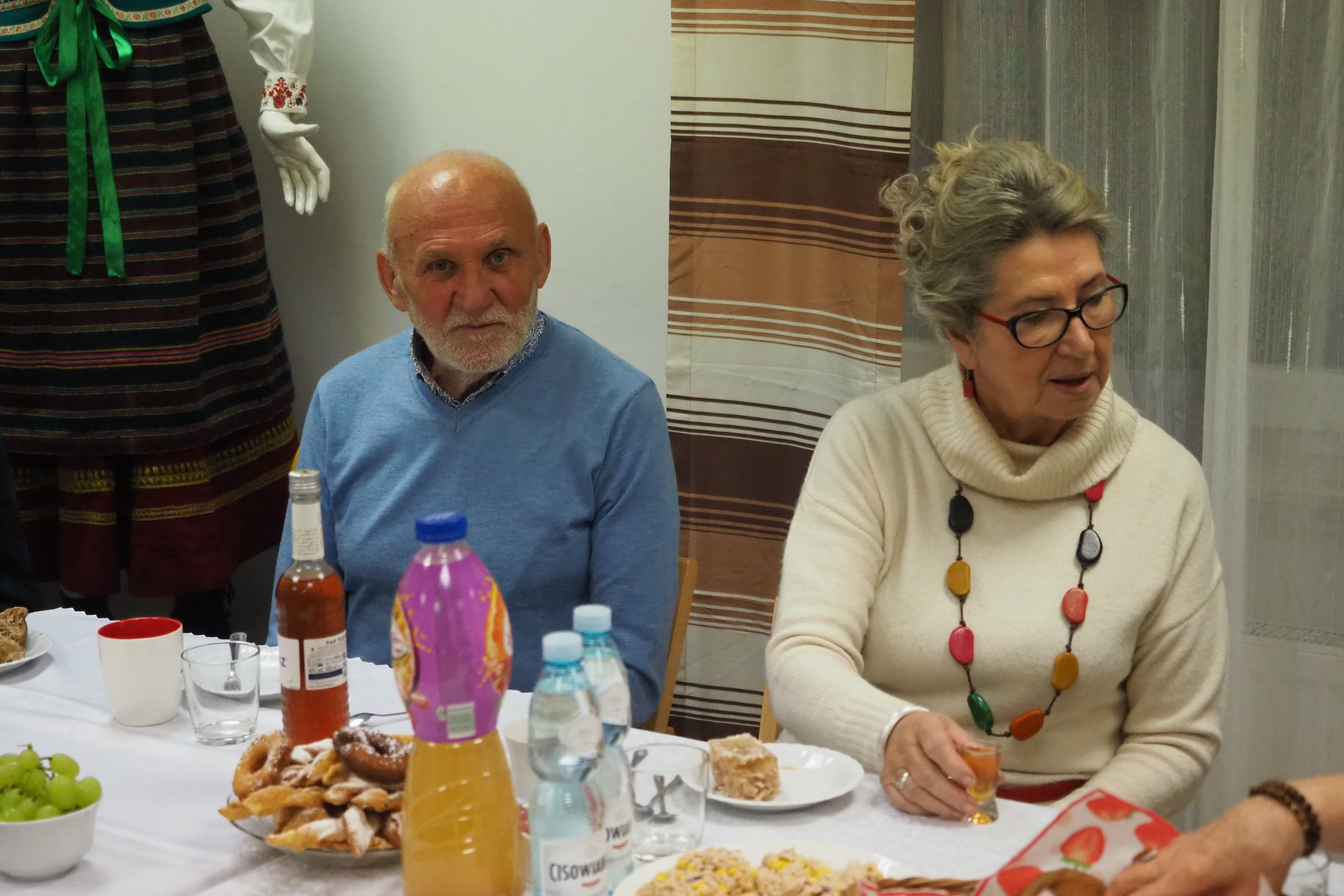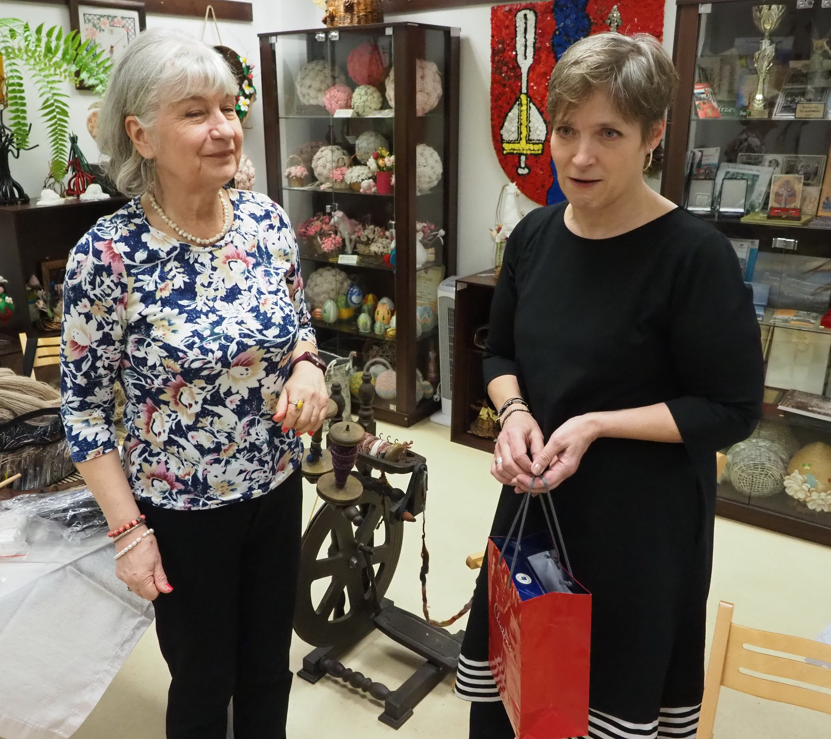 Dnia 12 lutego 2026 r. w Izbie Produktu Lokalnego zorganizowaliśmy tłusty czwartek. Stoły pełne smakołyków. Pączki, faworki, oponki i inne przysmaki. Atrakcją spotkania była prezentacja o tytule „Od owieczki do czapeczki” przygotowana przez nasza koleżankę Dorotę Skibińską. Czy zastanawialiście się kiedyś, czemu nasze babcie tak dbały o odzież ? O każdy ręcznik, ścierkę, koc? Dlaczego tak pieczołowicie, cerowały skarpety, łatały portki, pruły stare swetry ? Szanowały każdy ścinek i przerabiały aż do całkowitego zniszczenia ? Koleżanka Dorota przybliżyła nam proces powstawania tkanin w czasach, kiedy kobiety robiły większość samodzielnie. Przerabiały naturalne włókna roślinne - len, konopie, pokrzywę, igły sosny, a także włókna pochodzenia zwierzęcego – wełnę i włosie. Proces przygotowania kądzieli począwszy od wstępnego przebrania, żmudnego czyszczenia, prania, czesania, gręplowania, barwienia, a potem przędzenia na wrzecionie lub kołowrotku, aż do uzyskania równej nici, był bardzo pracochłonny i wymagał wiele pracy. A to jeszcze nie koniec – taką nić trzeba było przerobić poprzez utkanie na warsztacie tkackim lub dzianie na drutach czy szydełku. Koleżanka pokazała nam zasadę tkania – na miniaturowym warsztacie i na bardku. Pokazała również swoją wielką pasję dziewiarską, prezentując zestaw swoich drutów i szydełek wraz z akcesoriami, a także gotowe wyroby, wspominając przy tym Tych, którzy ją wprowadzali na tę drogę dziewiarskiego rękodzieła. Odważni mieli okazję spróbować przędzenia na starym kołowrotku, stanowiącym rodzinną pamiątkę.