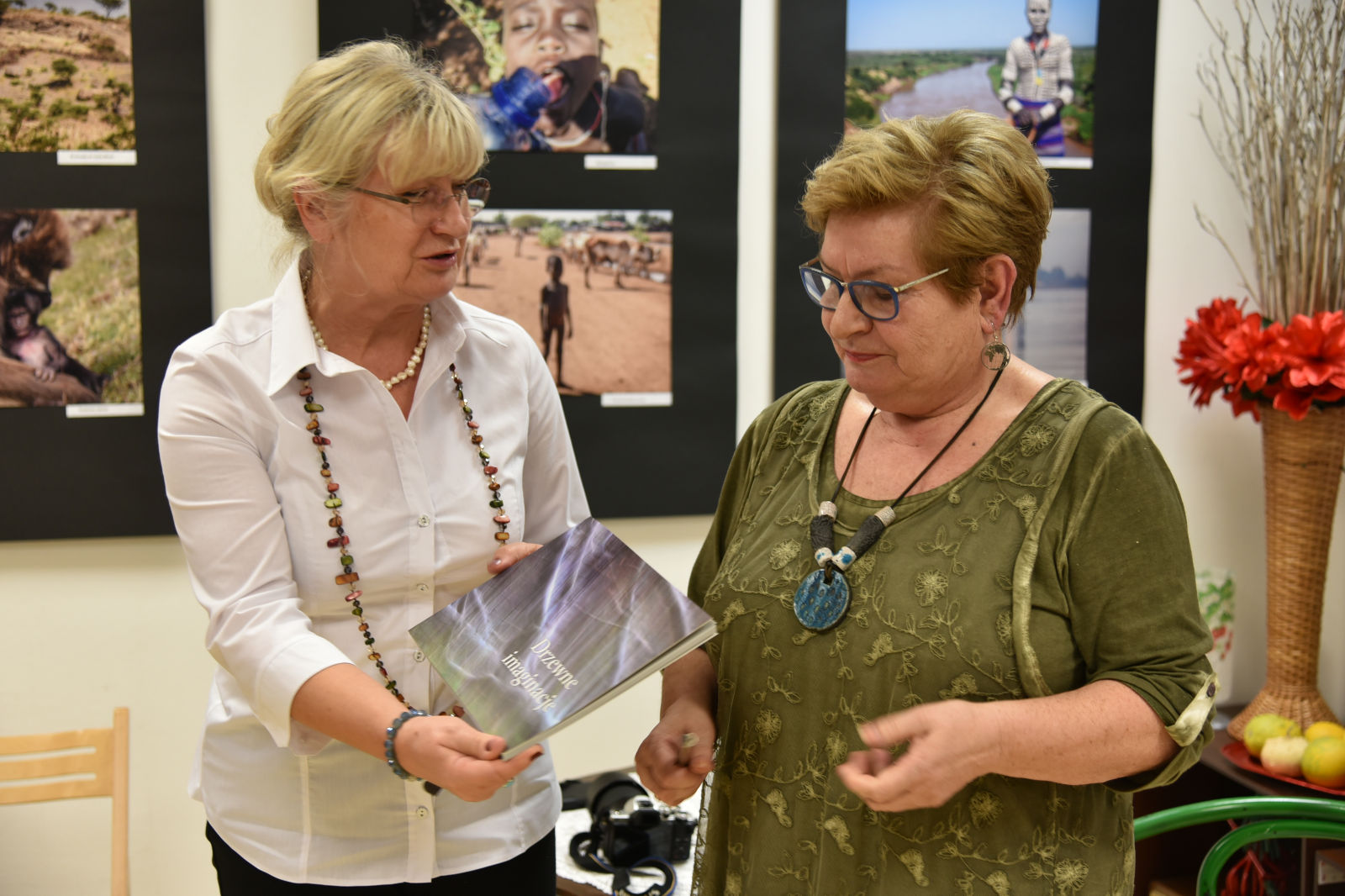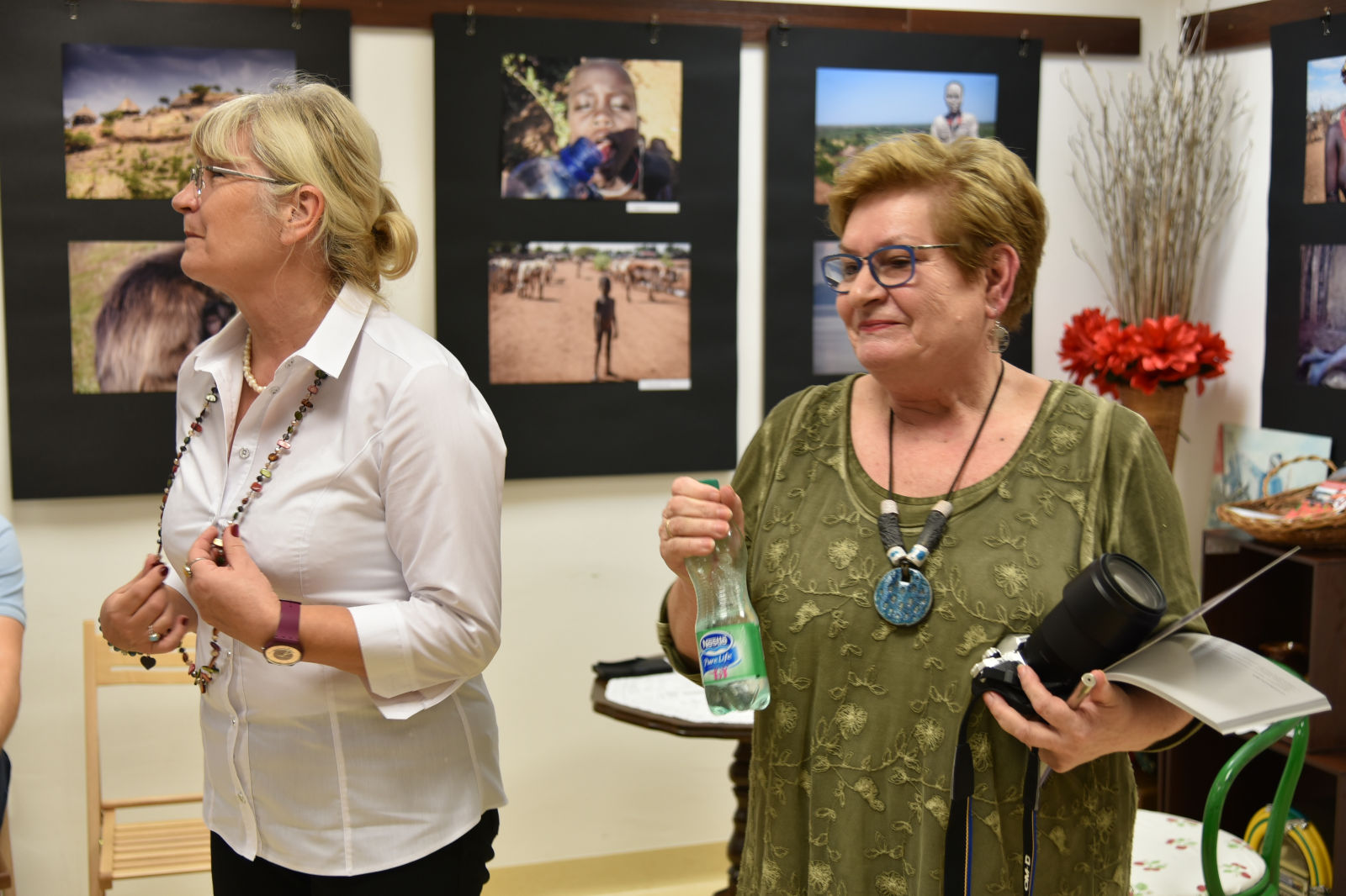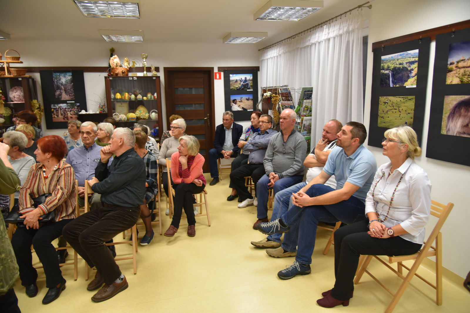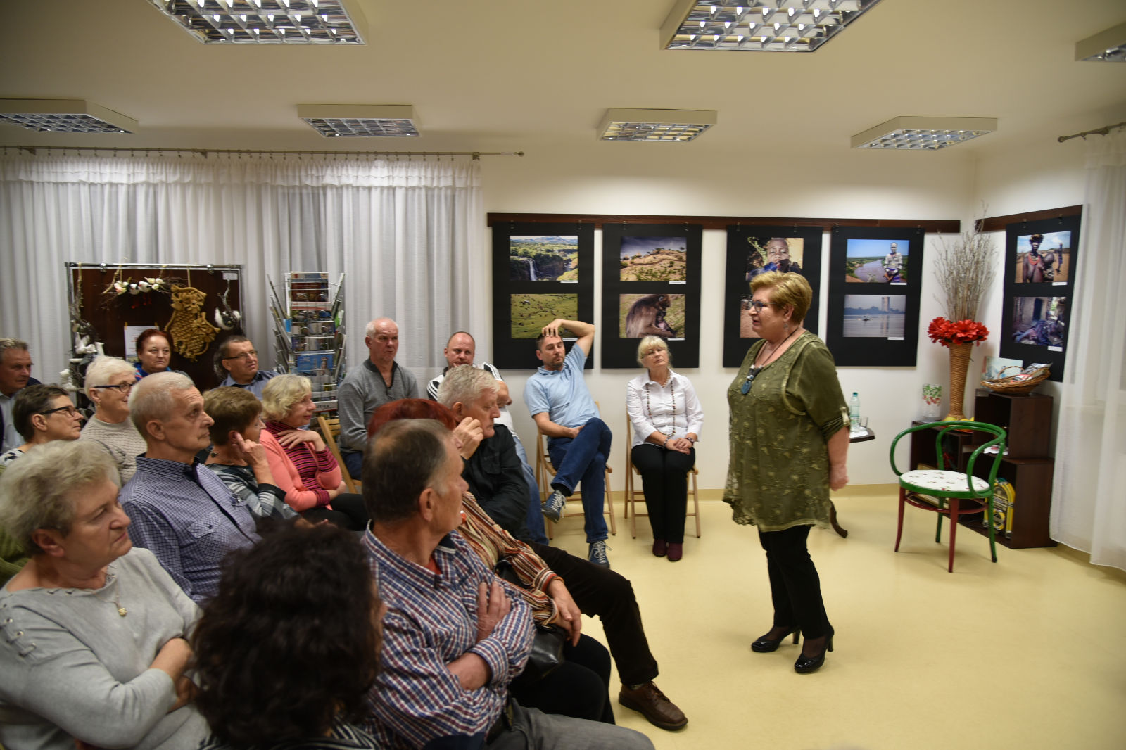 Życie pani Krystyny jest pasjonującą podróżą po świecie. Podąża w różne kierunki świata, aby przeżywać przygody, doświadczać wrażeń z przypadkowych spotkań z ludźmi, poznawać przyrodę i życie jej mieszkańców. Te wszystkie odkrycia pilnie fotografuje, aby podzielić się nimi w czasie swoich wernisaży. Artystyczne zdjęcia pani Krystyny rozbudzają naszą wyobraźnię, a te dokumentalne wciągają w świat innych ludzi i zdaje się, że sami jesteśmy uczestnikami życia uchwyconego przez obiektyw aparatu. Oprócz doznań wzrokowych dostaliśmy od bohaterki wieczoru cudowną opowieść o Etiopii. Pani Krystyna odkryła przed nami wiele ciekawostek o życiu i pracy ludzi w tym gorącym kraju. Prawdą więc jest, że „podróże kształcą”, bo chociaż my odbywaliśmy na niby podróż do Etiopii, ale ile zobaczyliśmy, i ile się nauczyliśmy! Uroczy wernisaż stał się przyczynkiem do rozmów między nami o świecie, podróżach, krajobrazach i wyzwaniach. A to wszystko odbywało się w miłej atmosferze przy herbatce i ciasteczkach.