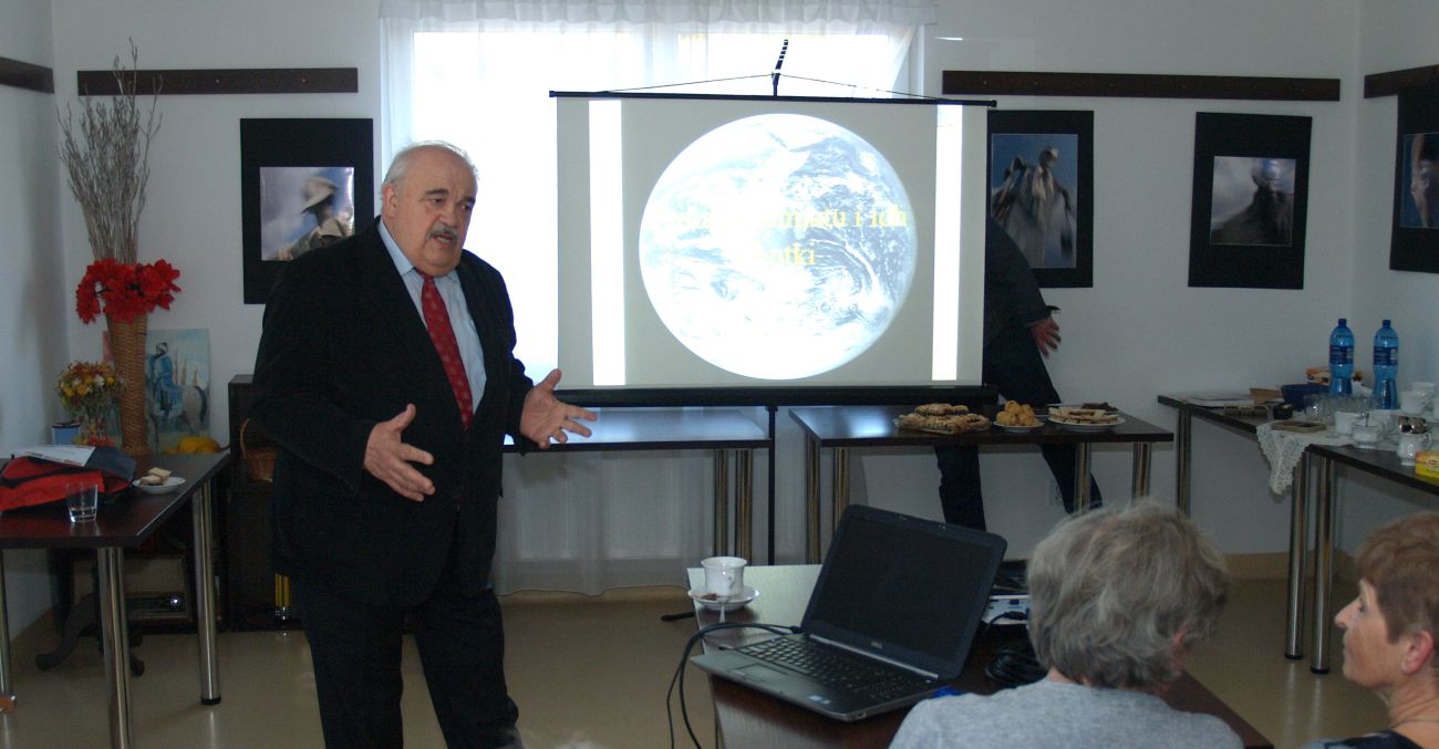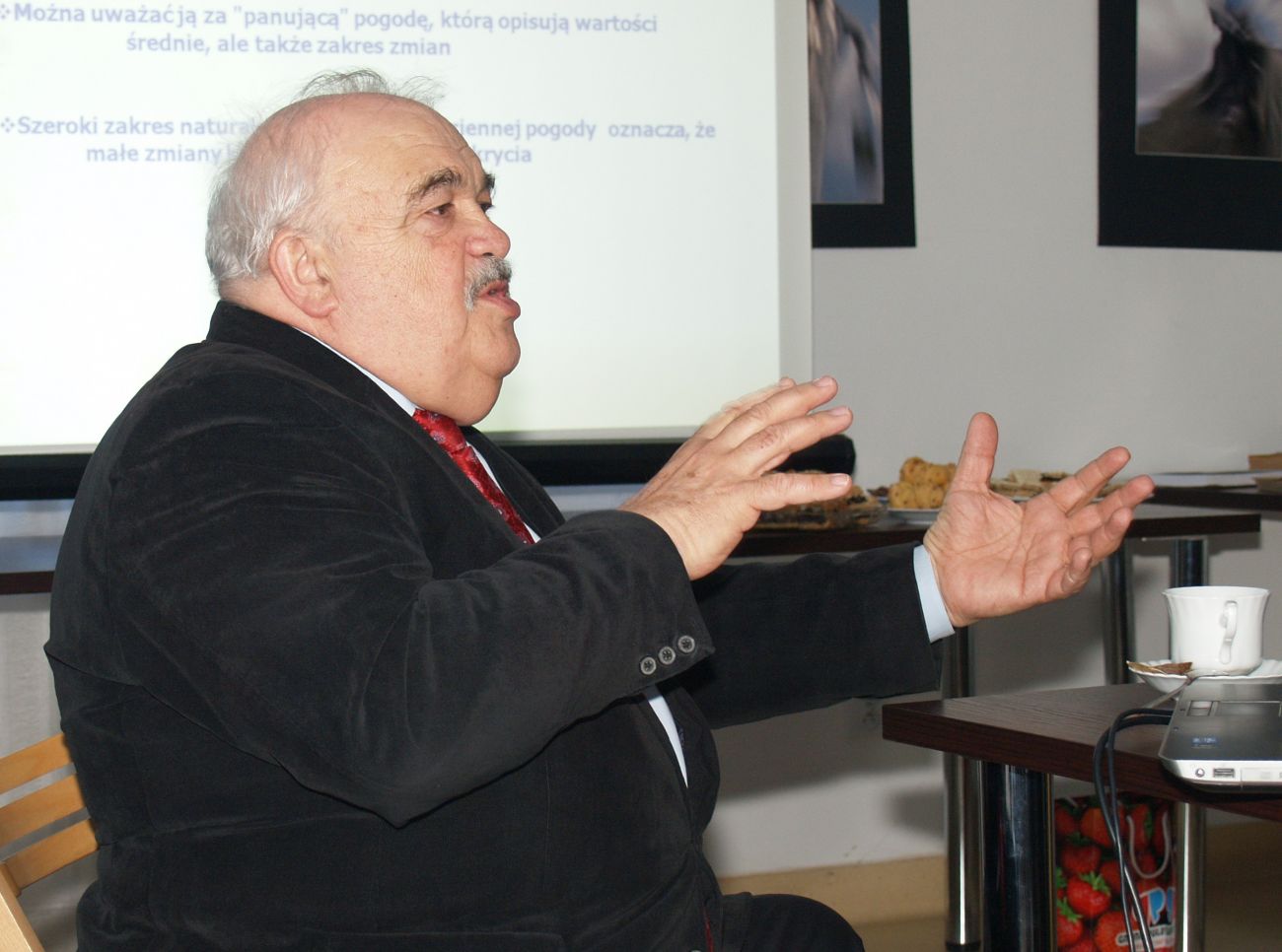 Obecna sytuacja klimatyczna zmusza niejednego człowieka do zastanowienia się, co czeka przyrodę i ludzi za kilkadziesiąt lat. Aby wyjaśnić wszystkie wątpliwości związane z przyszłym losem naszej planety, w pierwszy kwietniowy wtorek, w późnych godzinach popołudniowych, w Izbie Produktu Lokalnego zorganizowaliśmy spotkanie z kompetentną osobą, znawcą interesującego nas tematu. Gościliśmy prof. dr hab. - Pana Bogusława Kaszewskiego, który przyjął nasze zaproszenie oraz propozycję przeprowadzenia wykładu o zmianach klimatycznych na naszej planecie. Pan Bogusław Kaszewski jest wykładowcą oraz kierownikiem Zakładu Hydrologii i Klimatologii na UMCS w Lublinie.