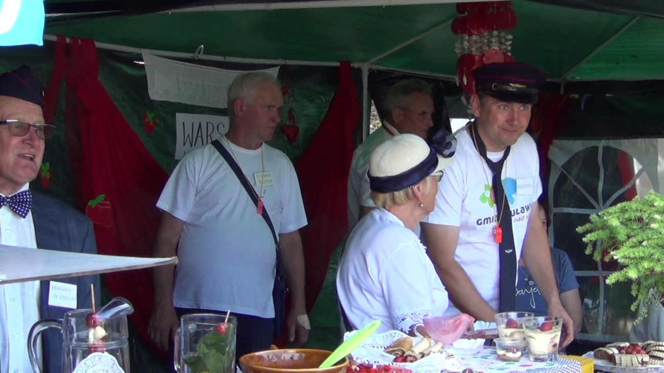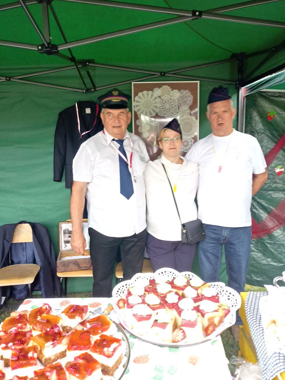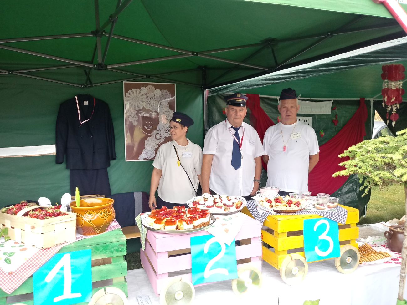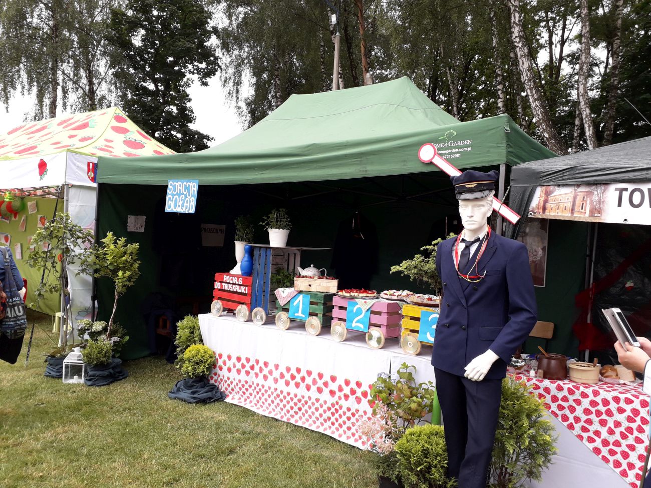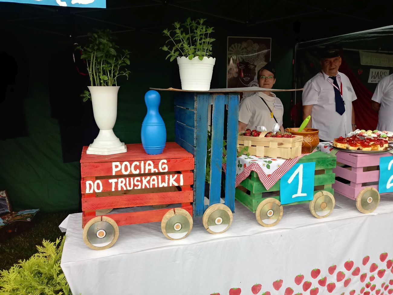 W centralnym punkcie naszego stoiska stanął kolorowy pociąg z trzema wagonami, wiozącymi truskawkowe smakołyki. Dyżurny ruchu pilnował porządku, tylko biedak niezdecydowany bardzo: dwie pary butów koło niego stały, a on boso, bo wybrać nie umiał. W przygotowanej poczekalni podróżni mogli schronić się przed deszczem, odpocząć, porozmawiać…. W przedziale WARS czekały przygotowane dania - każdy znalazł coś dla siebie.