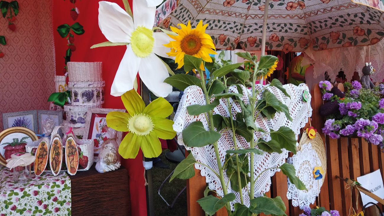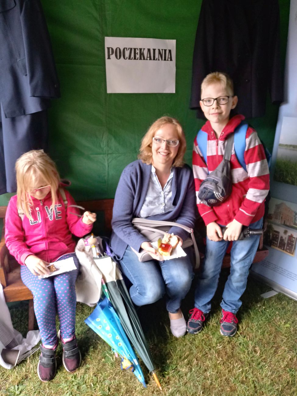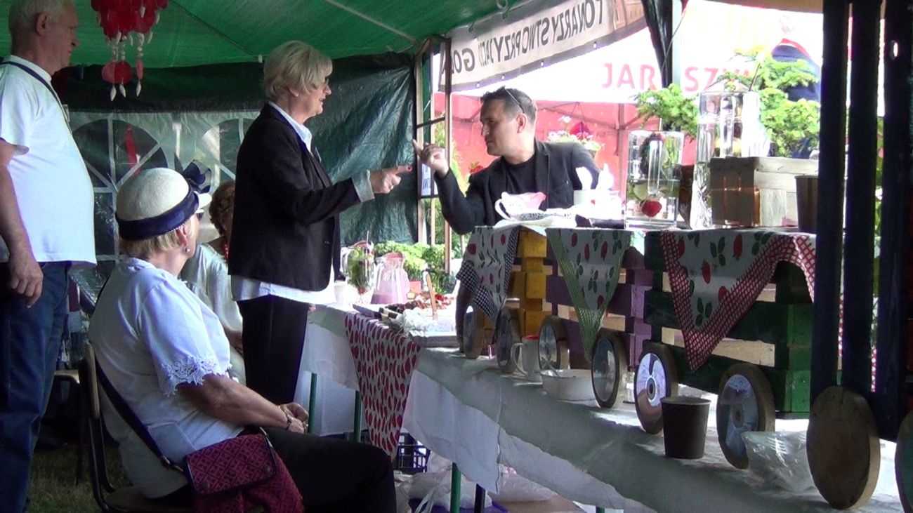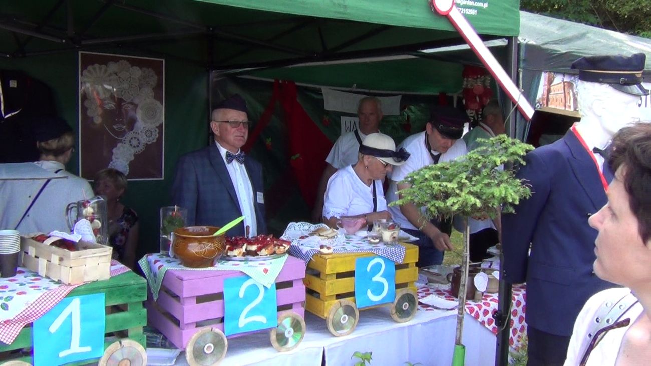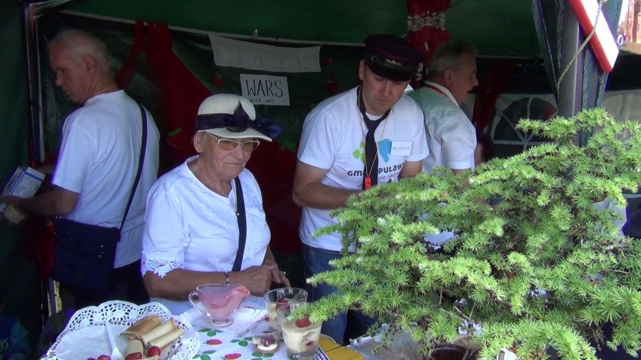 W centralnym punkcie naszego stoiska stanął kolorowy pociąg z trzema wagonami, wiozącymi truskawkowe smakołyki. Dyżurny ruchu pilnował porządku, tylko biedak niezdecydowany bardzo: dwie pary butów koło niego stały, a on boso, bo wybrać nie umiał. W przygotowanej poczekalni podróżni mogli schronić się przed deszczem, odpocząć, porozmawiać…. W przedziale WARS czekały przygotowane dania - każdy znalazł coś dla siebie.