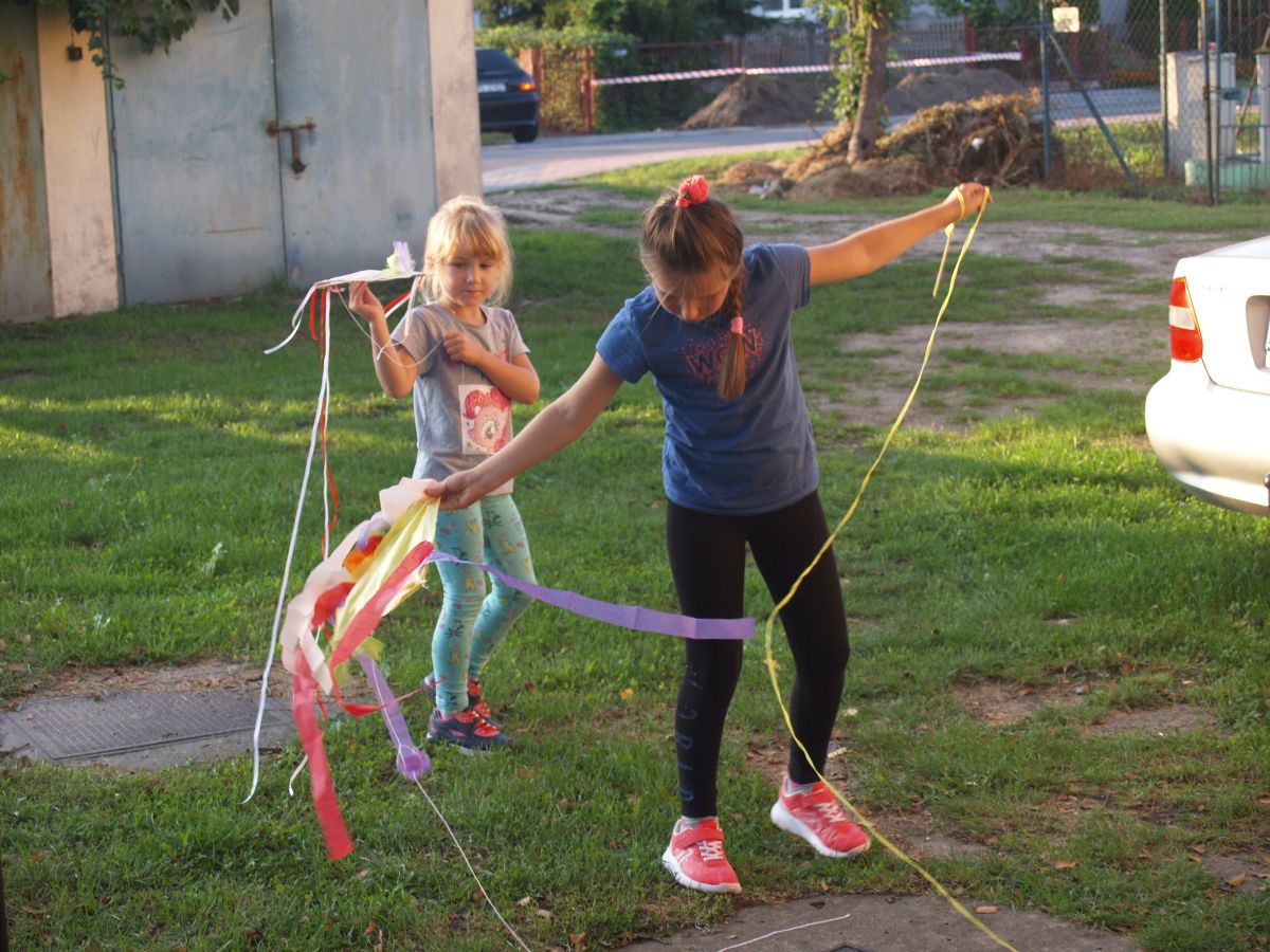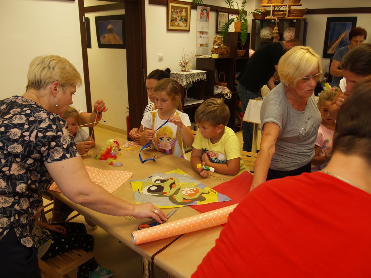 Podczas warsztatów robiliśmy samoloty i latawce. W Izbie zrobiło się gwarno i kolorowo. Fruwały różnokolorowe piórka, szeleściły folie i papiery, wiły się barwne wstążki. Przy robieniu latawców świetnie się bawili wszyscy, dzieci i ich opiekunowie oraz obecni członkowie TPG. Ciocie, babcie, dziadkowie i rodzice przypominali sobie, jak powinno się wiązać, zachować kształt, jak kleić, i swoją wiedzę przekazywali młodszym. Coraz było słychać „dłuższy ogon, ogon musi być długi”, „ mocniej wiąż”, „dłuższy sznurek weź”, „ten drut będzie za ciężki, poszukajmy lżejszego”….