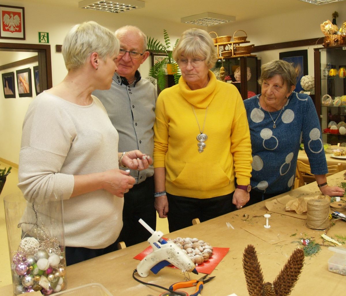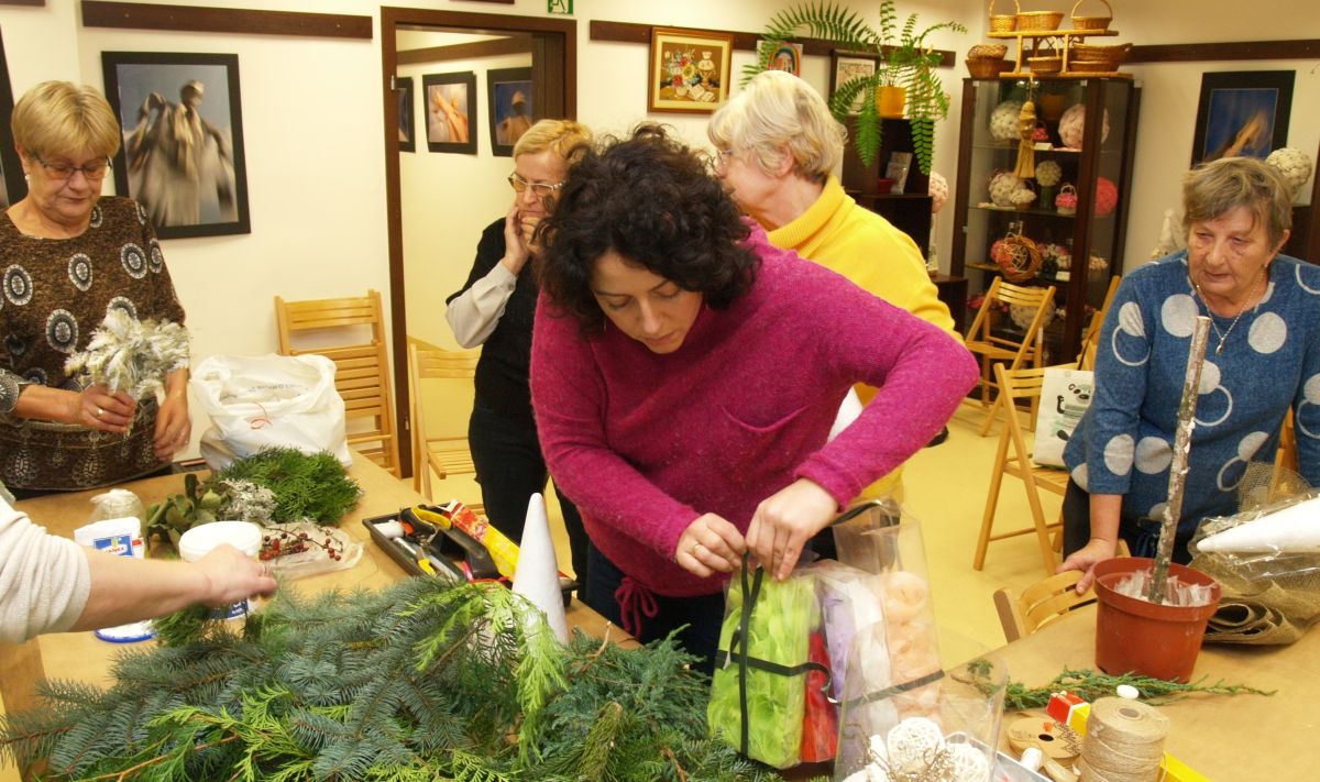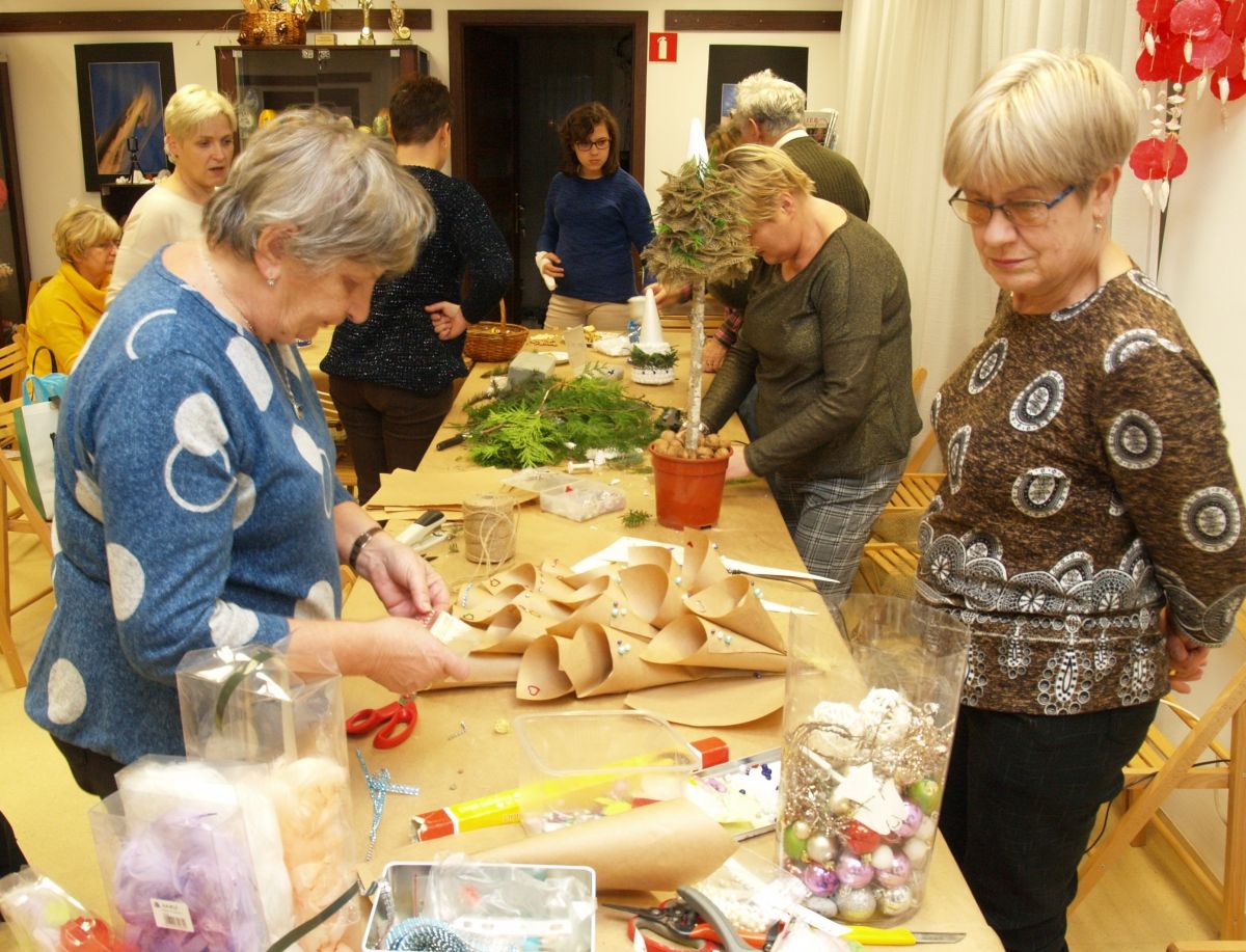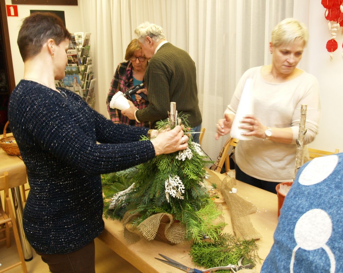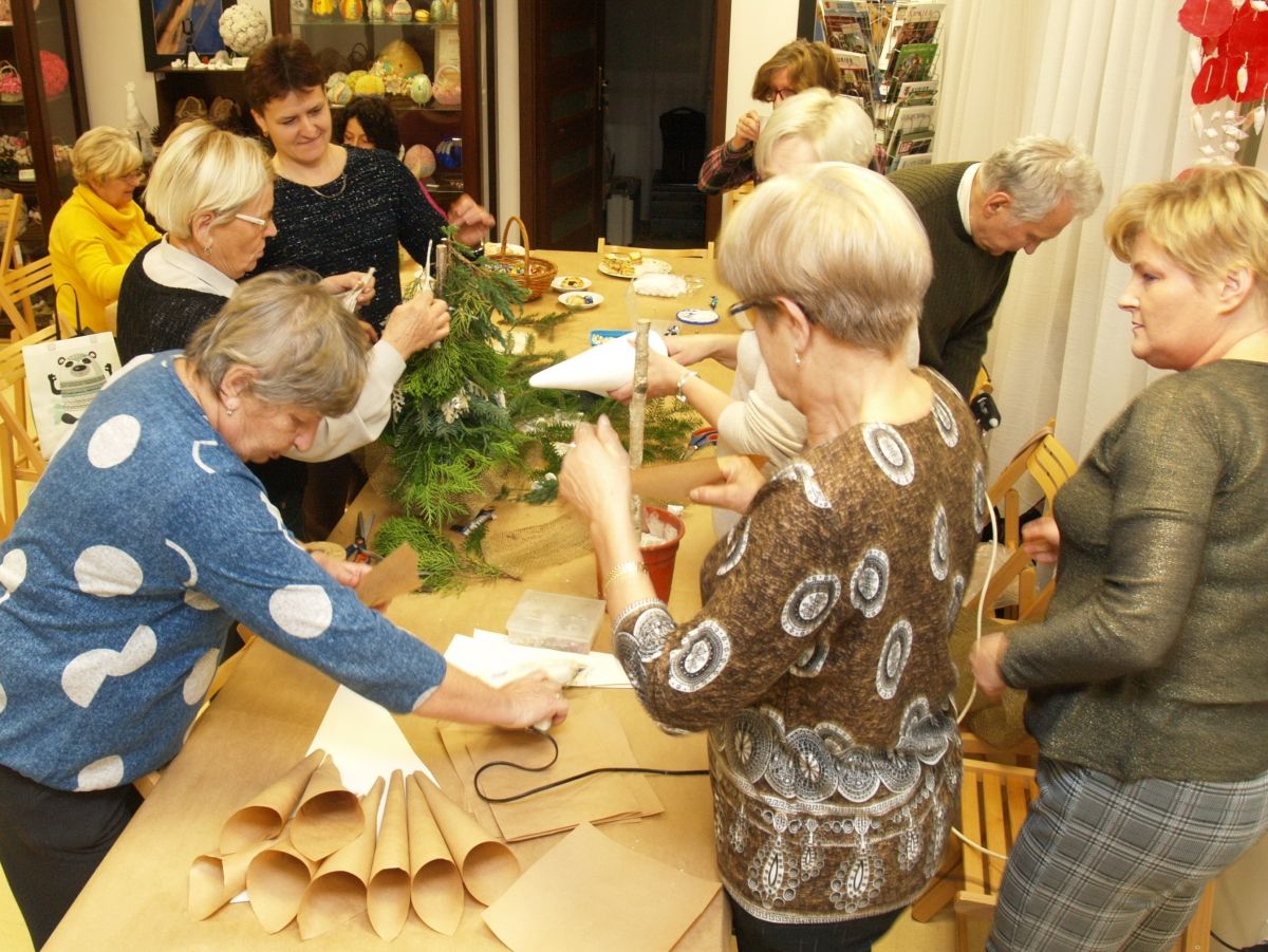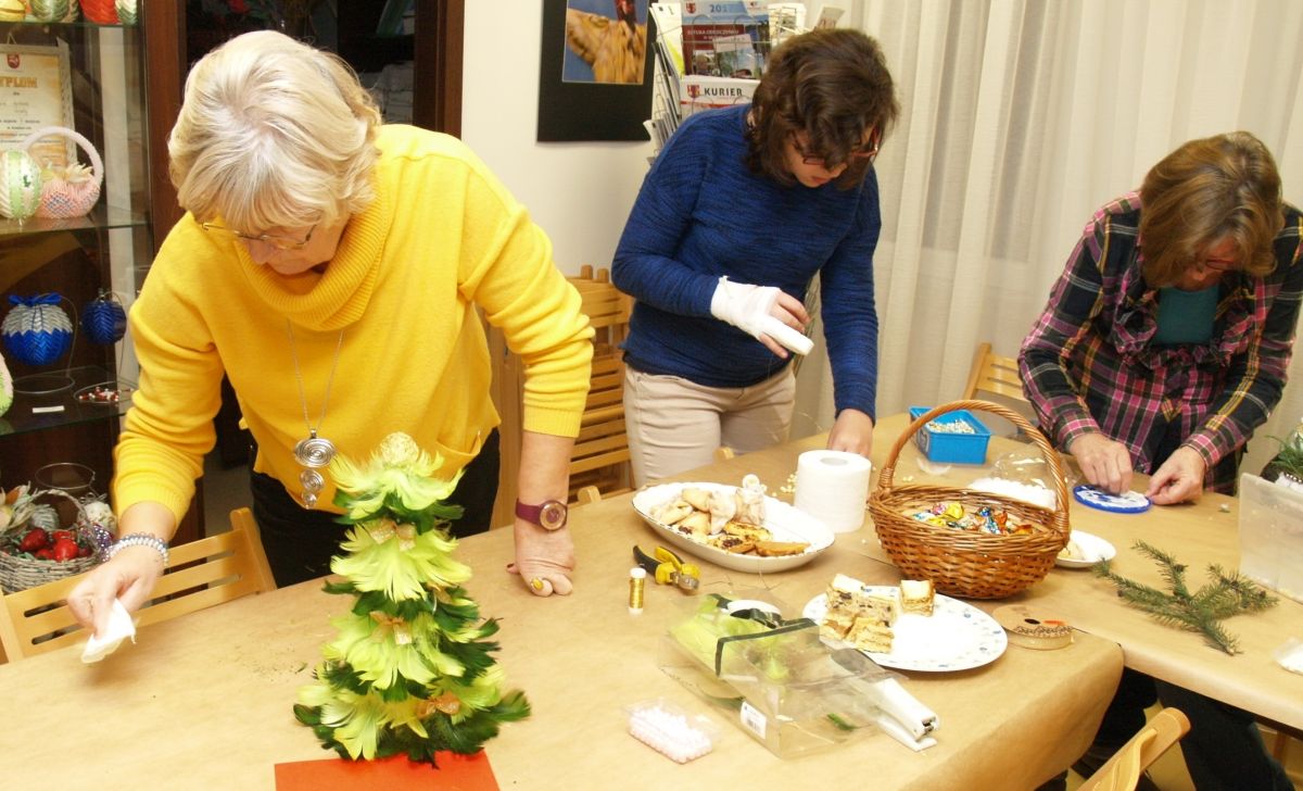 Od pięciu lat, co roku w każdy pierwszy wtorek grudnia, Towarzystwo Przyjaciół Gołębia jest organizatorem warsztatów dekoracji świątecznych w Izbie Produktu Lokalnego. Tak było i tym razem. Dnia 3 grudnia członkowie Towarzystwa wykonywali ozdoby choinkowe, stroiki na stół, wianki adwentowe i inne „cudeńka”. Zajęcia poprowadziły utalentowane plastycznie: Agnieszka Capała i Dorota Skibińska. One też przygotowały dla wszystkich niezbędne materiały potrzebne do pracy twórczej. Ochota, podekscytowanie i zaangażowanie w tworzeniu tych „dzieł” skromnych, acz cieszących oko, przeplatały się z żywicznym zapachem gałązek i wesołym śmiechem uczestników warsztatów.