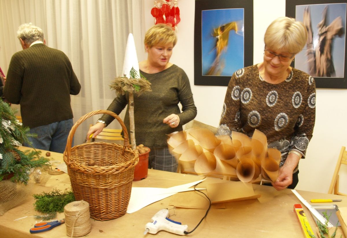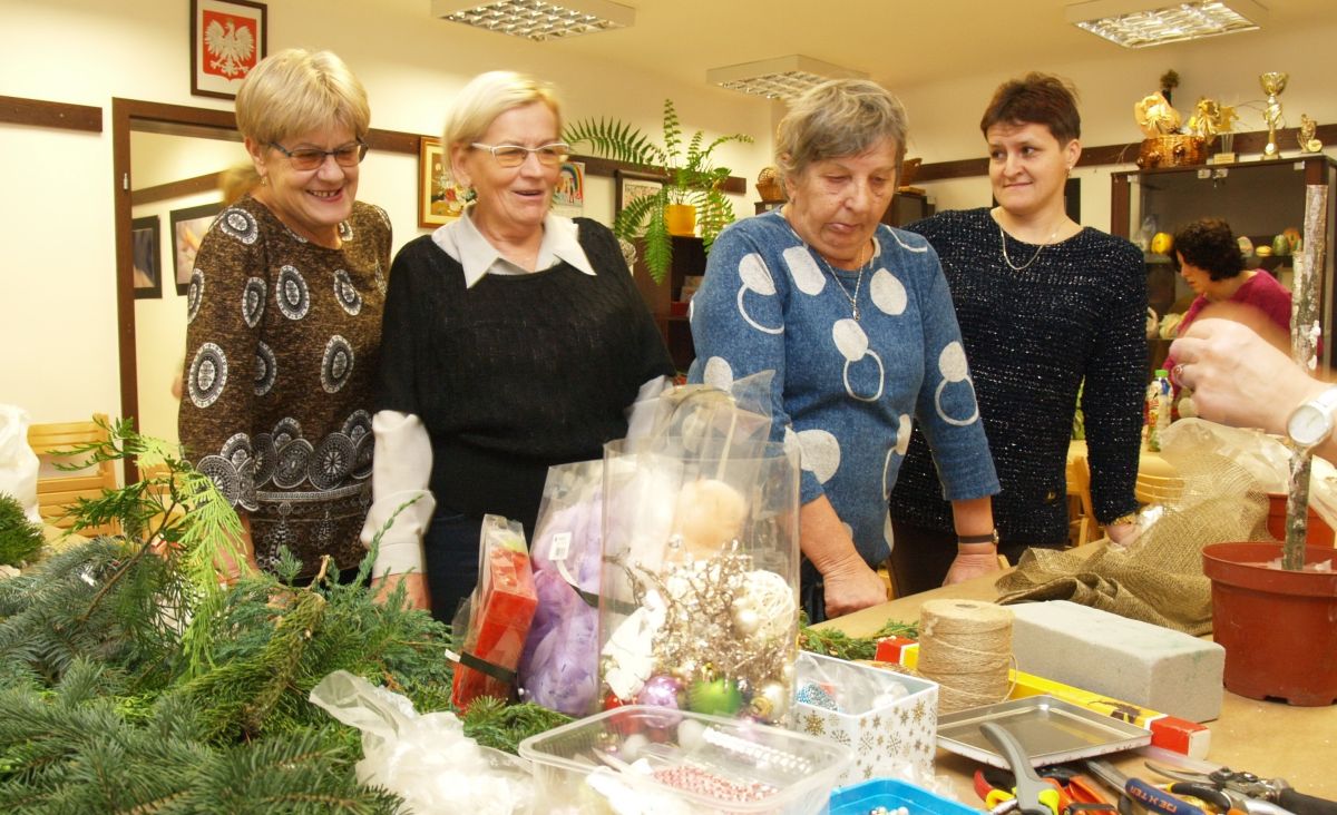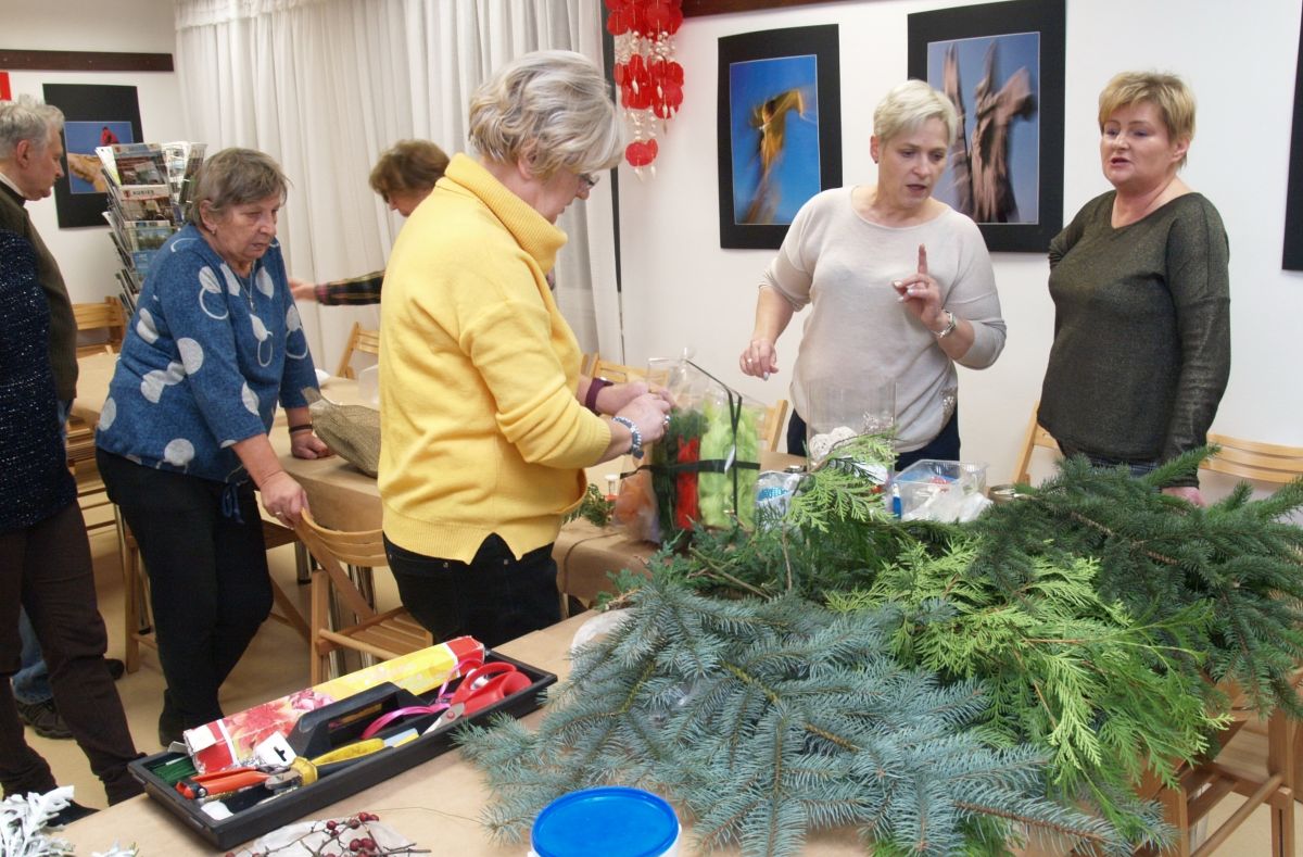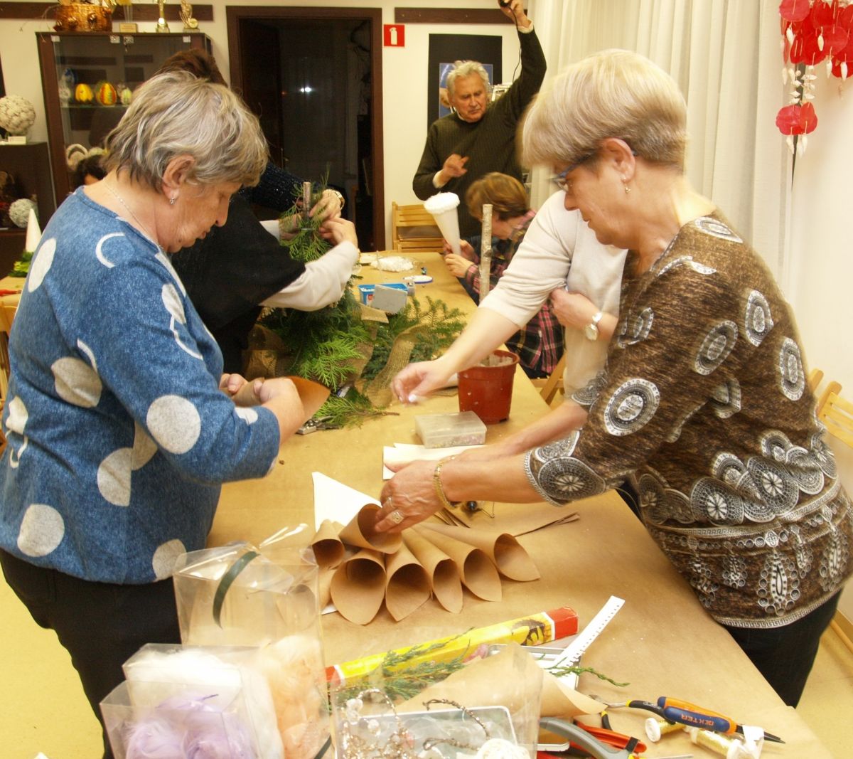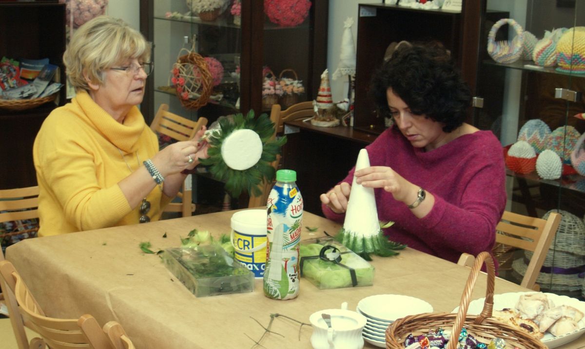 Od pięciu lat, co roku w każdy pierwszy wtorek grudnia, Towarzystwo Przyjaciół Gołębia jest organizatorem warsztatów dekoracji świątecznych w Izbie Produktu Lokalnego. Tak było i tym razem. Dnia 3 grudnia członkowie Towarzystwa wykonywali ozdoby choinkowe, stroiki na stół, wianki adwentowe i inne „cudeńka”. Zajęcia poprowadziły utalentowane plastycznie: Agnieszka Capała i Dorota Skibińska. One też przygotowały dla wszystkich niezbędne materiały potrzebne do pracy twórczej. Ochota, podekscytowanie i zaangażowanie w tworzeniu tych „dzieł” skromnych, acz cieszących oko, przeplatały się z żywicznym zapachem gałązek i wesołym śmiechem uczestników warsztatów.
