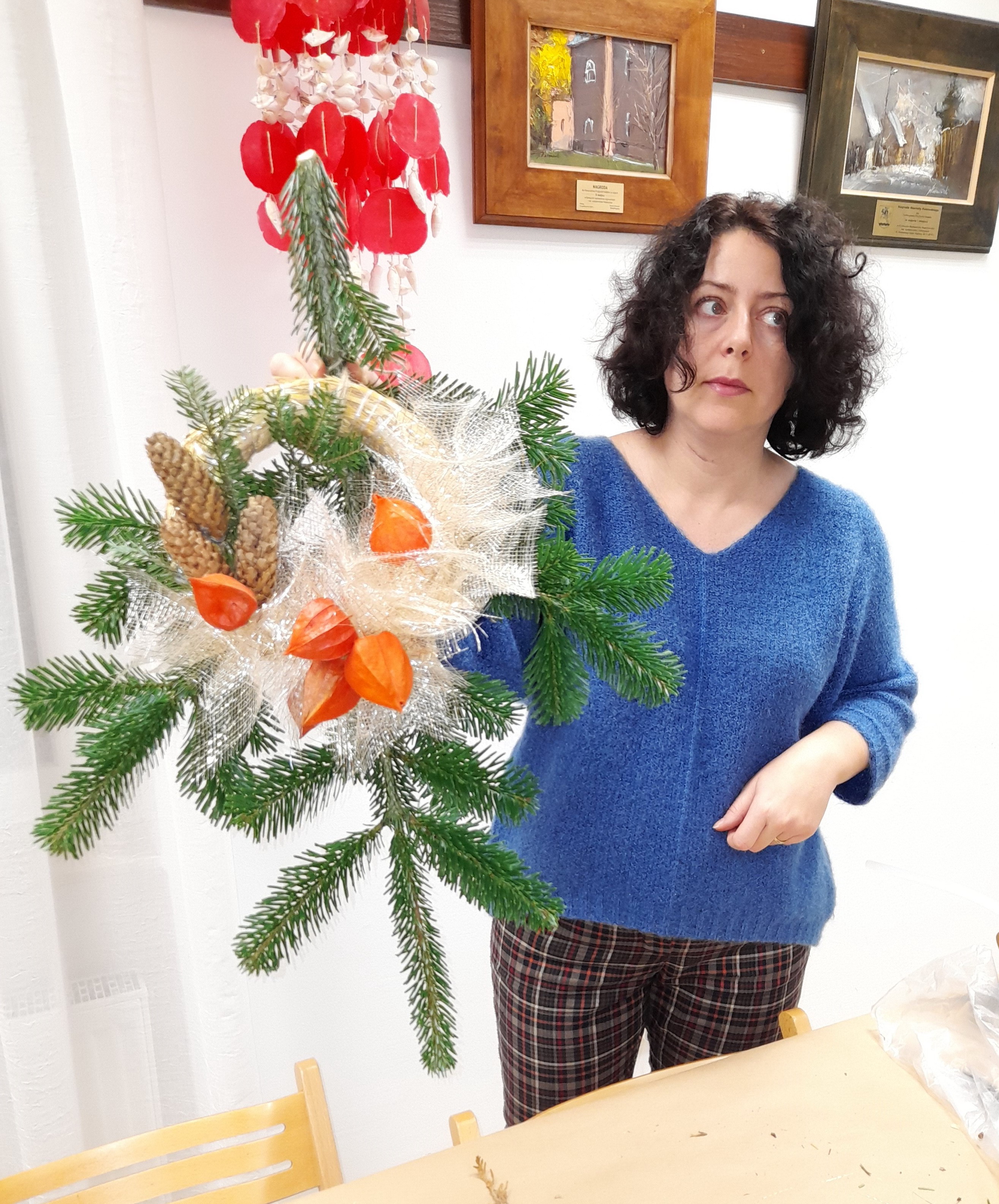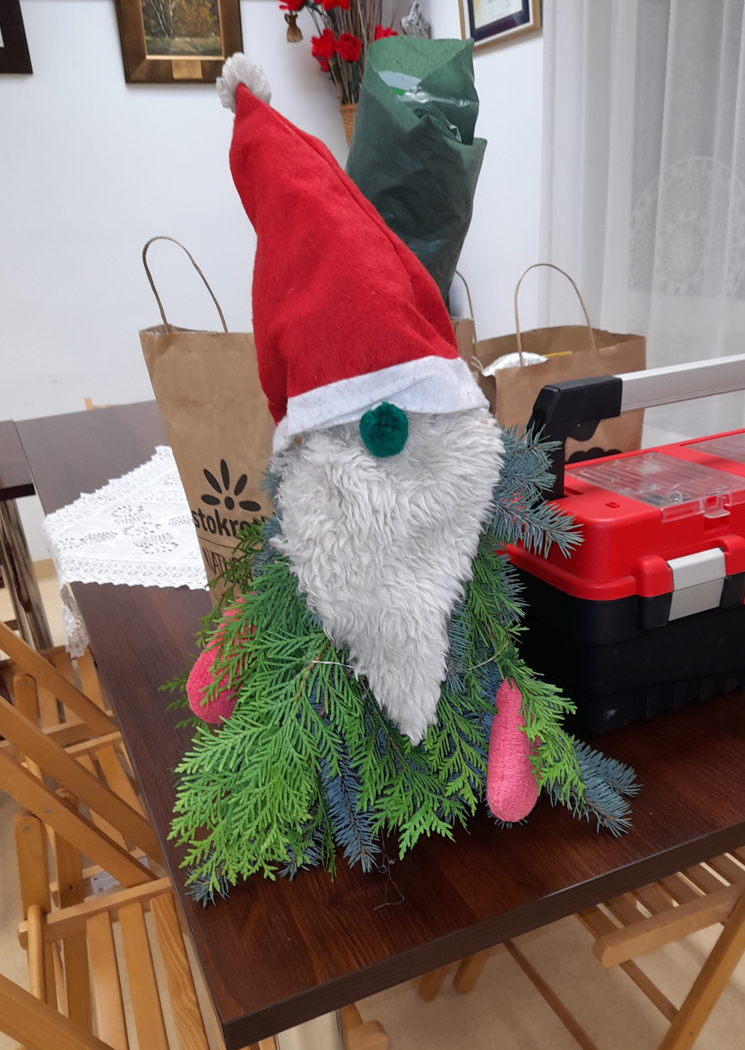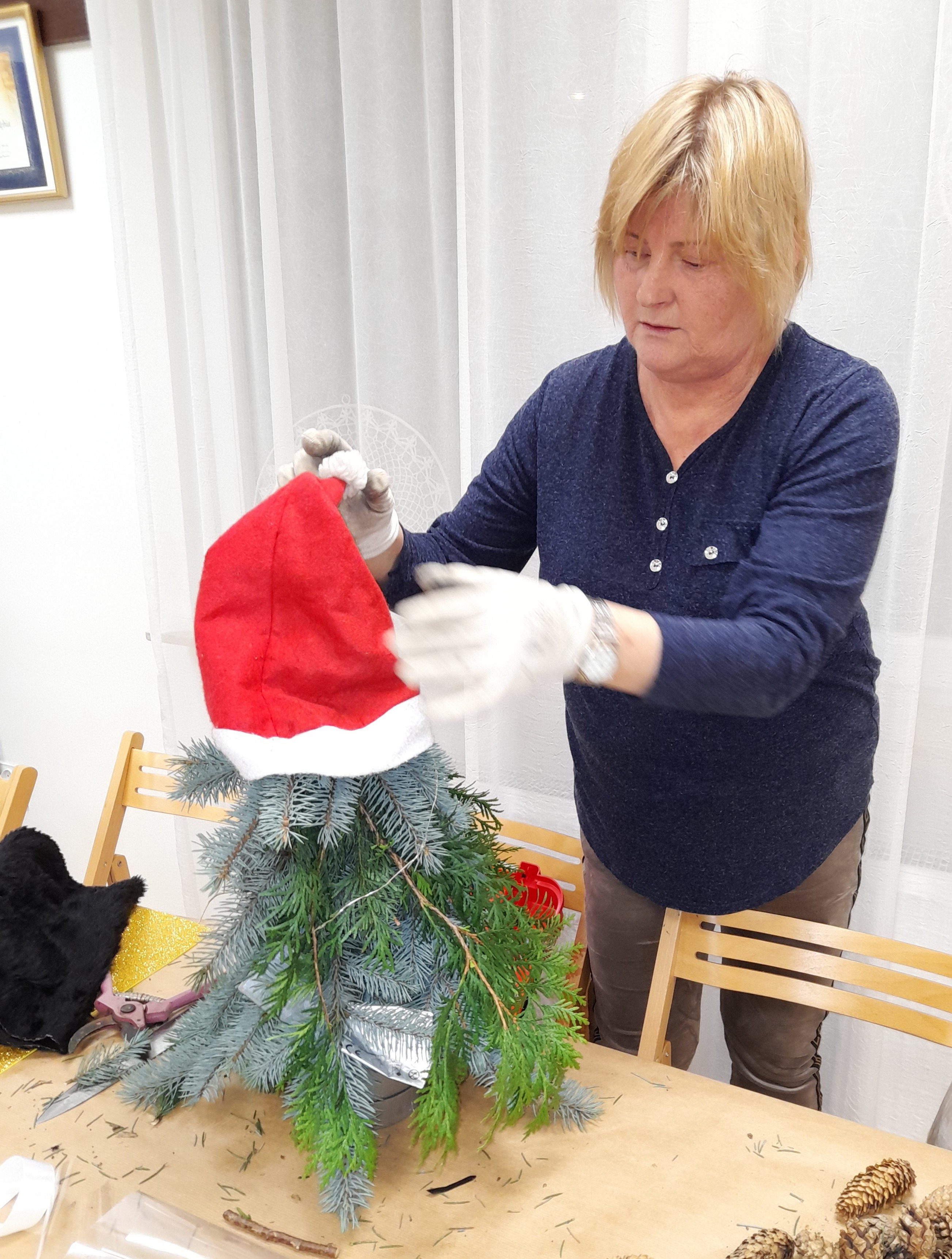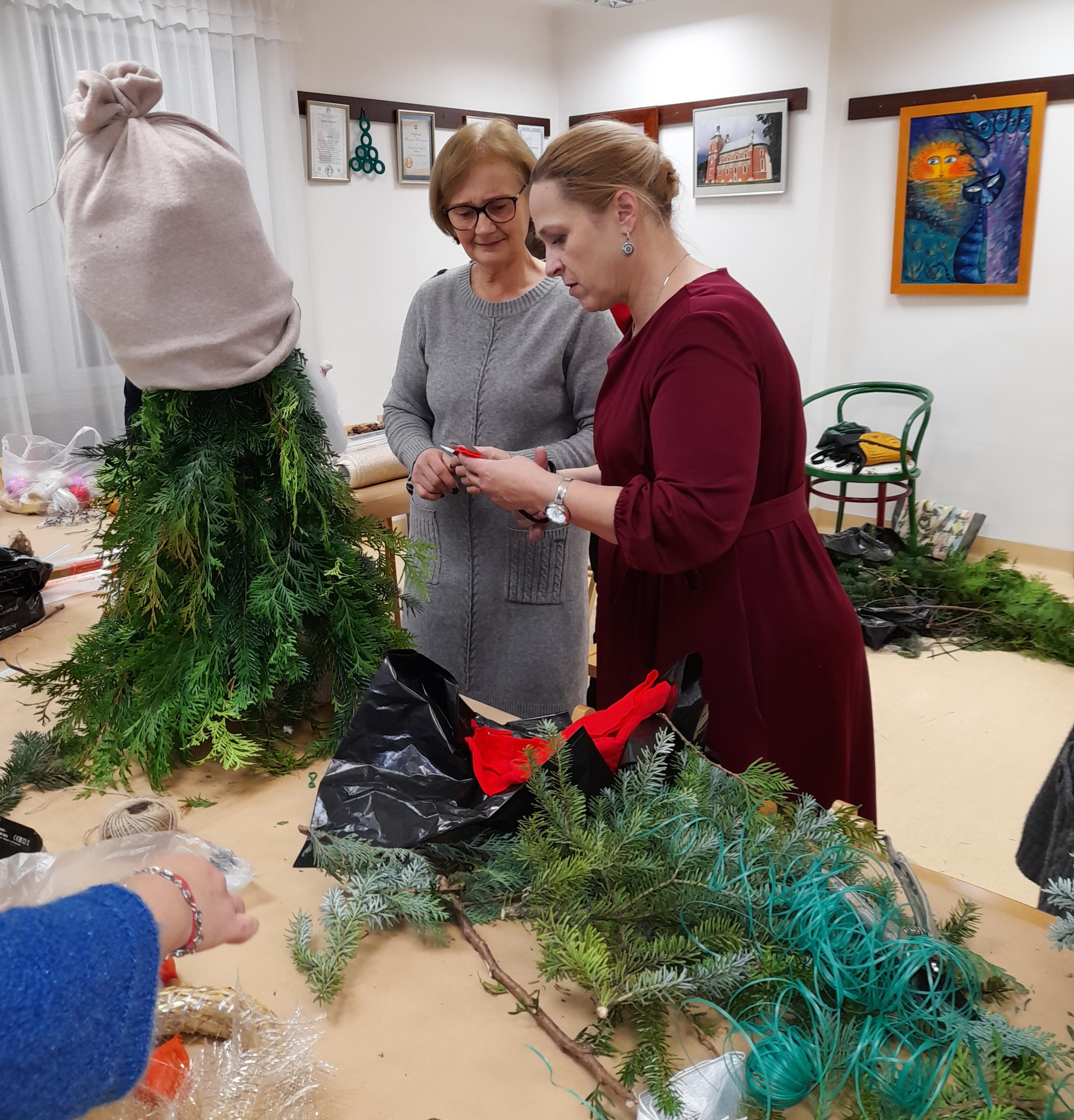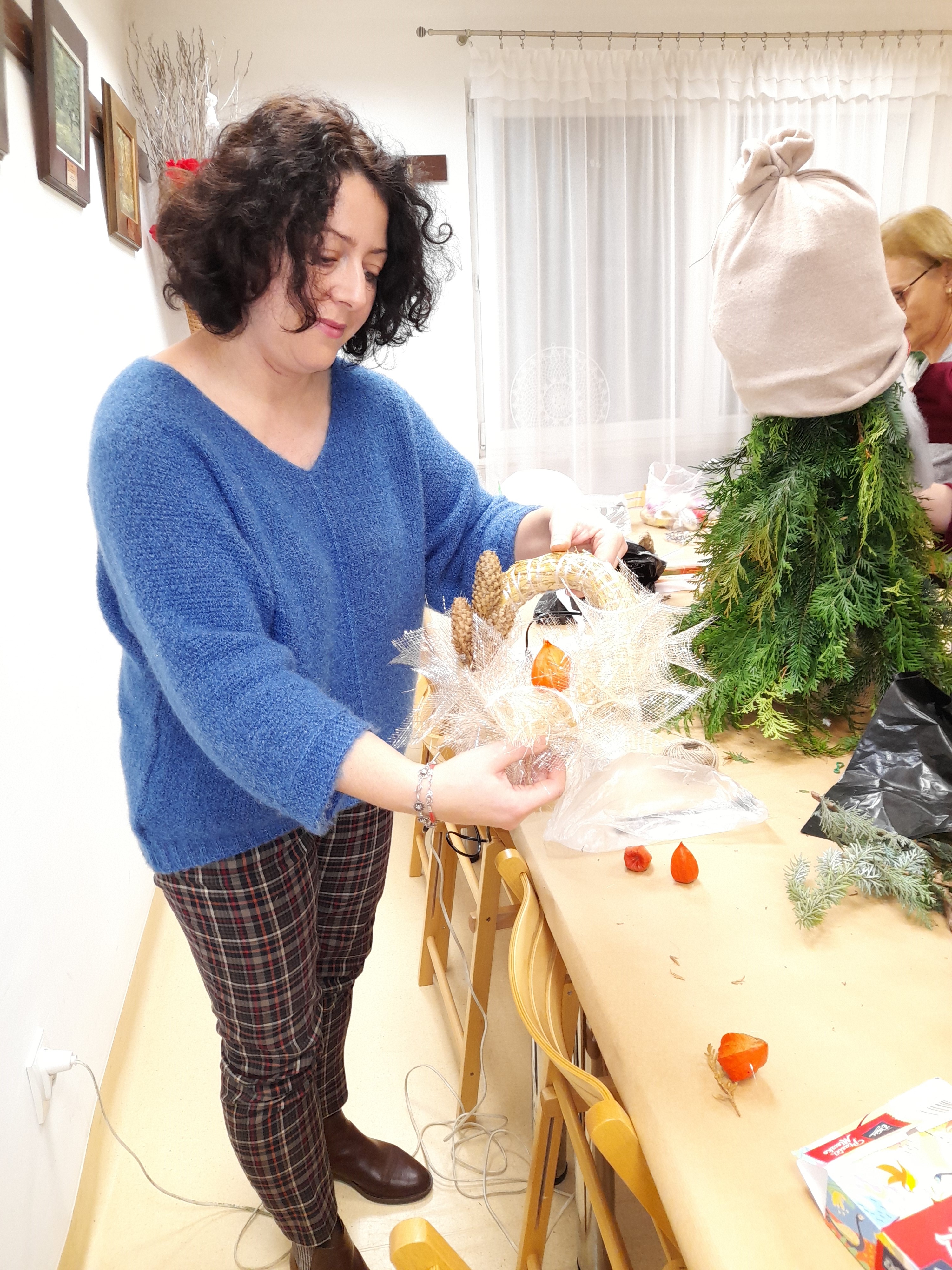 Zawitała prawdziwa zima. Pada śnieg. Jest bardzo zimno, mróz. Mimo to, spotkaliśmy się we wtorkowe popołudnie 13 grudnia „pamiętna data”, żeby tworzyć ozdoby świąteczne pod czujnym okiem Pani Doroty Skibińskiej. Pachniało świeżą choinką i zbliżającymi się świętami. Robiliśmy stroiki świąteczne, wianki na drzwi i skrzaty. Udekorowaliśmy Izbę Produktu Lokalnego świątecznymi dekoracjami. Było dużo zabawy i radości. Izbę wypełniał gwar i świąteczny nastrój. Uczestnicy warsztatów zabrali swoje „dzieła” do domu.