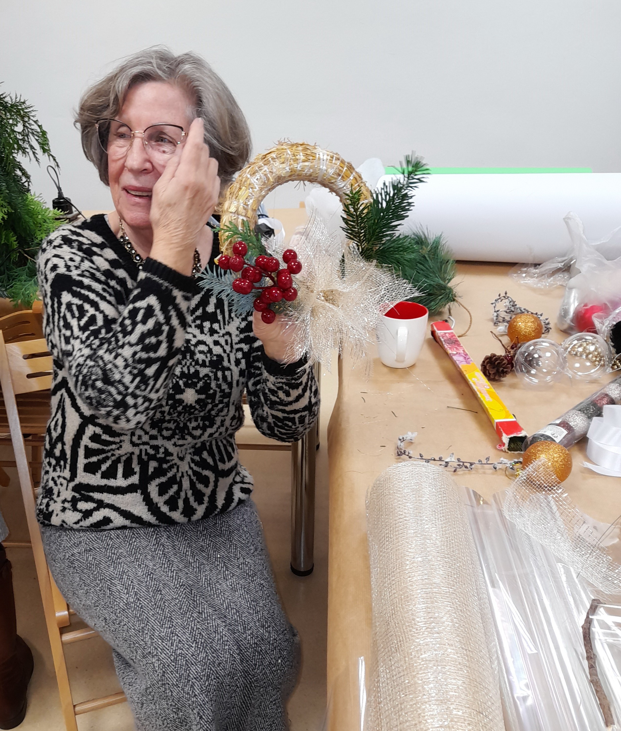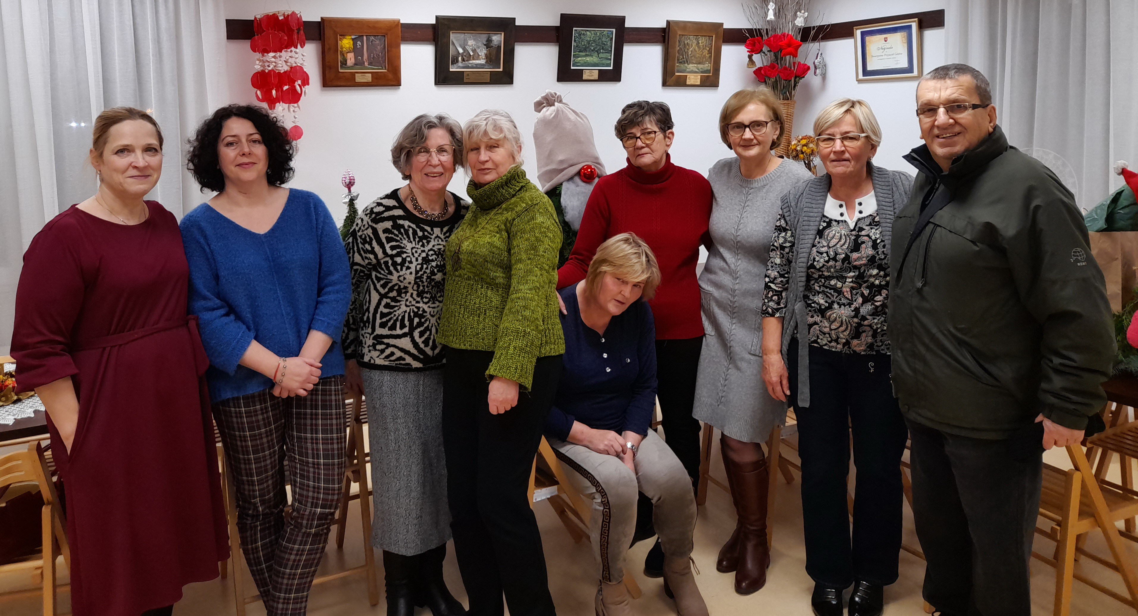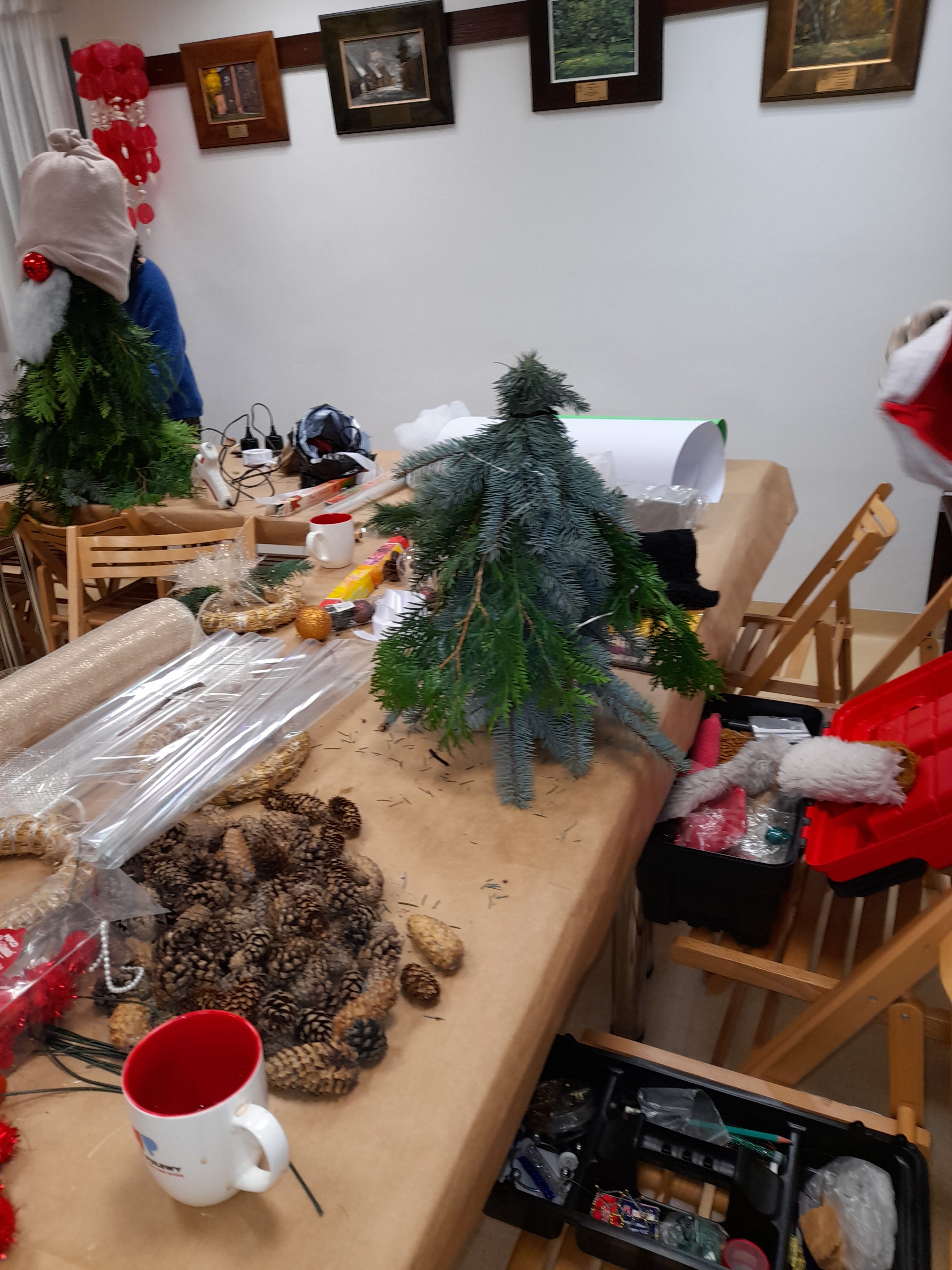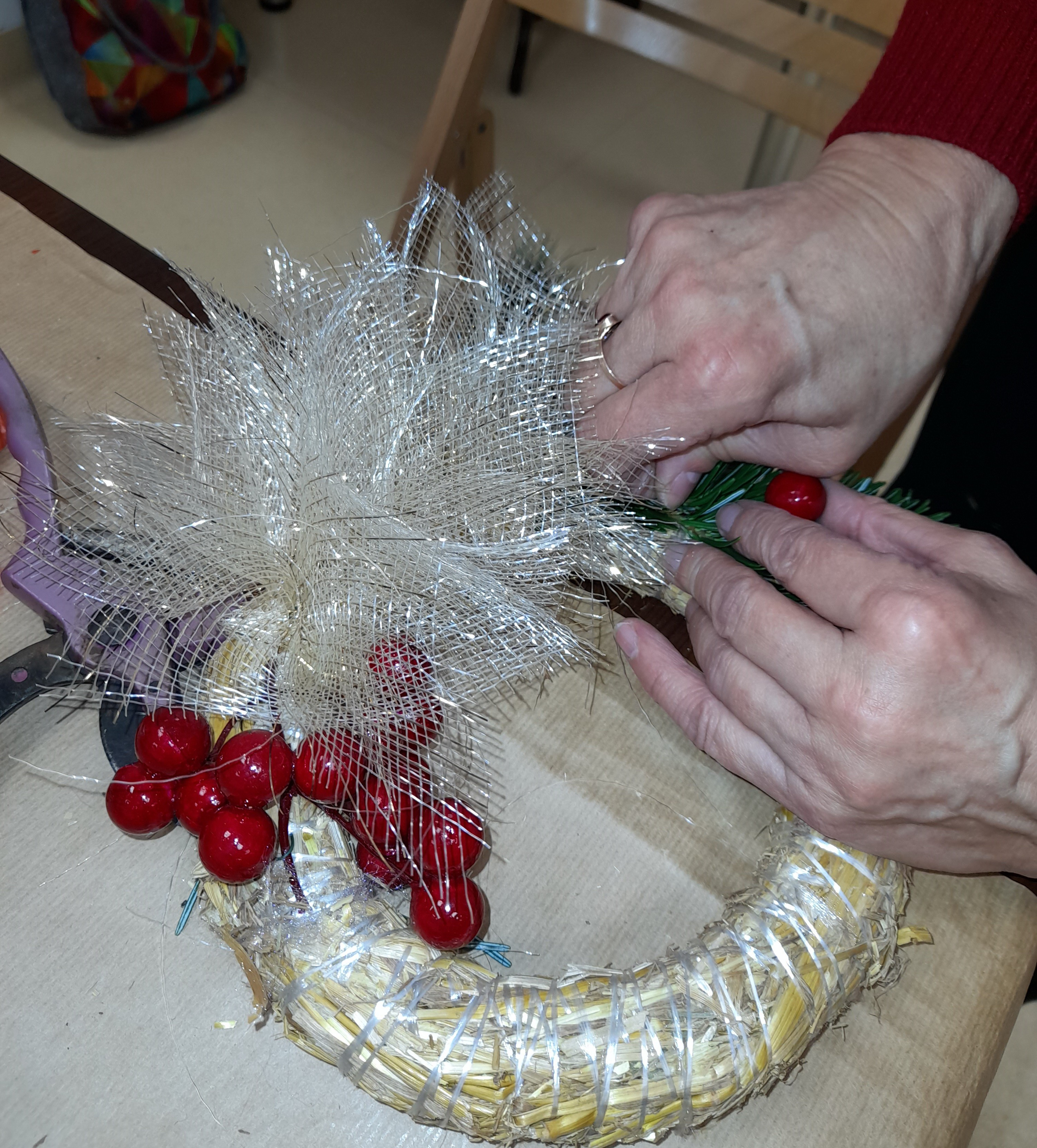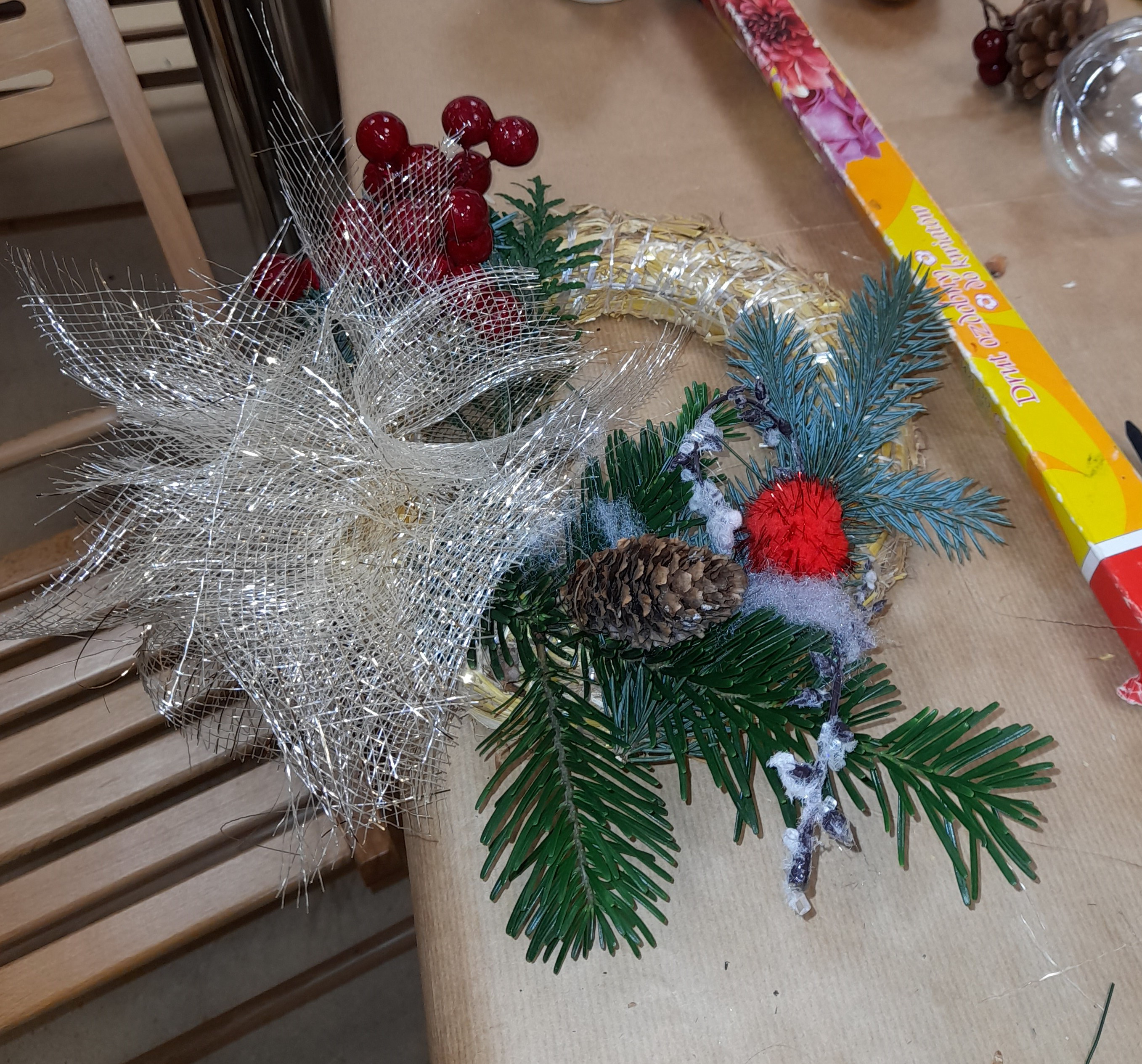 Zawitała prawdziwa zima. Pada śnieg. Jest bardzo zimno, mróz. Mimo to, spotkaliśmy się we wtorkowe popołudnie 13 grudnia „pamiętna data”, żeby tworzyć ozdoby świąteczne pod czujnym okiem Pani Doroty Skibińskiej. Pachniało świeżą choinką i zbliżającymi się świętami. Robiliśmy stroiki świąteczne, wianki na drzwi i skrzaty. Udekorowaliśmy Izbę Produktu Lokalnego świątecznymi dekoracjami. Było dużo zabawy i radości. Izbę wypełniał gwar i świąteczny nastrój. Uczestnicy warsztatów zabrali swoje „dzieła” do domu.