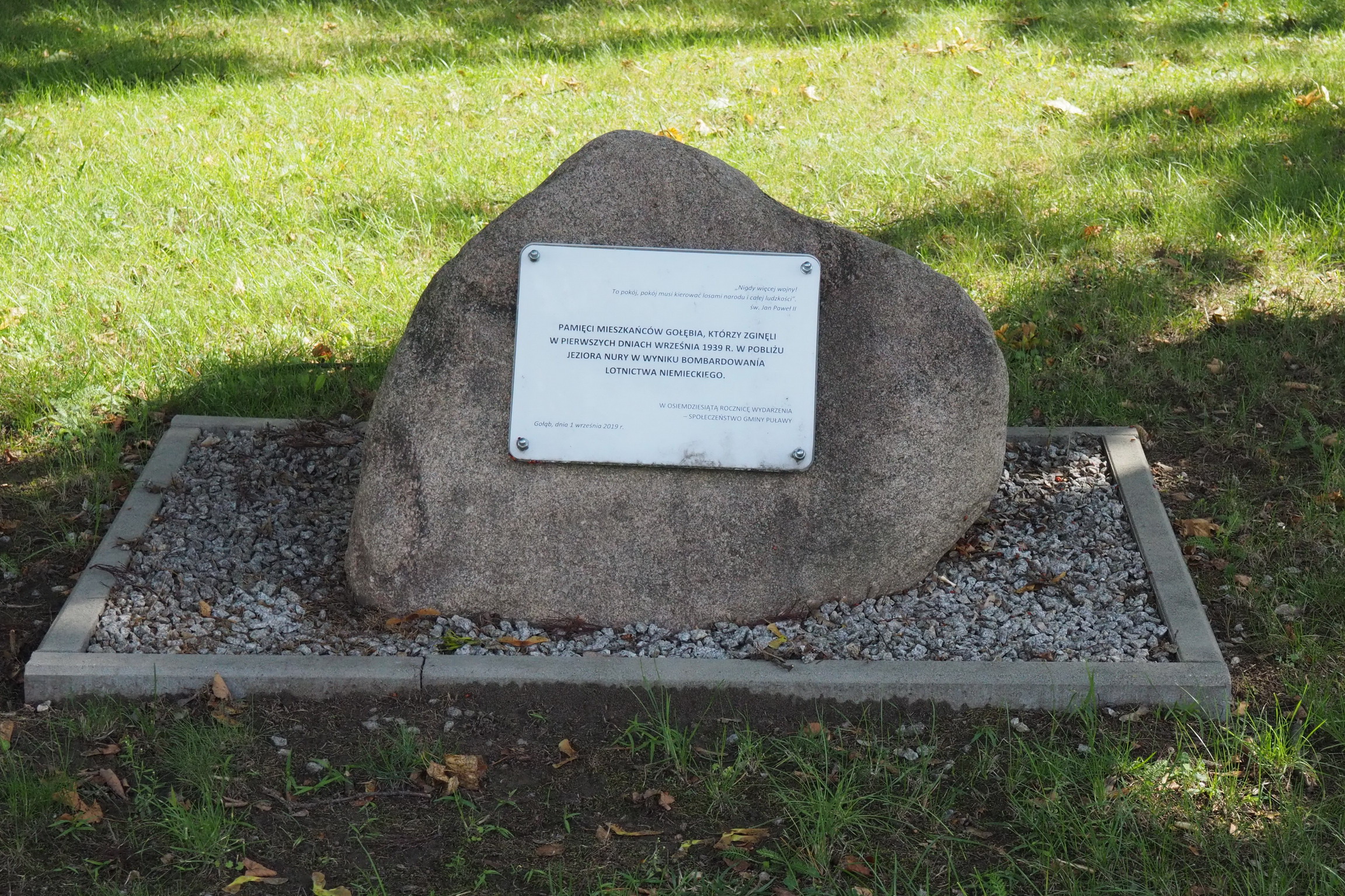Dzień 1 września 1939 r. to dzień tragiczny dla Polski. Dzień wybuchu II wojny światowej. Jednymi z pierwszych ofiar tej tragedii byli mieszkańcy Gołębia. 2 września podczas bombardowania lotniska przez niemieckie samoloty nad jeziorem Nury zginęło 13 osób, głównie kobiet. Był to piękny słoneczny dzień. W tym czasie kobiety robiły prania w jeziorze. Porozkładały do suszenia świeżo upraną pościel, chodniki. To właśnie było przyczyną ich śmierci,