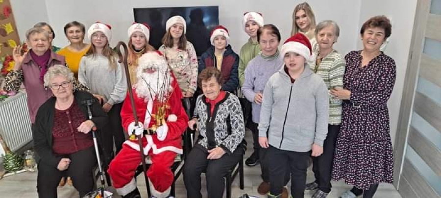 Dnia 5 grudnia zawitał w Dziennym Domu Seniora. Nasze kochane seniorki recytowały Mikołajowi wiersze, śpiewały piosenki, a nawet tańczyły oberka. Wszystkie zostały suto obdarowane prezentami. 6 grudnia kolejna niespodzianka. Tym razem niespodziewana wizyta Mikołaja na próbie tańców zespołu „Gęsawa”. Na początek rozdawał cukierki, pytając czy wszyscy byli grzeczni, ale rózgę też wręczył, żebyśmy „pokusy nie mieli”.
