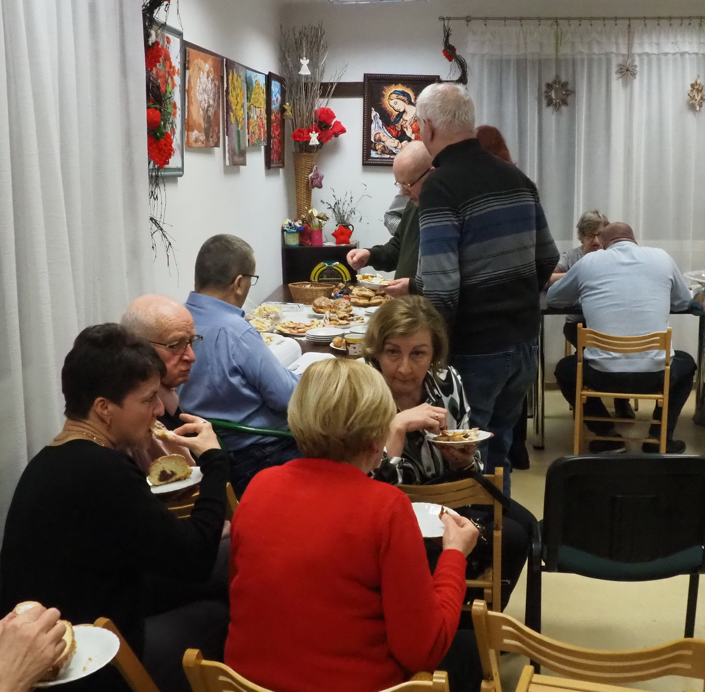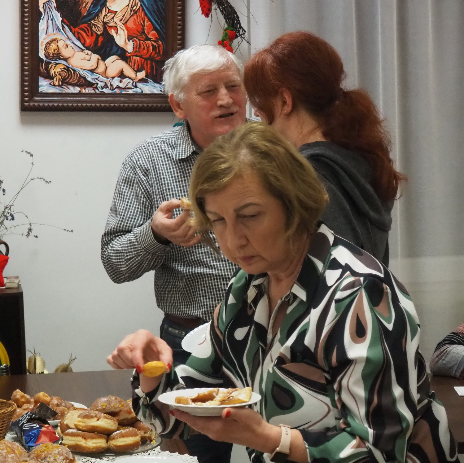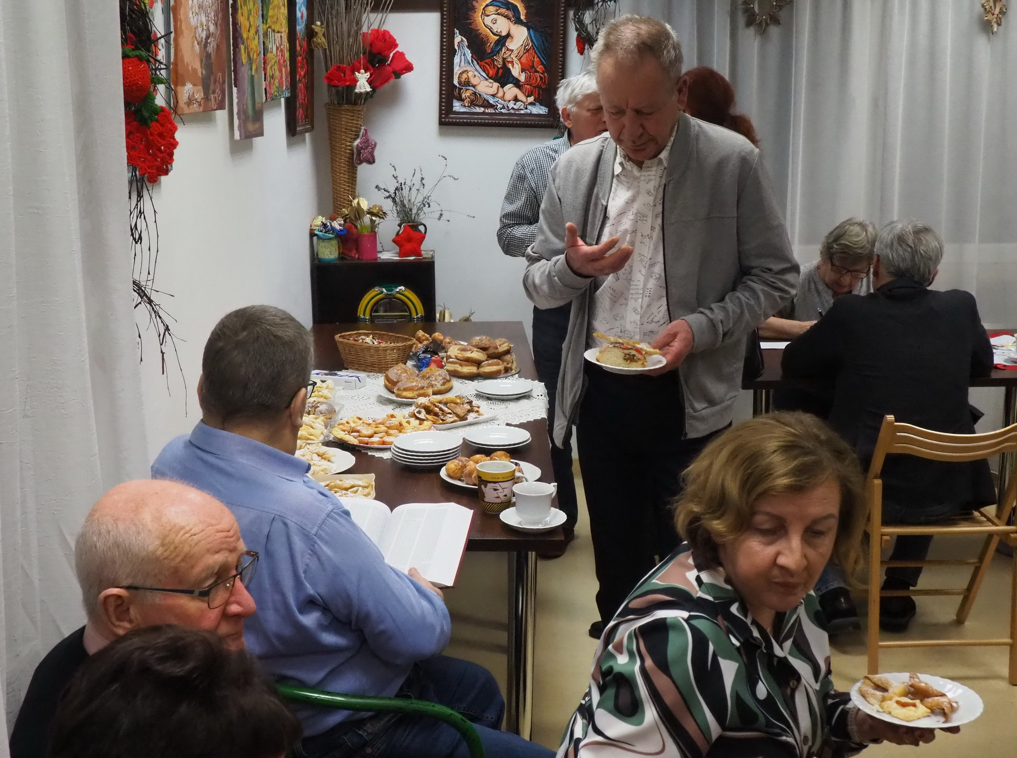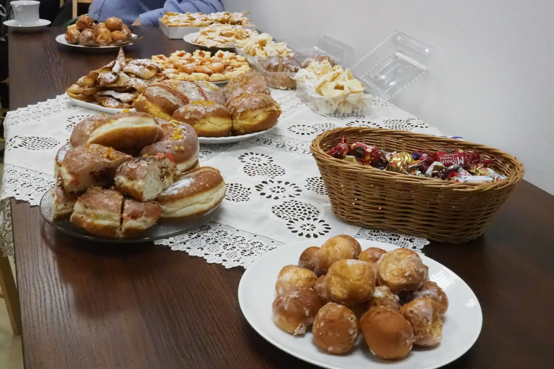 Aktualnie nie ma już tych zwyczajów. Teraz na stołach i u właśnie nas królowały pączki, faworki, inne ciasta i cukierki. Oczywiście był kawa, herbata. Rozmowom i śpiewom nie było końca. Jak zwykle grał Pan Jerzy Jabłonka. Było bardzo słodko, miło i przyjemnie.